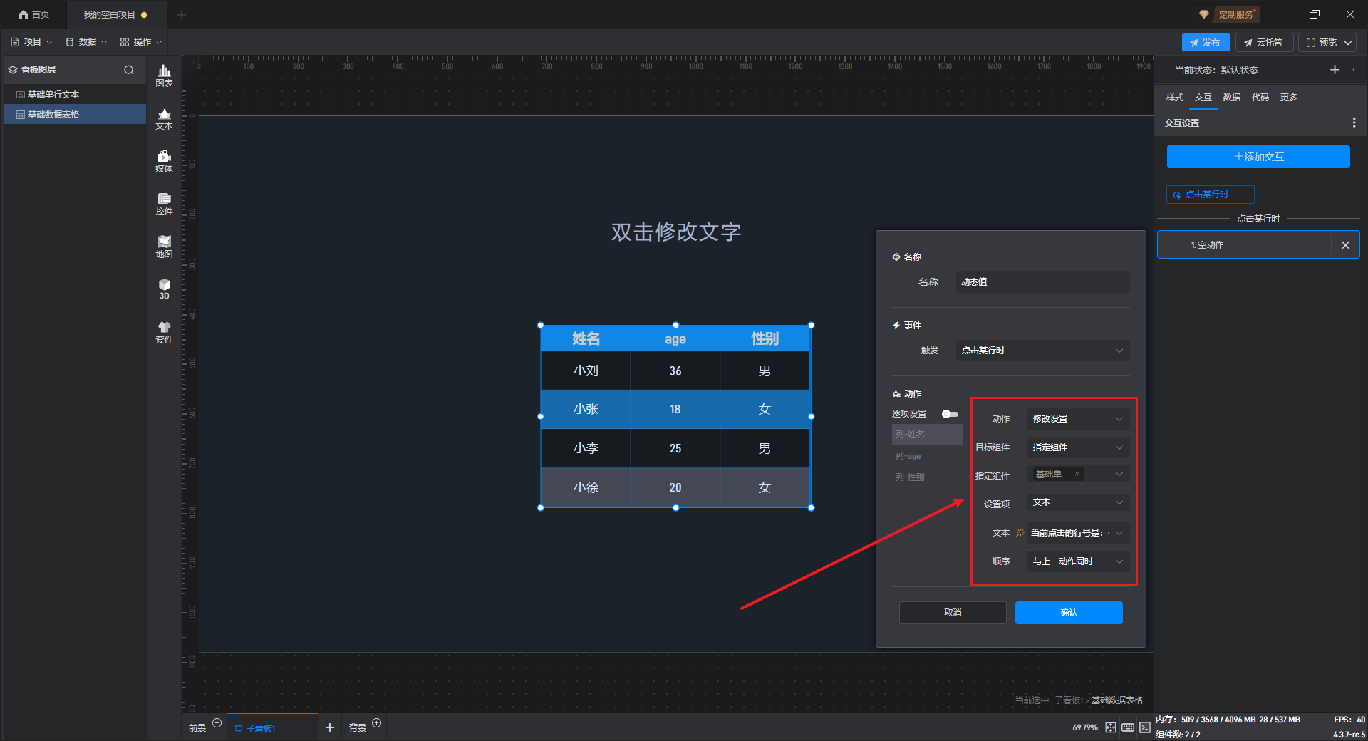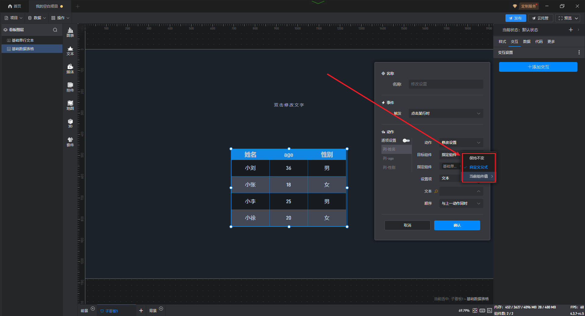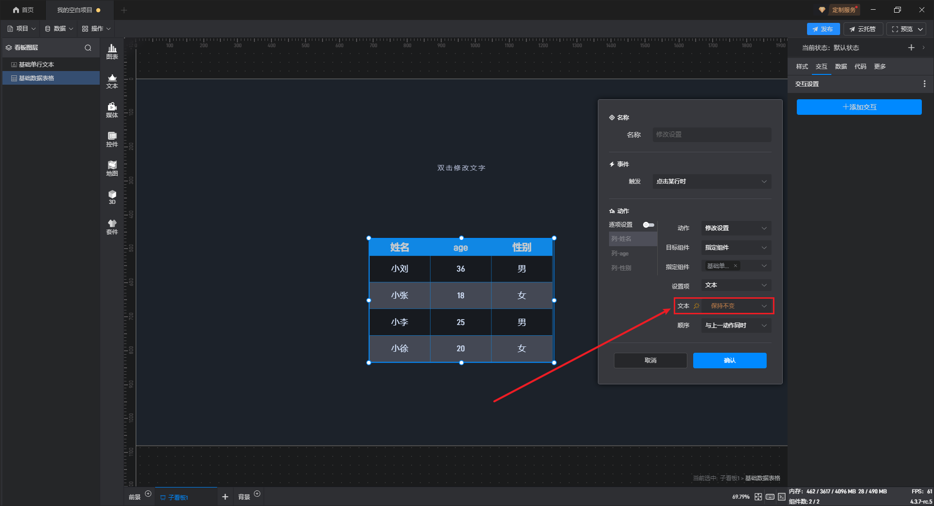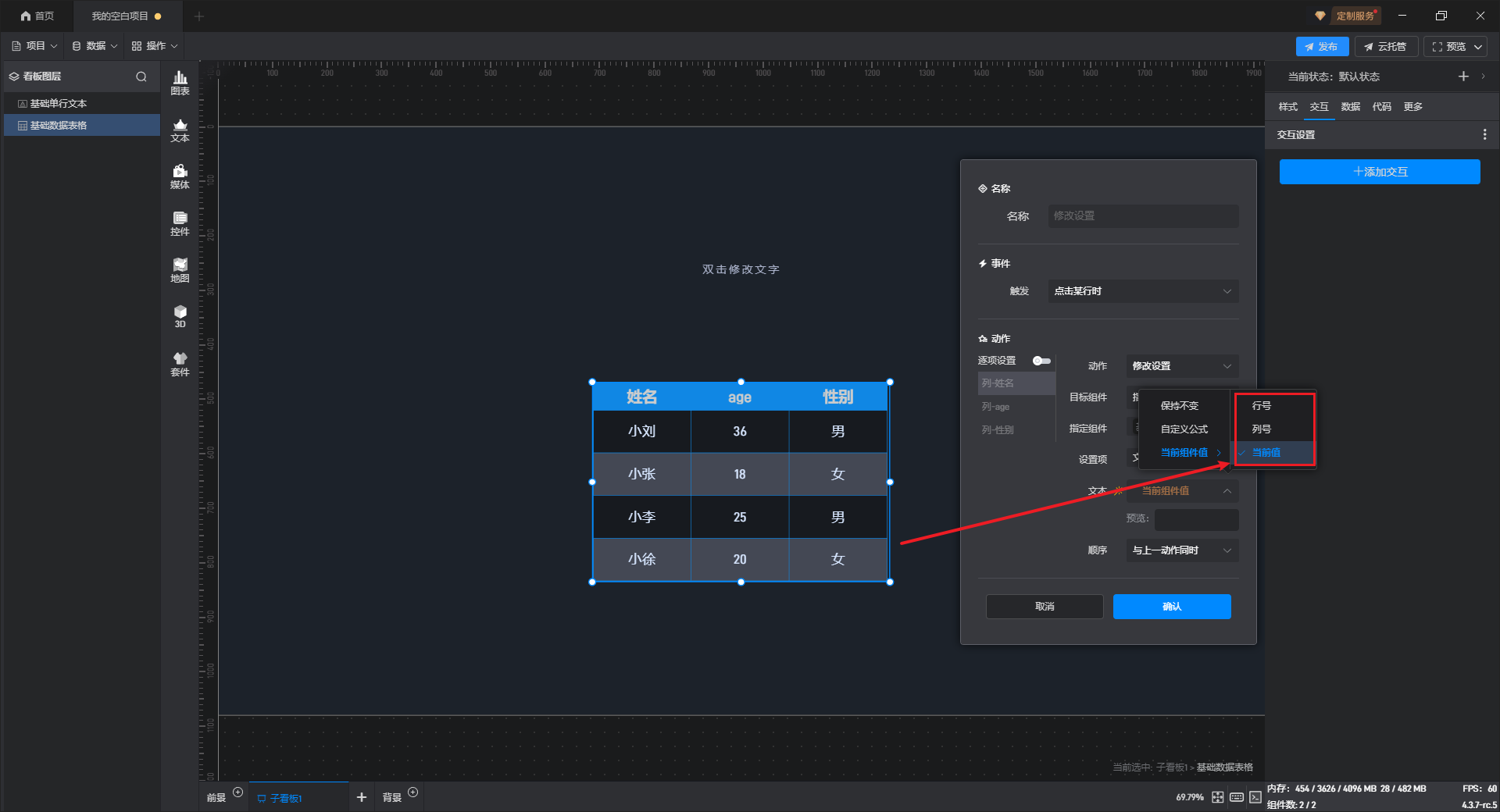 首先我们选中需要操作的组件,给它添加一个交互,这里以基础数据表格为例。只有当交互触发后修改的内容有内容时,我们才可以设置动态值传递。