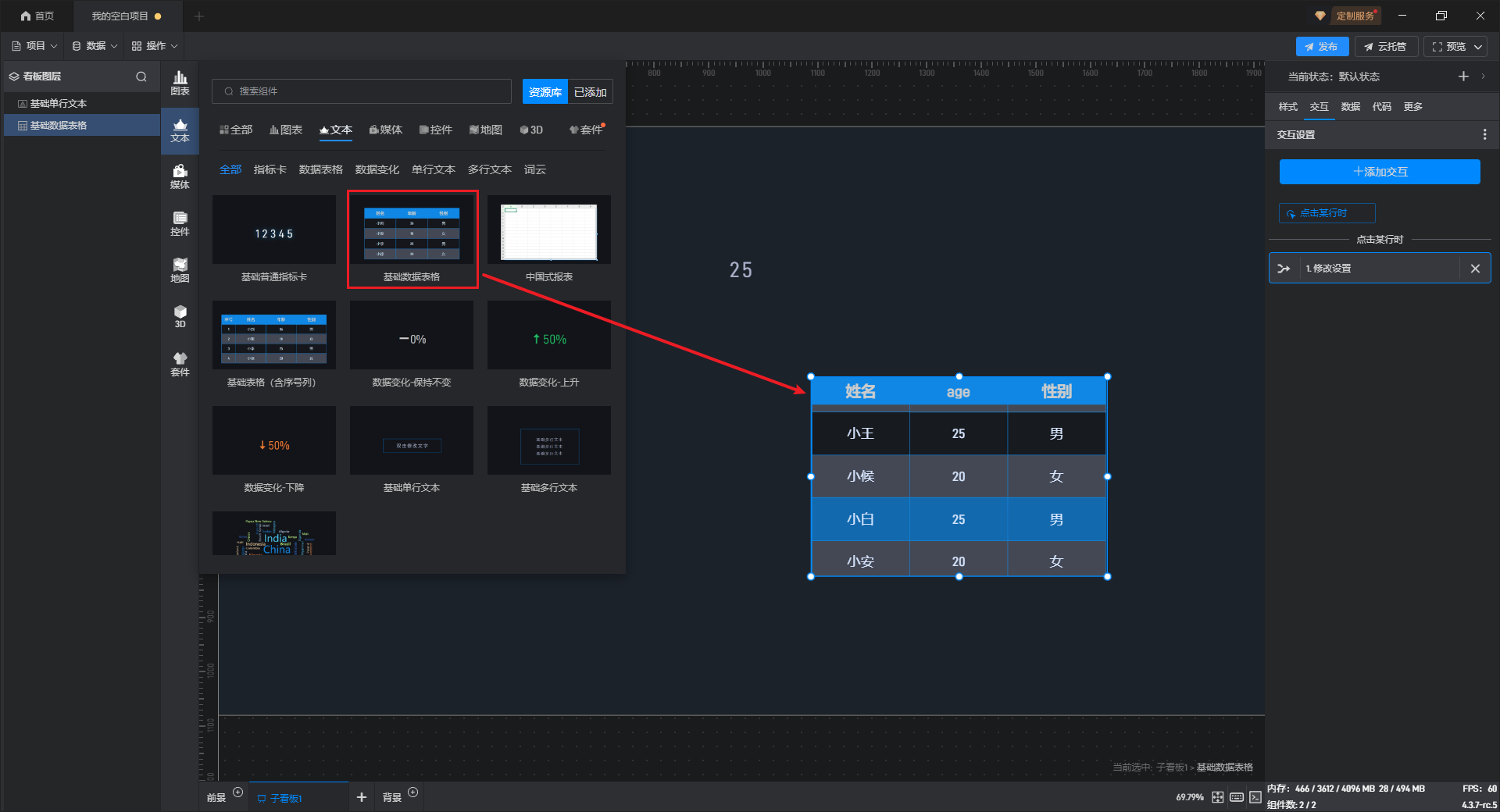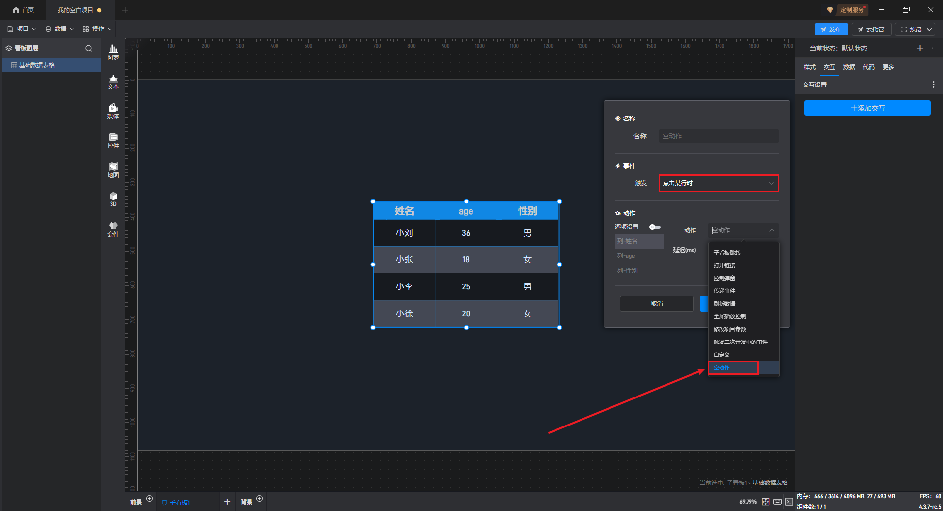 点击选中“基础数据表格”组件,在右侧的交互中点击“+添加交互”按钮添加一个新的交互。