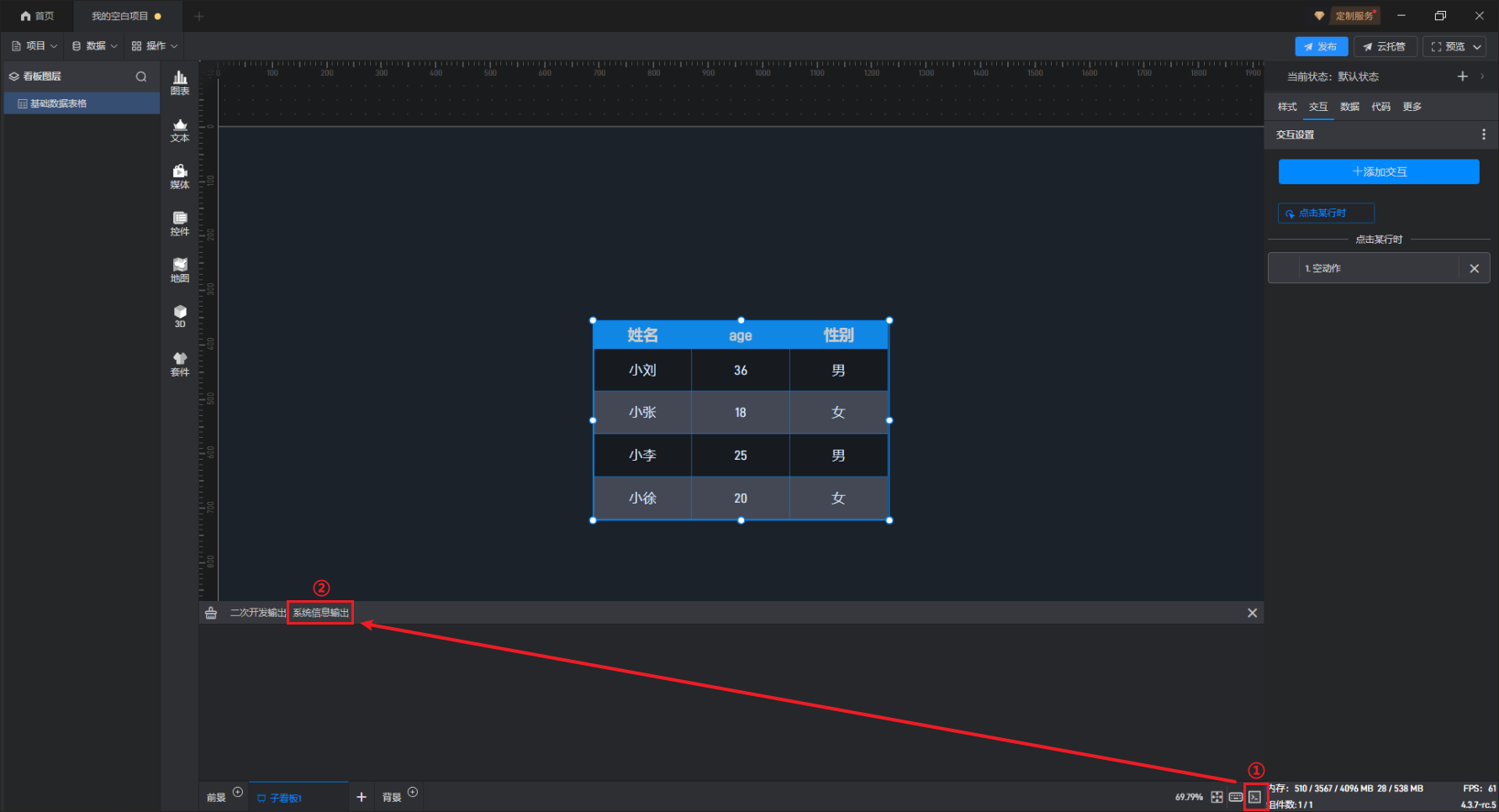 成功添加交互后,我们打开“调试面板”,切换到“系统信息输出”,如下图所示: