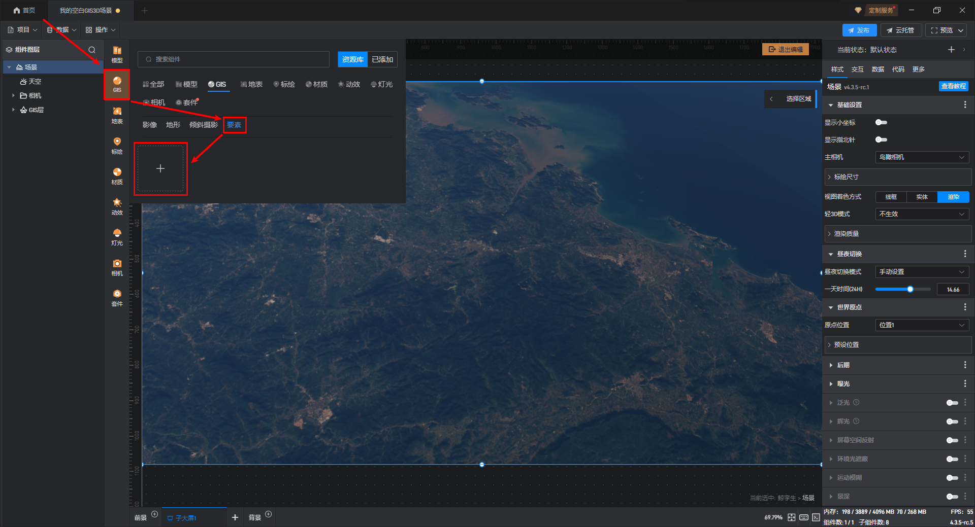 首先点击工具栏中的“GIS”,选择“要素”,然后点击“+”按钮即可导入要素。