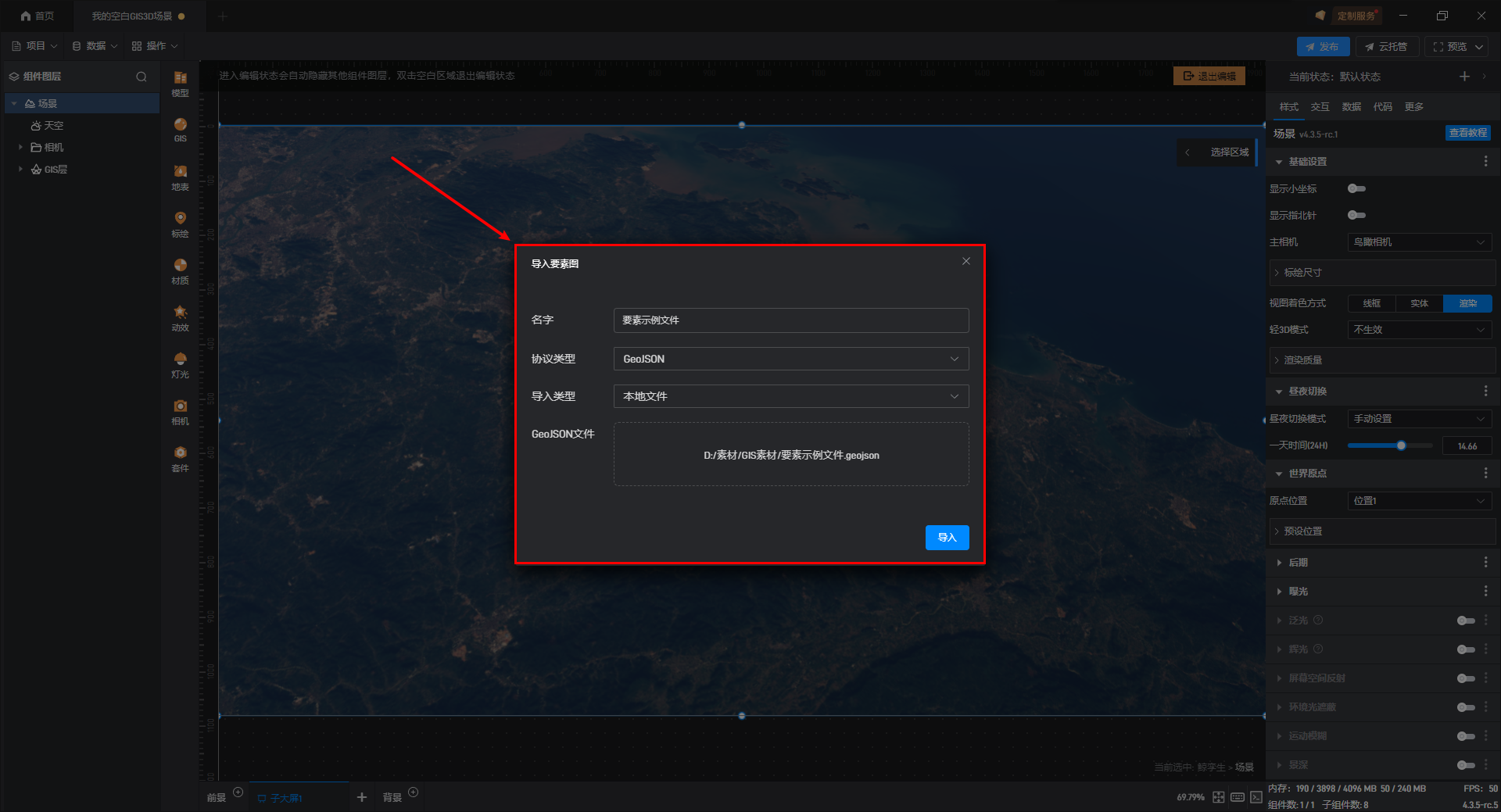 导入要素支持“GeoJSON”、“WFS”、“Shp”三种协议类型,这里以 GeoJSON 文件为例。
