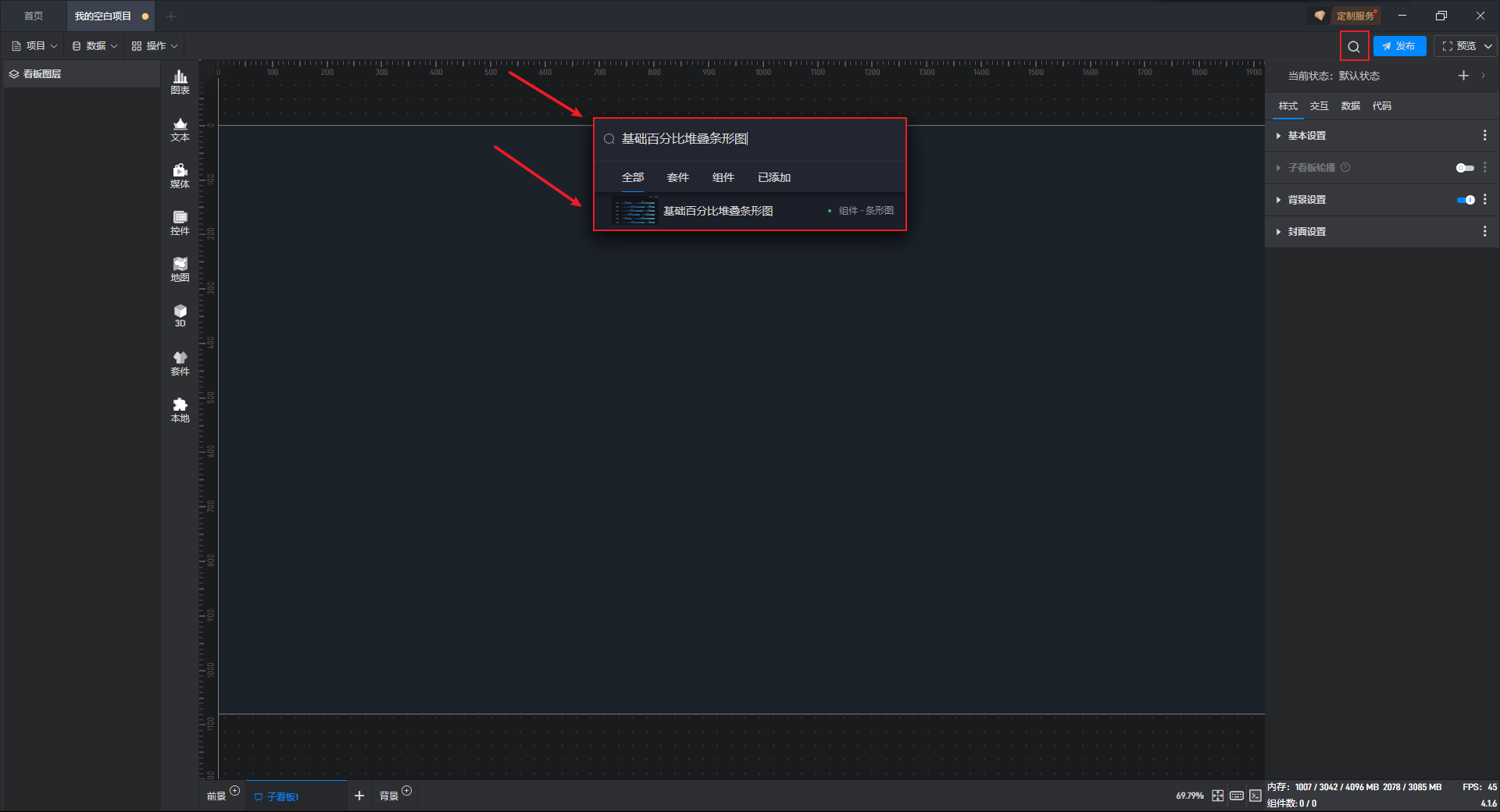 点击搜索按钮或按键盘Ctrl+F打开搜索框,输入组件名称进行搜索,然后点击对应的组件进行添加。