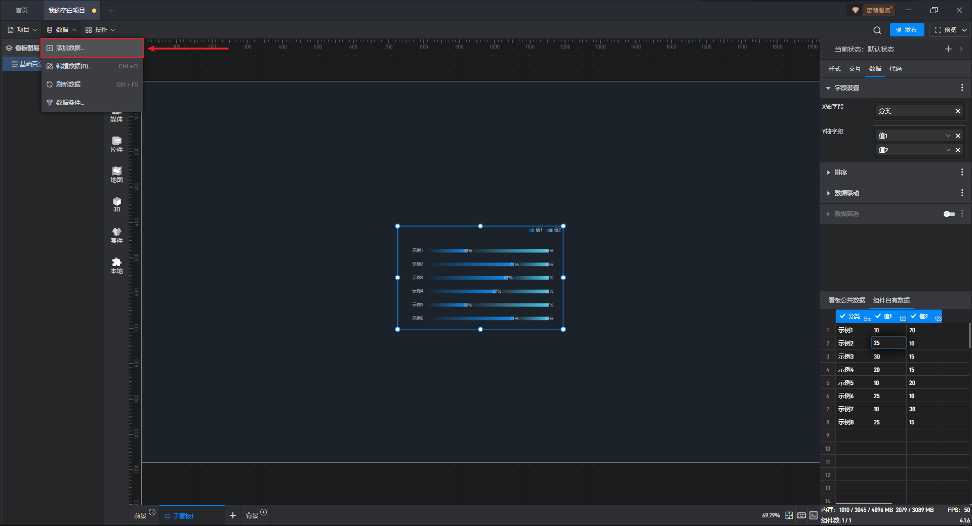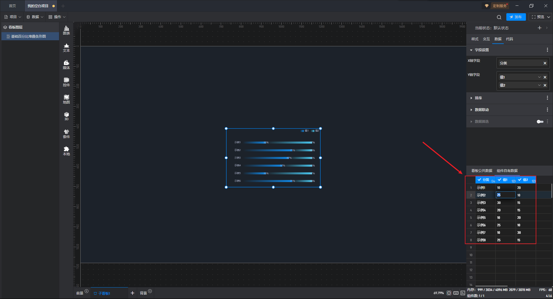 在“数据”设置界面下方可以直接修改数据,组件中的数据也会实时更新。
