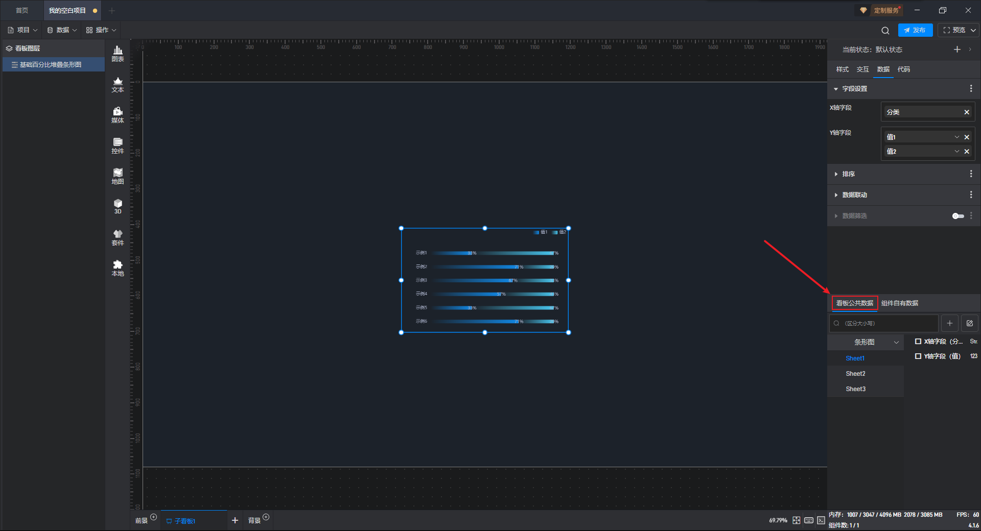 点击选中组件,在右侧“数据”设置窗口中切换到“看板公共数据”(同一个项目中所有数据源是共享的)。