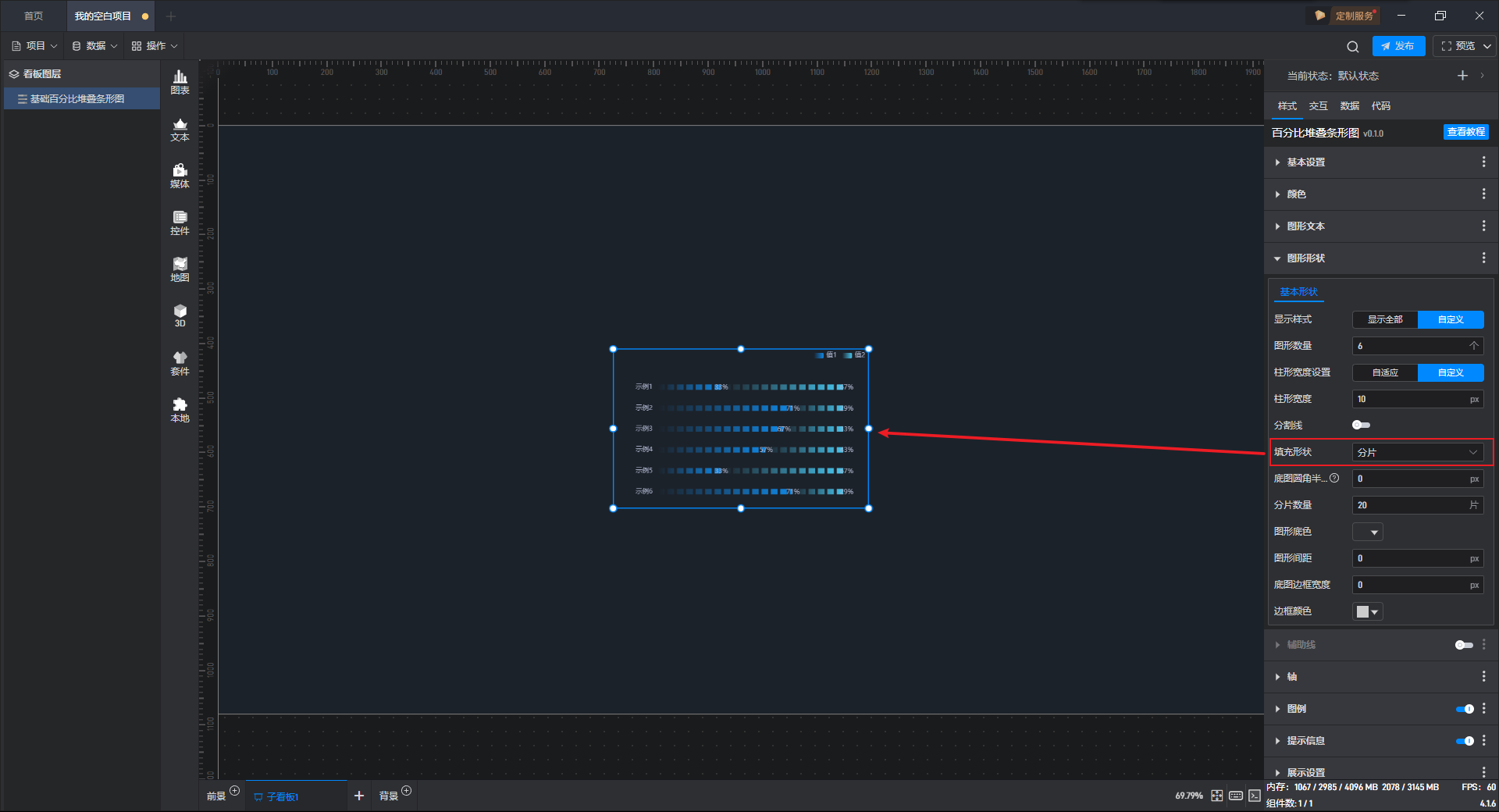 基础百分比堆叠条形图是堆叠条形图组件的一种预设样式,预设的样式主要包括组件自有数据、图形形状、颜色和数量,但是本质上这种组件是堆叠条形图。