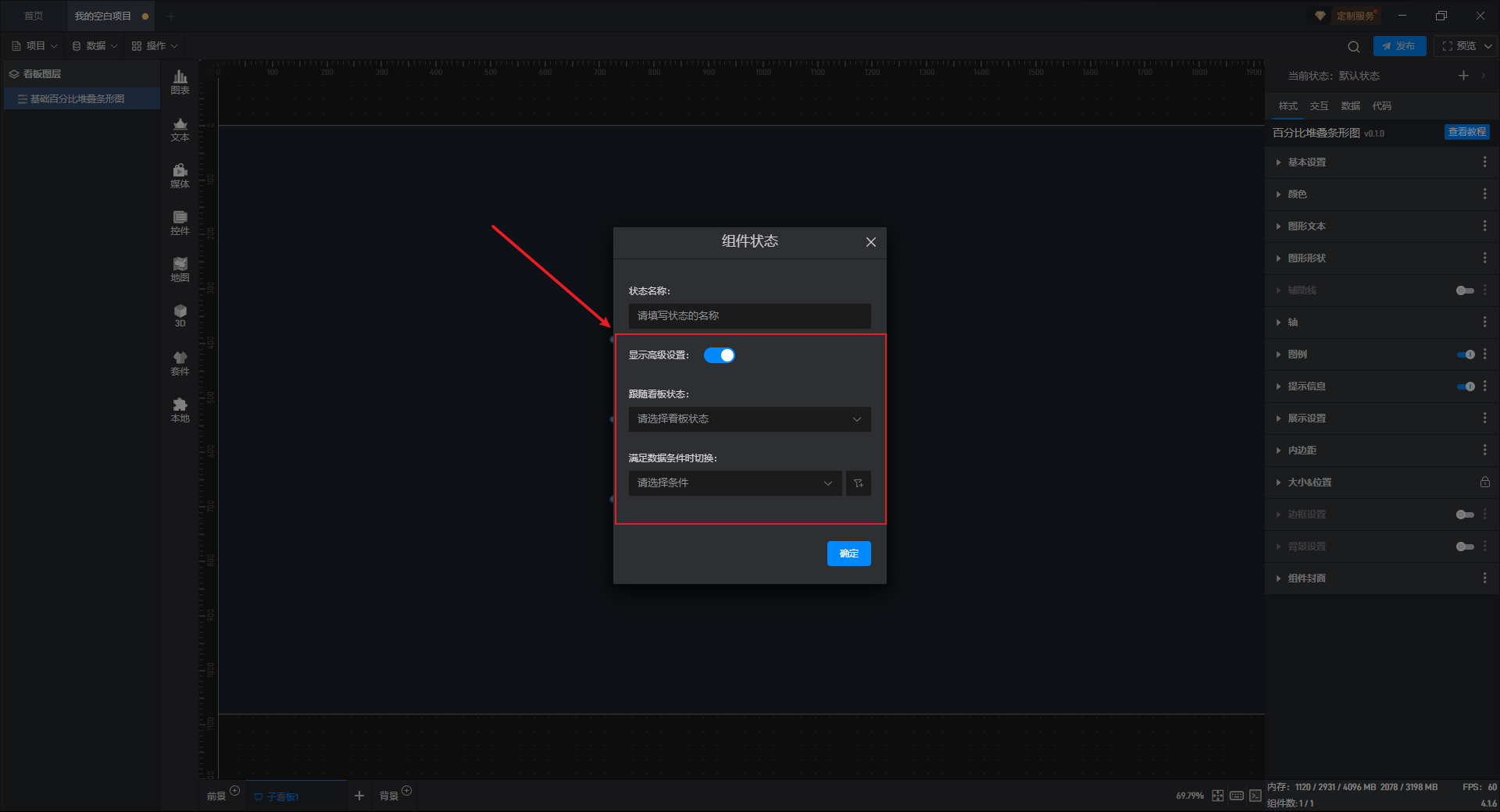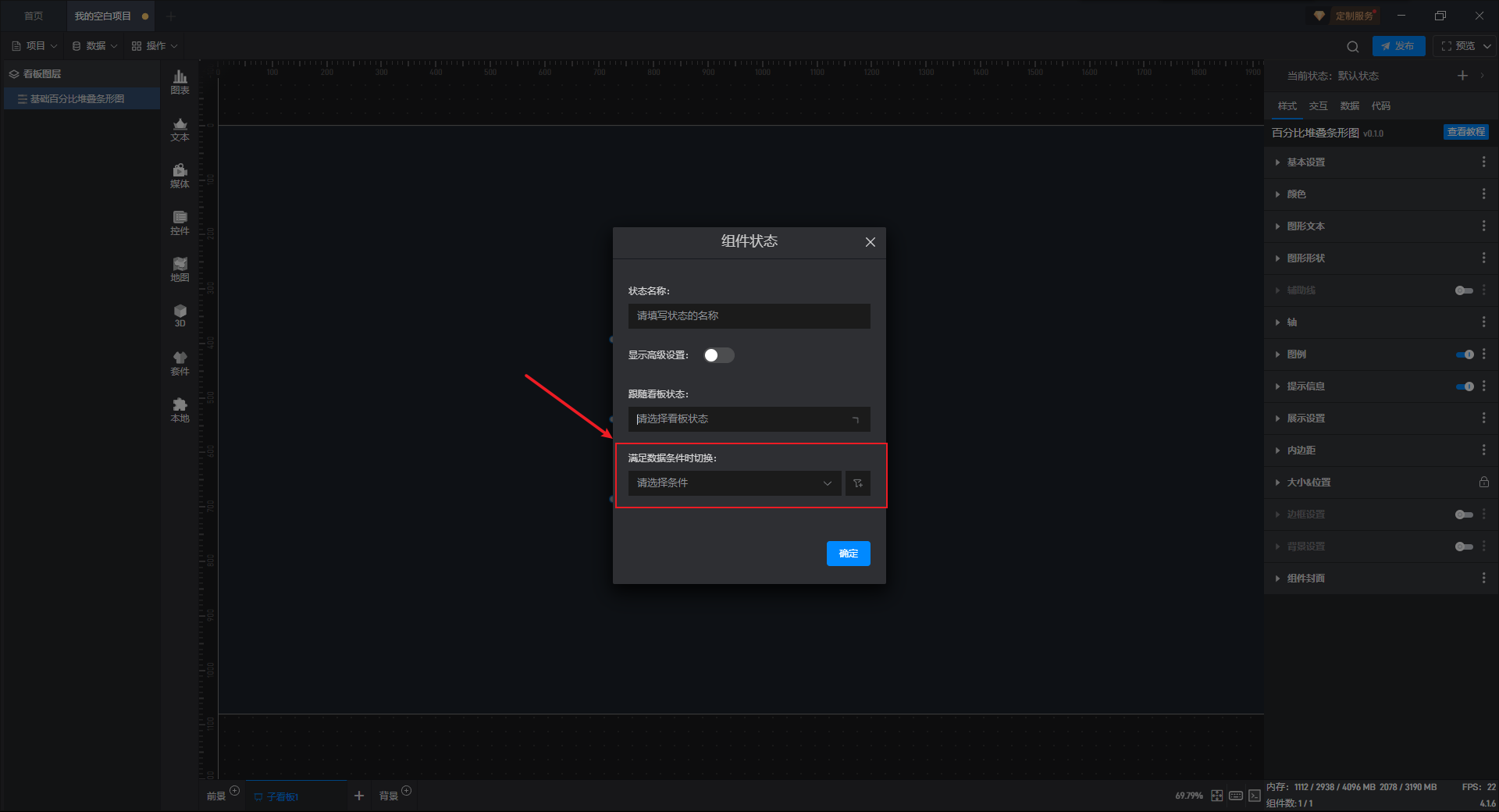 多状态主要用于通过数据条件或是点击交互(通常是点击其他组件来触发本组件的状态切换)来切换组件设置项的场景,这里的设置项包括组件的样式、交互、数据和代码。