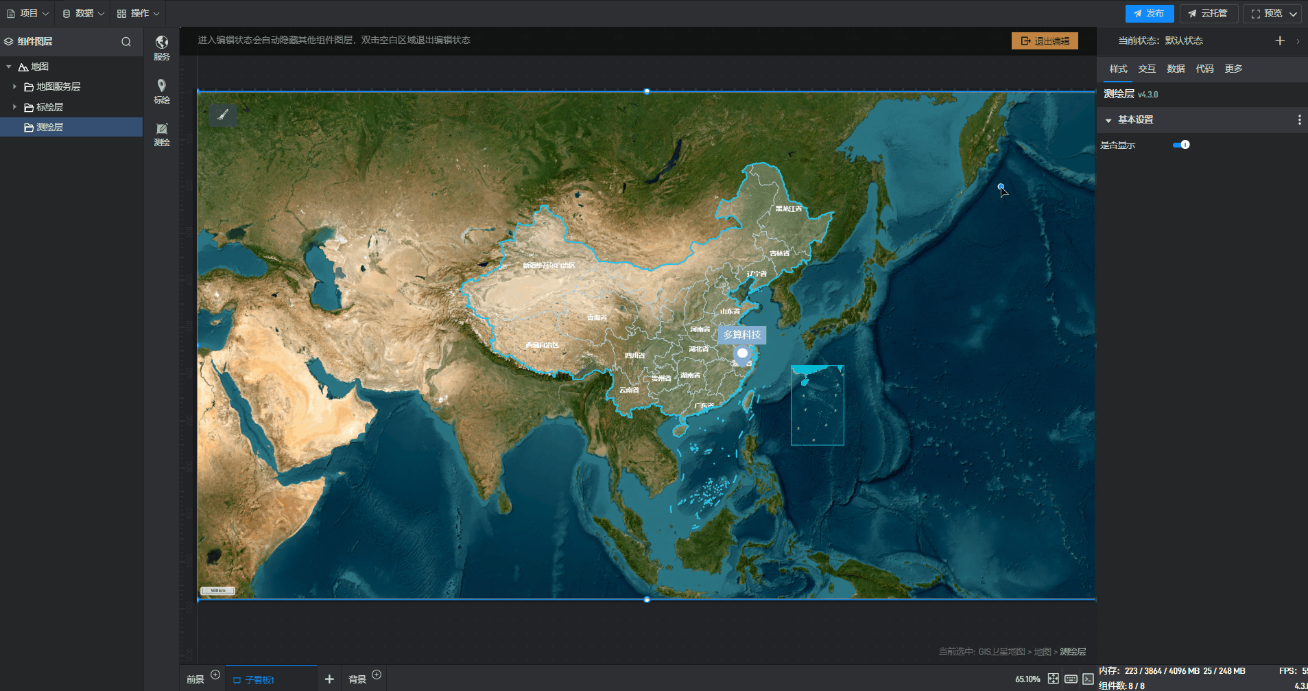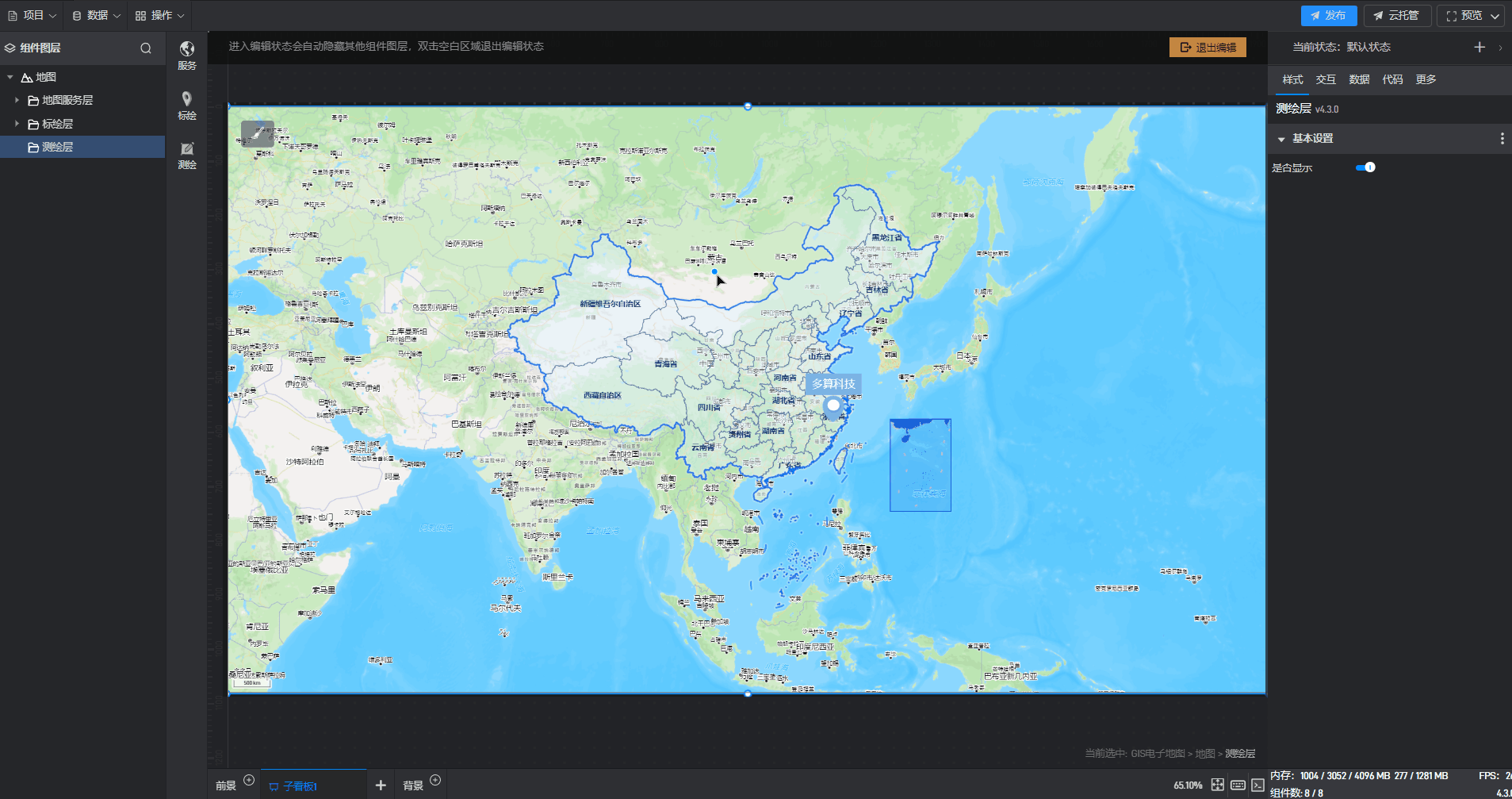 1. 创建项目后,在资源库中的“地图”分类中找到GIS 电子地图、GIS 卫星地图、GIS 地图样式这三个组件,它们都是鲸地图的一种预设样式,任意选择其中一个添加即可。