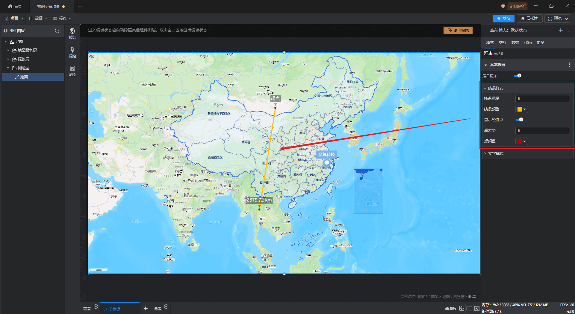 在鲸地图中不仅可以测量两点之间的距离,还可以测量多个点距离起点的距离。
