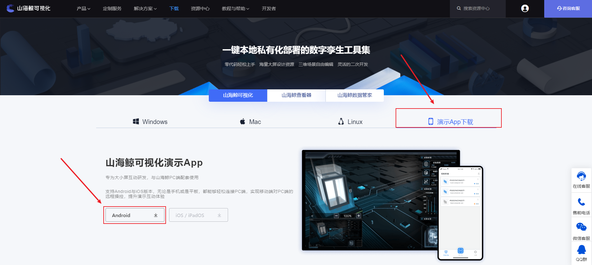 在山海鲸可视化官网的下载页面,我们可以下到演示 App 并进行安装(暂时只支持 Android 版本)。