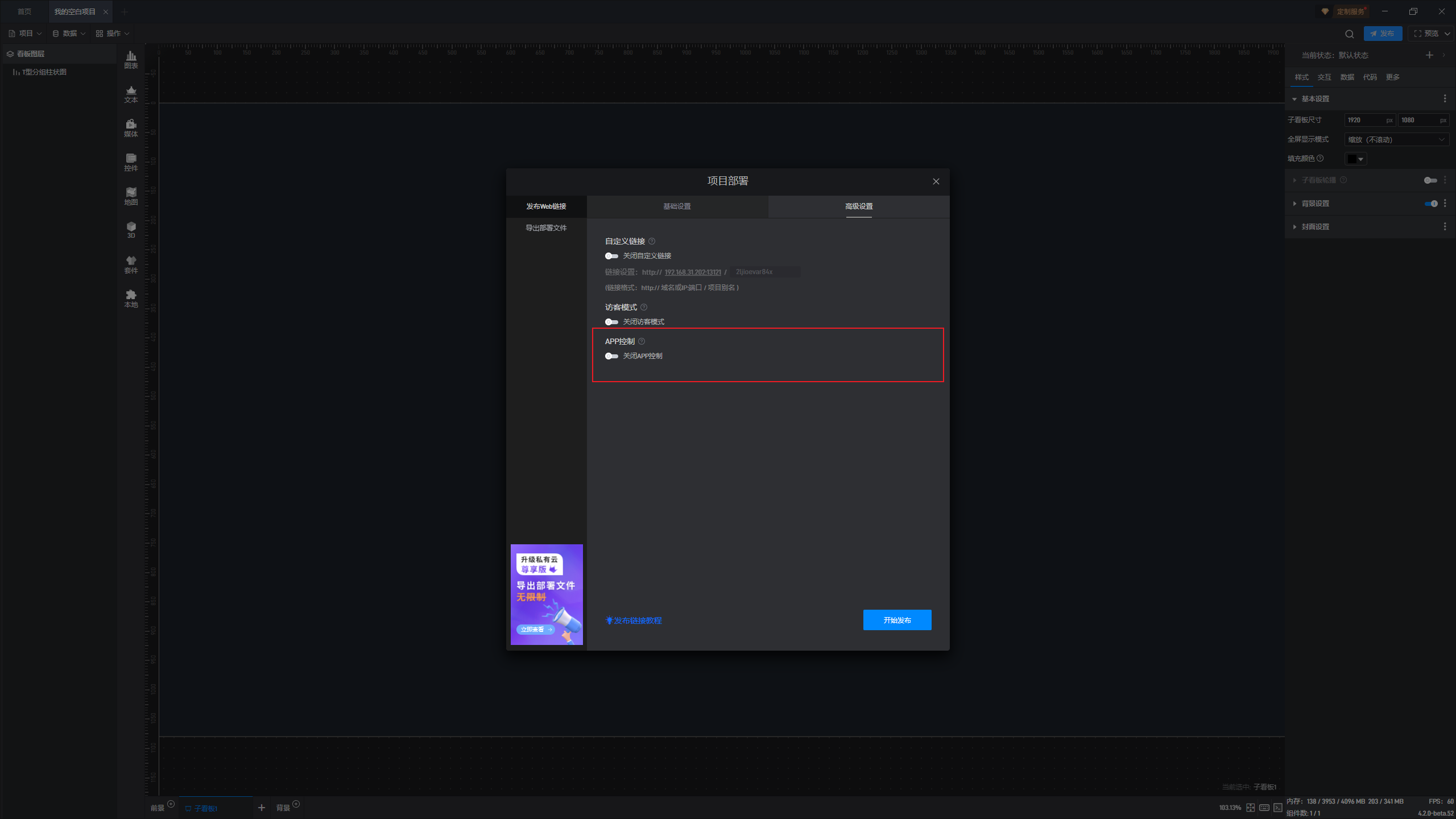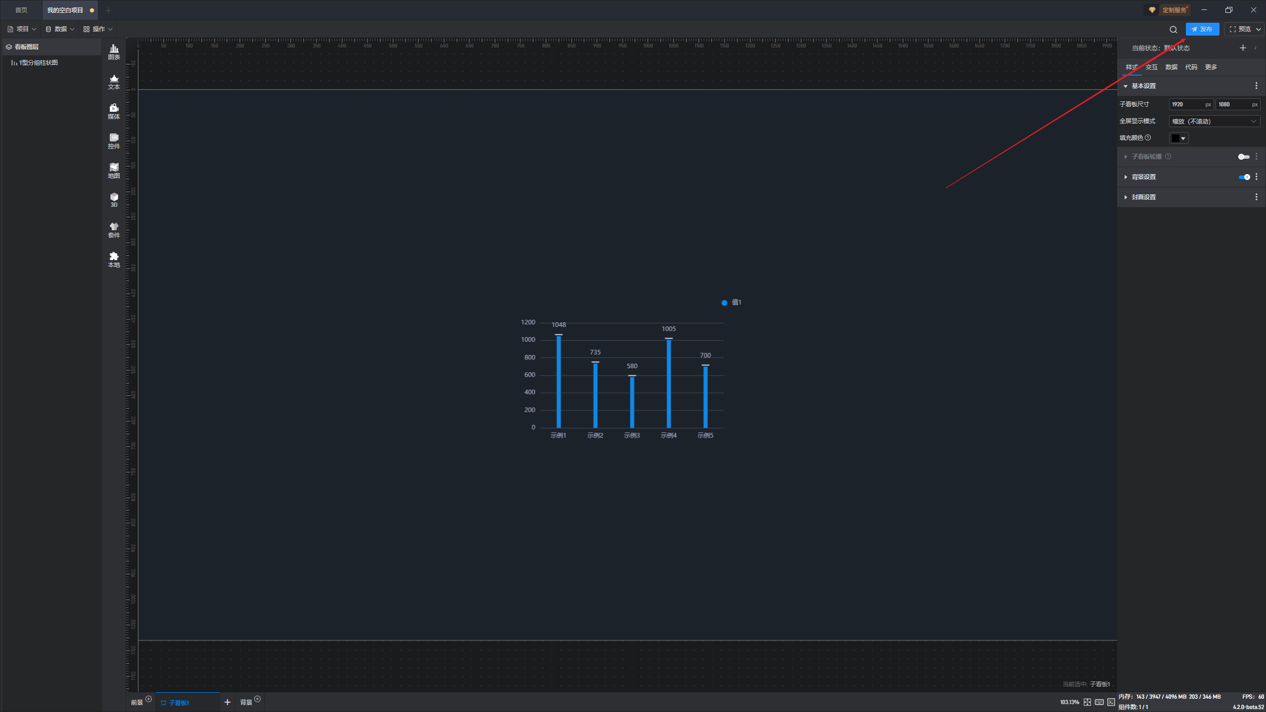 项目需要先发布然后才能进行演示控制,我们可以在编辑大屏界面点击“发布”。(关于项目发布的详细教程可以参考这里 →_→项目发布)