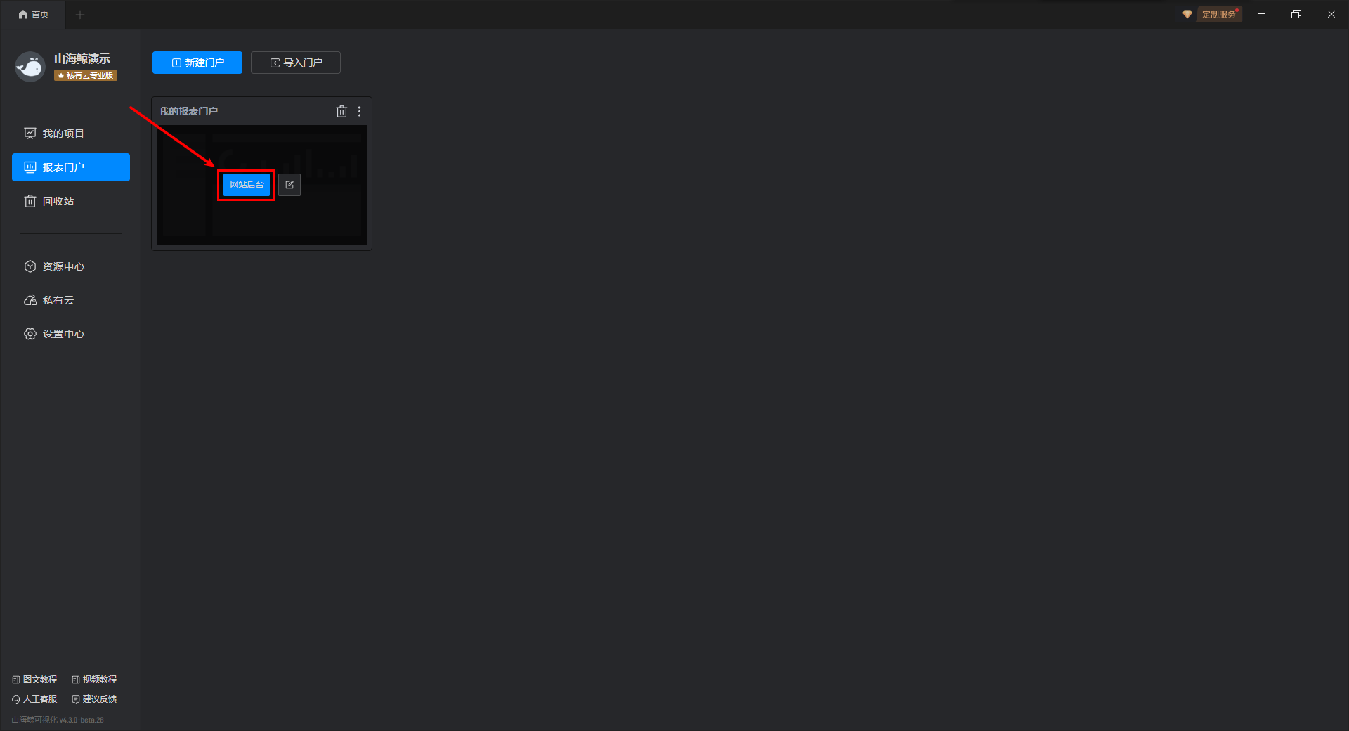 将鼠标移动到门户上,左侧的按钮用来进入网站后台,我们可以在网站后台中进行报表目录以及人员权限的管理。