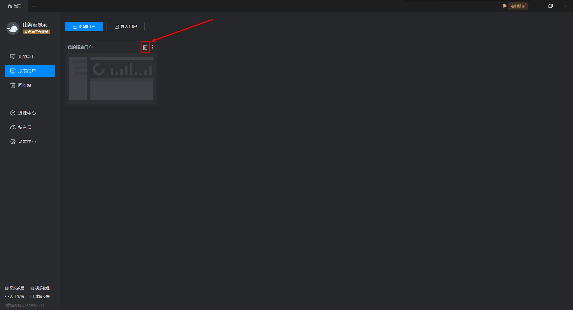 点击报表门户上的“删除”按钮,可以删除该报表门户,被删除的报表门户会保留在回收站中。