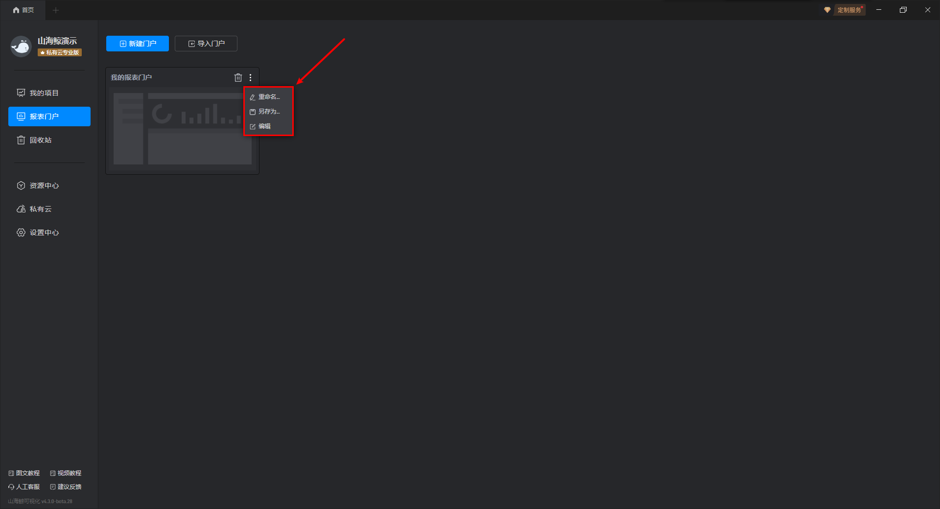 点击报表门户右上角的“编辑”按钮,可以看到“重命名”、“另存为”和“编辑”按钮。