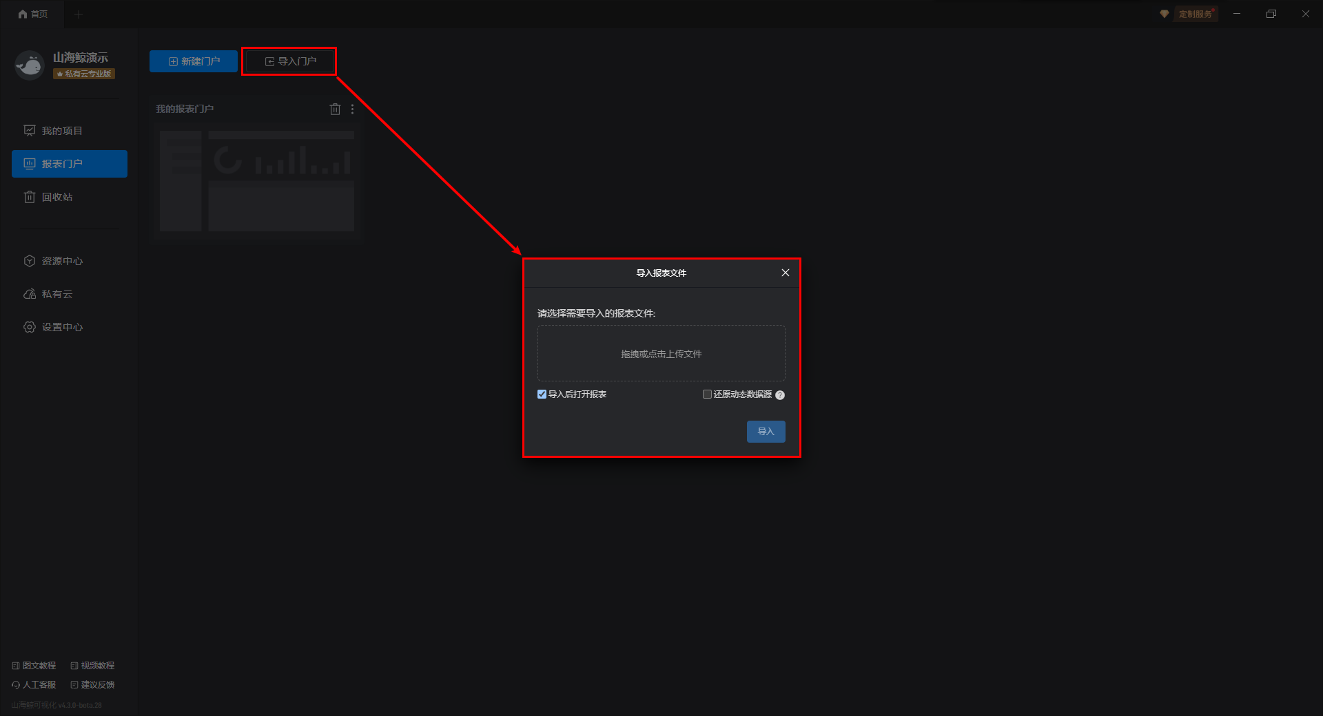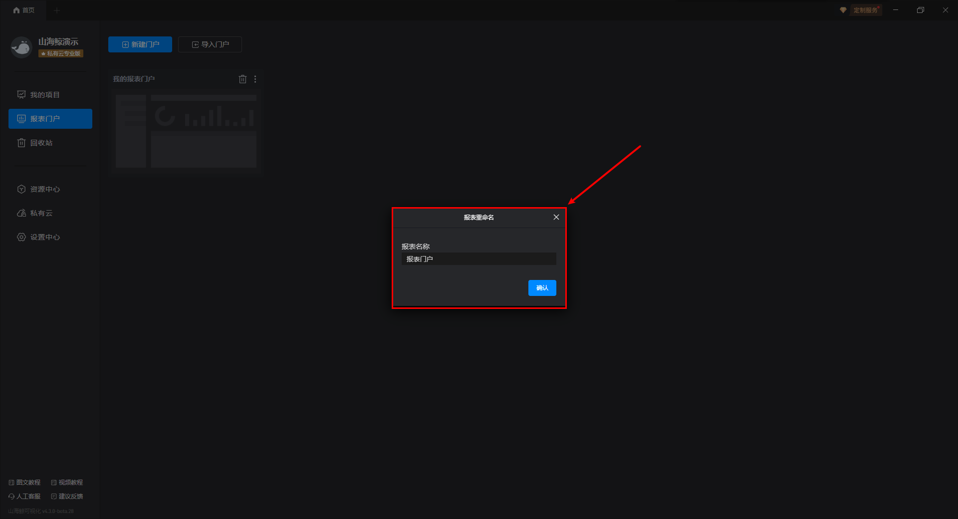 点击“新建门户”,能够创建一个新的报表门户,设置报表名称后点击“确认”,即可成功创建。