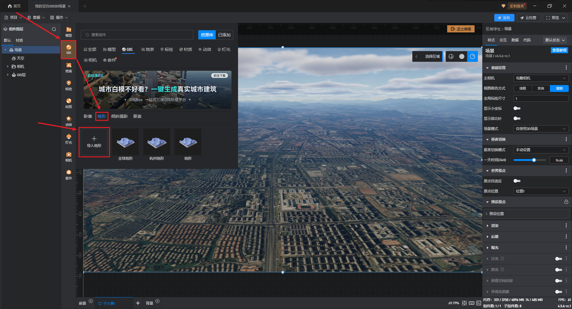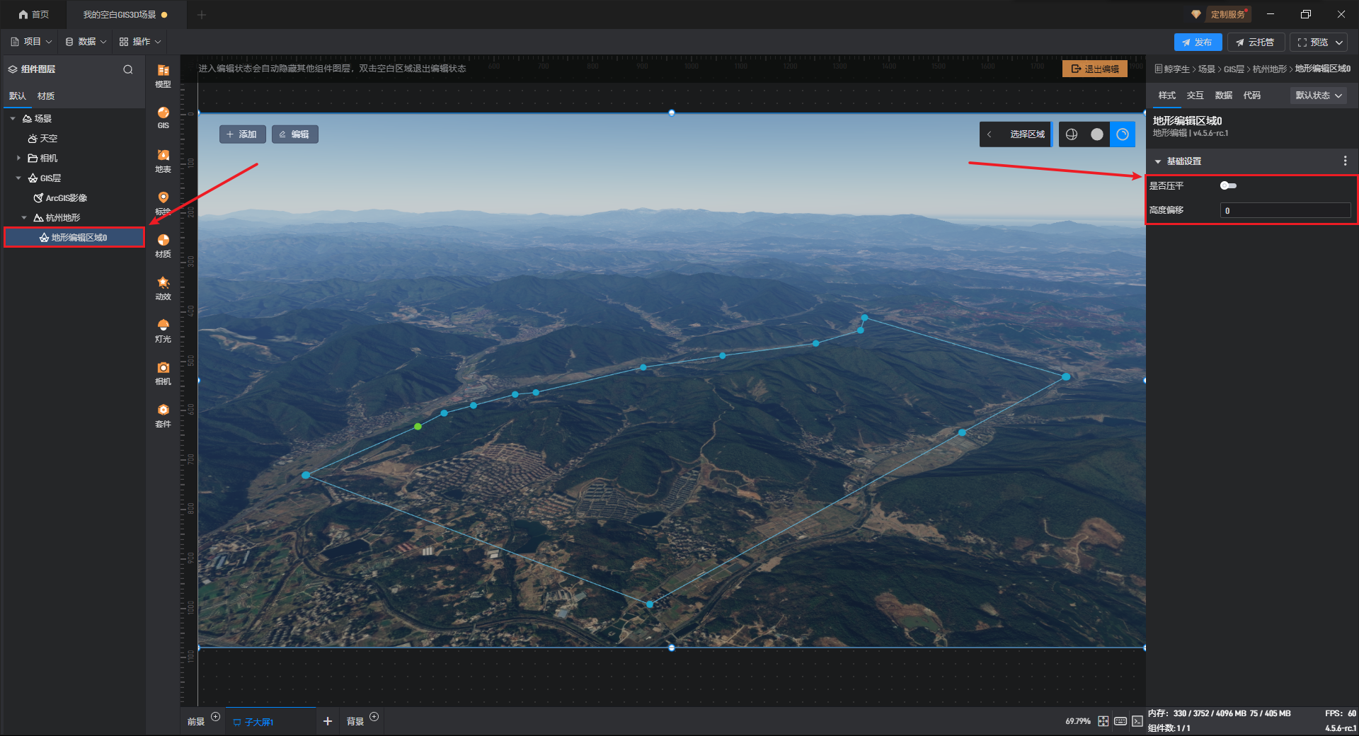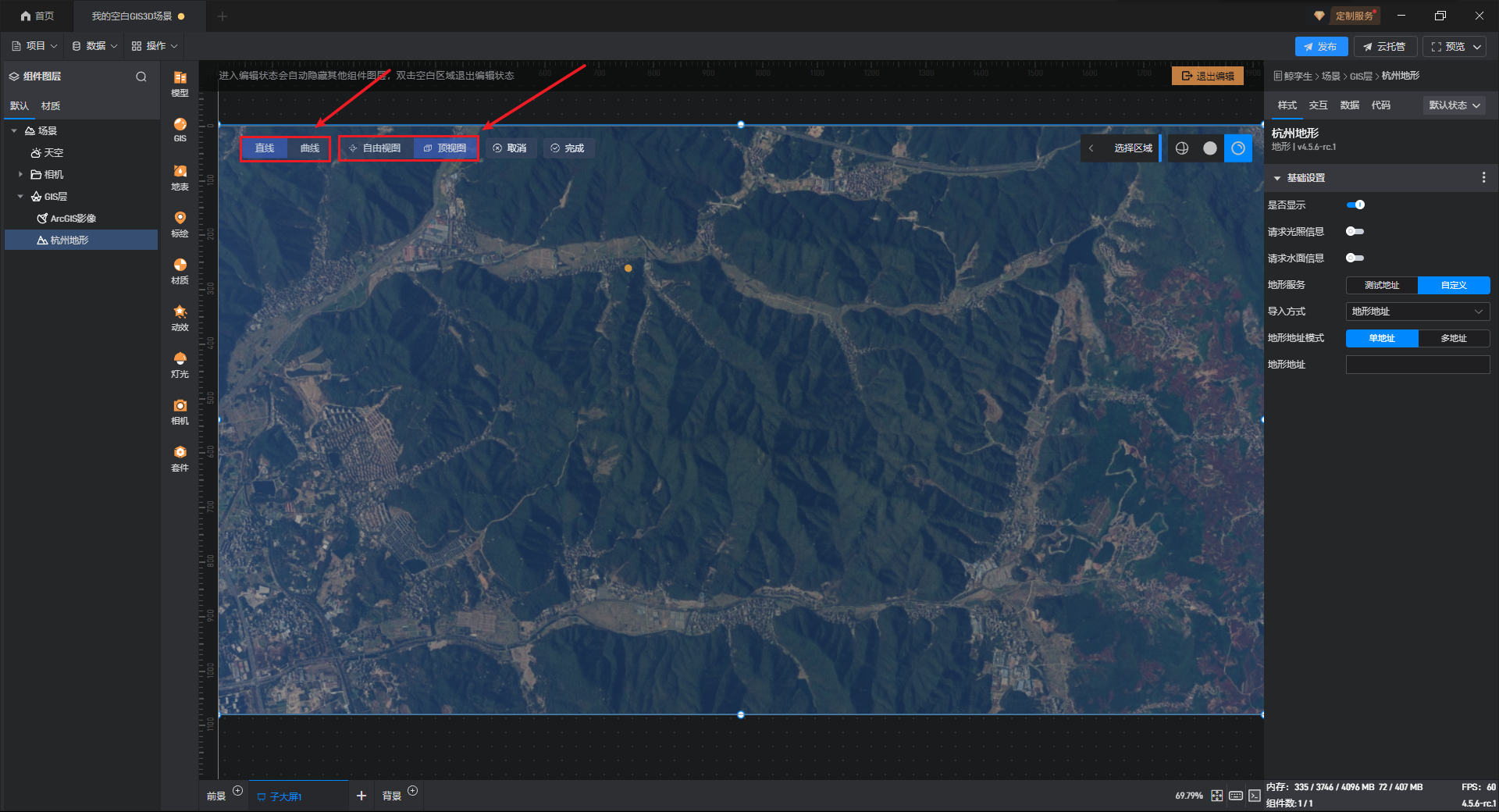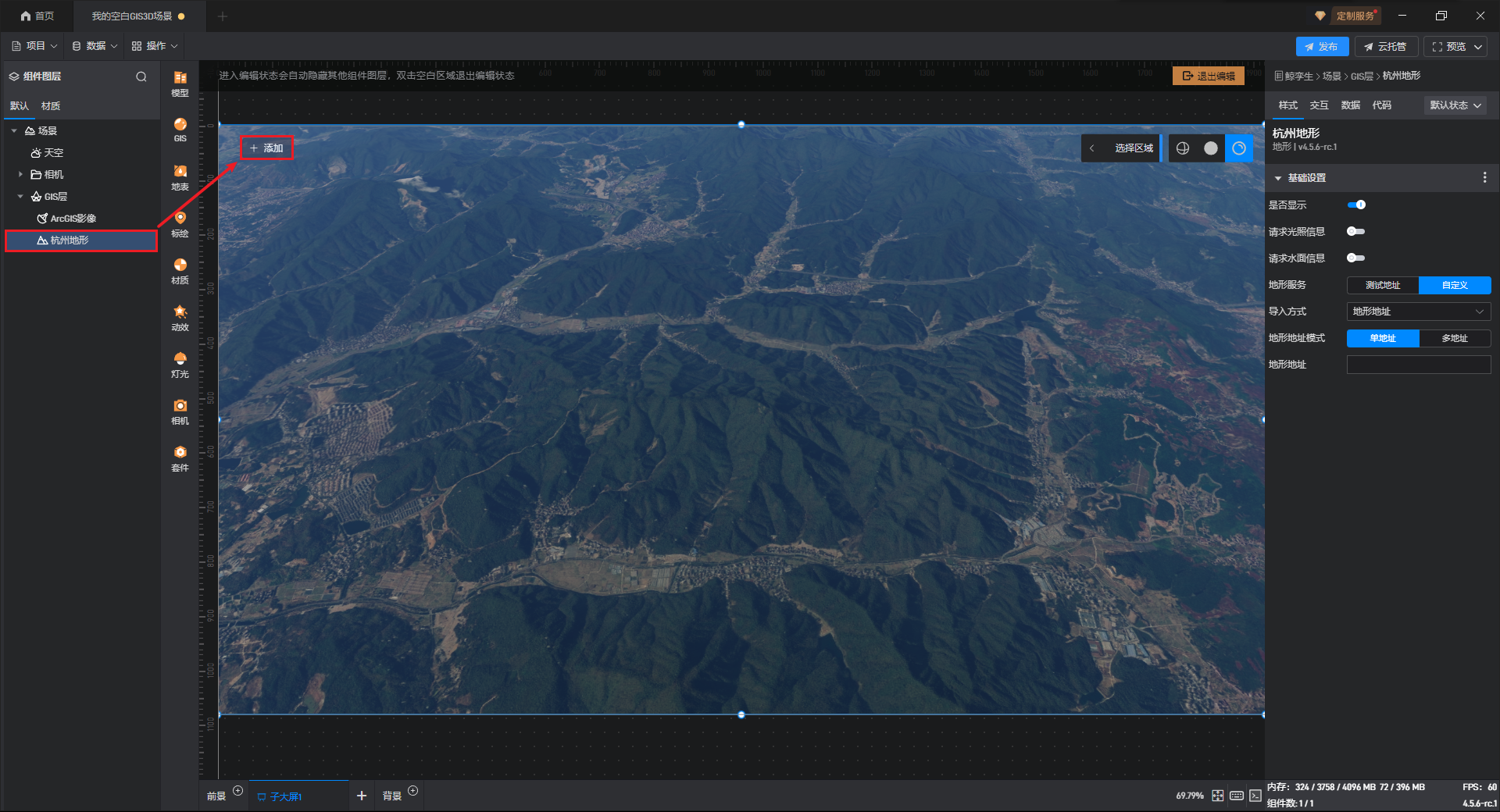 选中 GIS 地形图层,可以看到画面左上角的“添加”按钮,点击即可进入地形编辑。