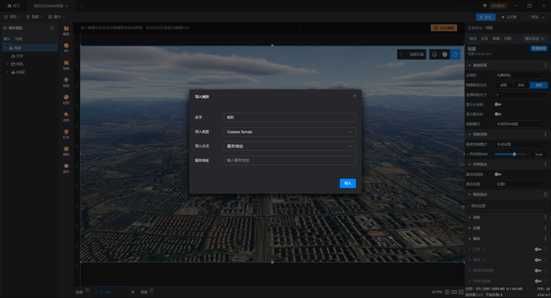 可在跳出的弹窗中导入 GIS 地形,GIS 地形目前支持“Cesium Terrain”格式和“ArcGIS Terrain”两种类型的地形,导入方式可以选择“服务地址”或“Assetld”导入。