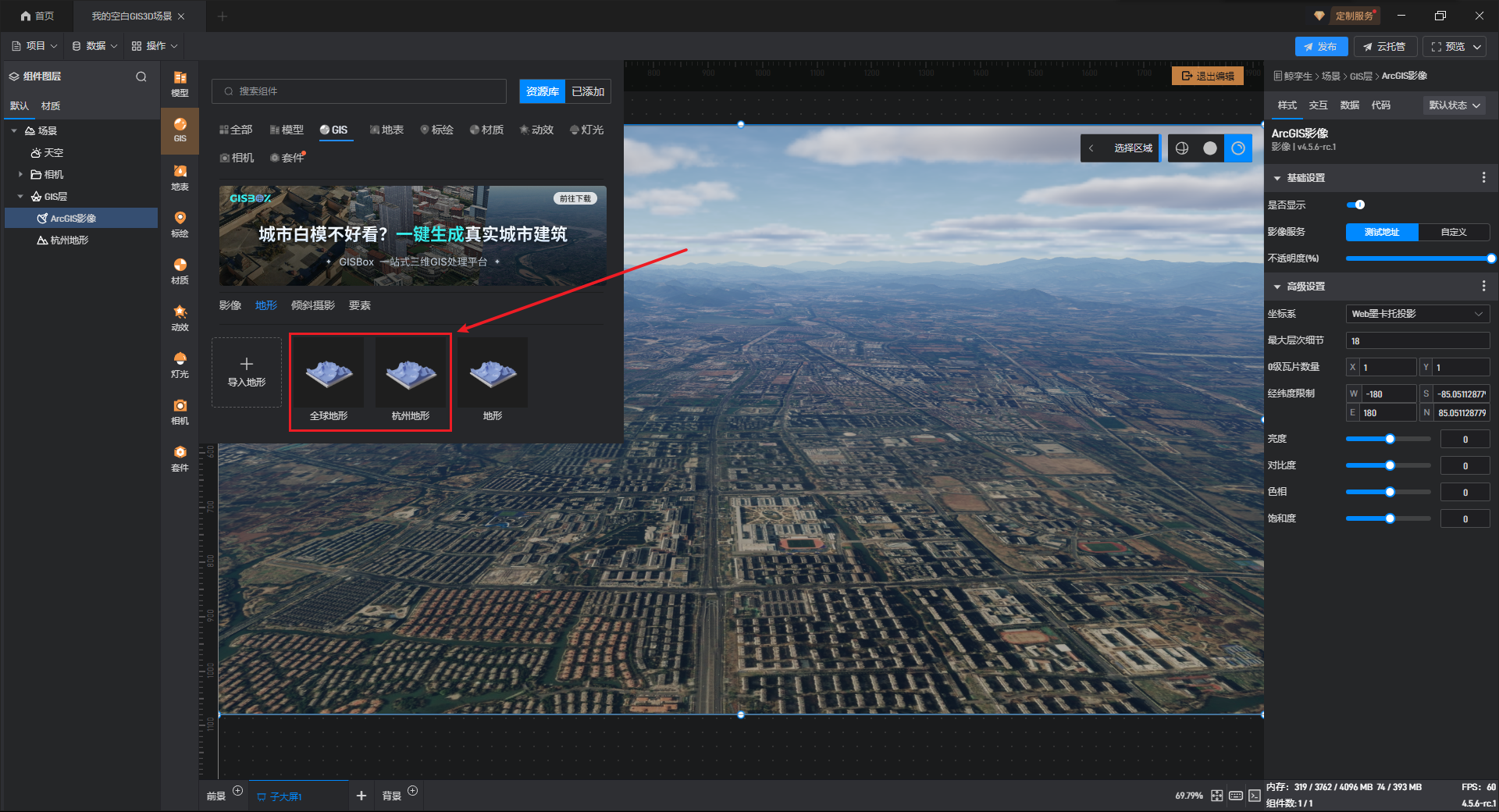 当然我们也提供了预置的两个地形数据,分别是:“全球地形”和“杭州地形”。