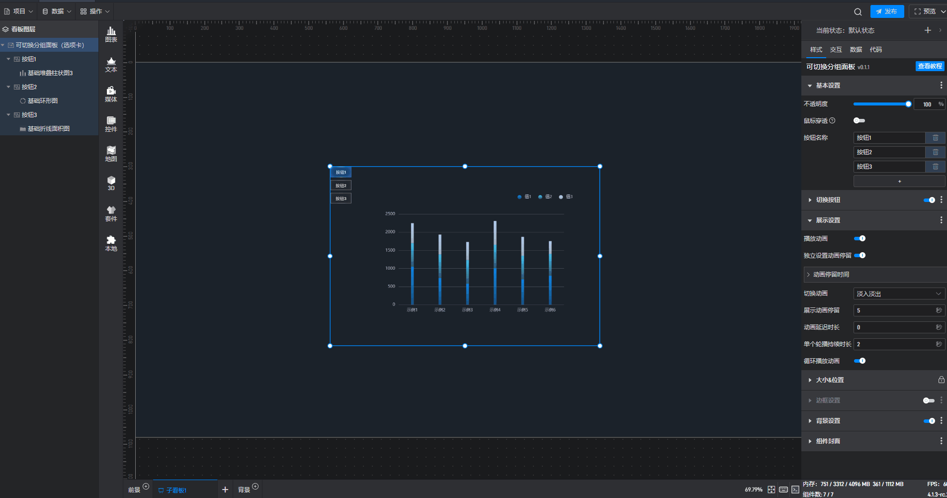 播放动画 | 默认关闭,开启后可设置面板中组件或数据展示动画。 |