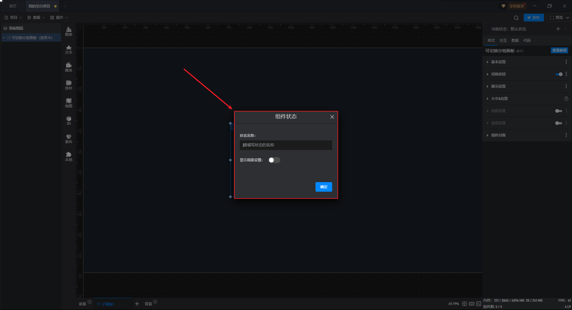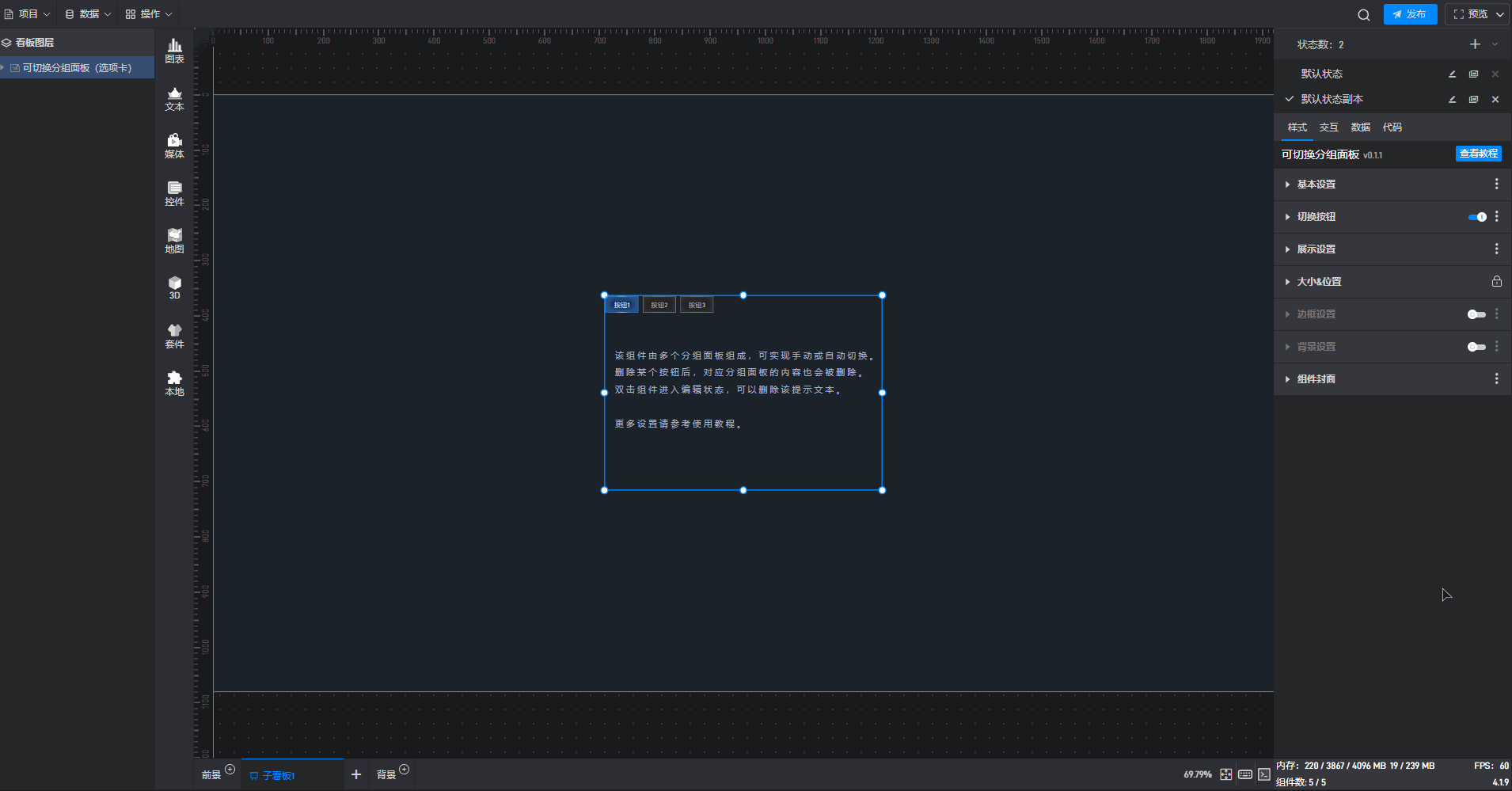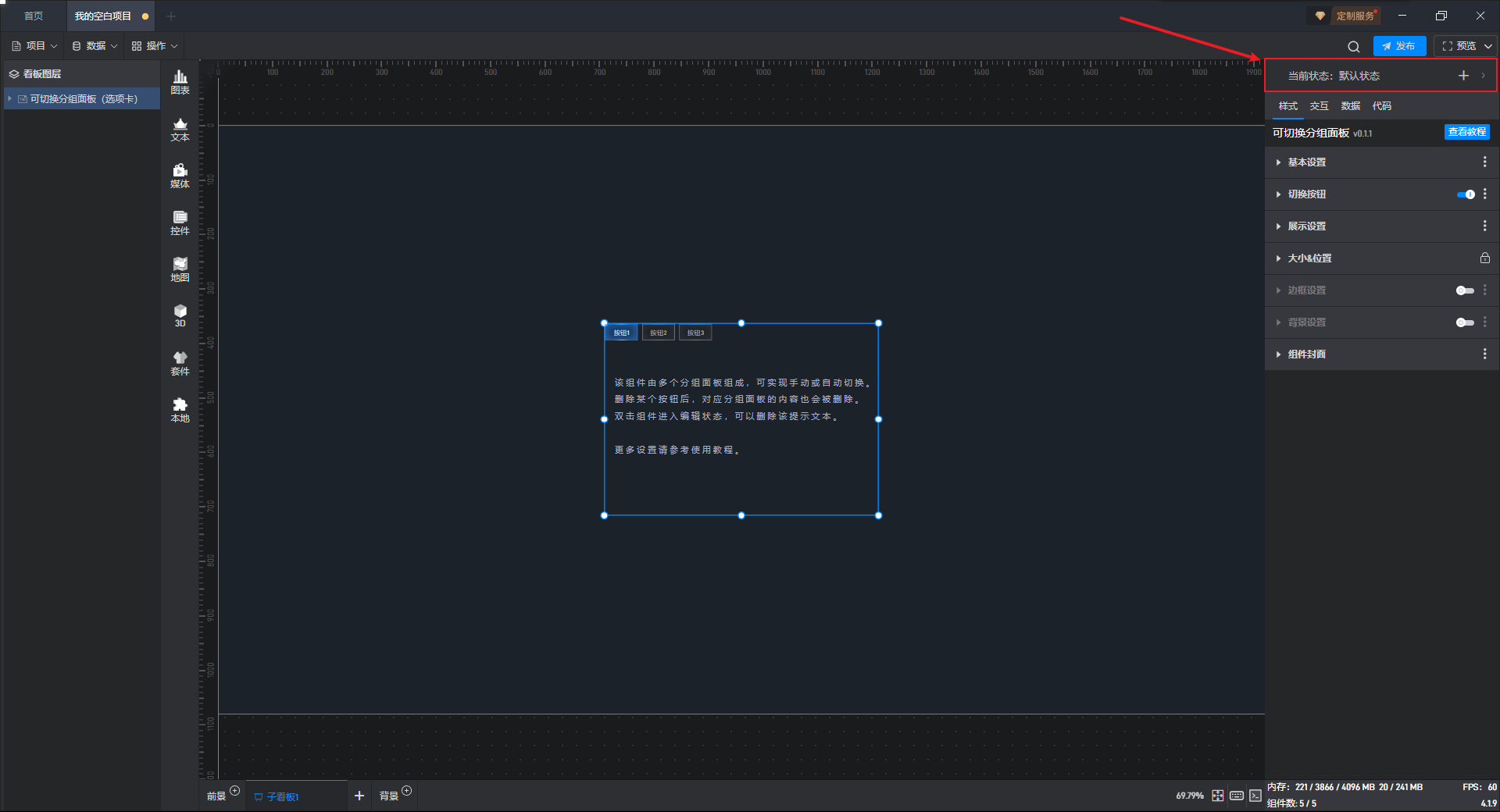 多状态主要用于通过数据条件或是点击交互(通常是点击其他组件来触发本组件的状态切换)来切换组件设置项的场景,这里的设置项包括组件的样式、交互、数据和代码。
