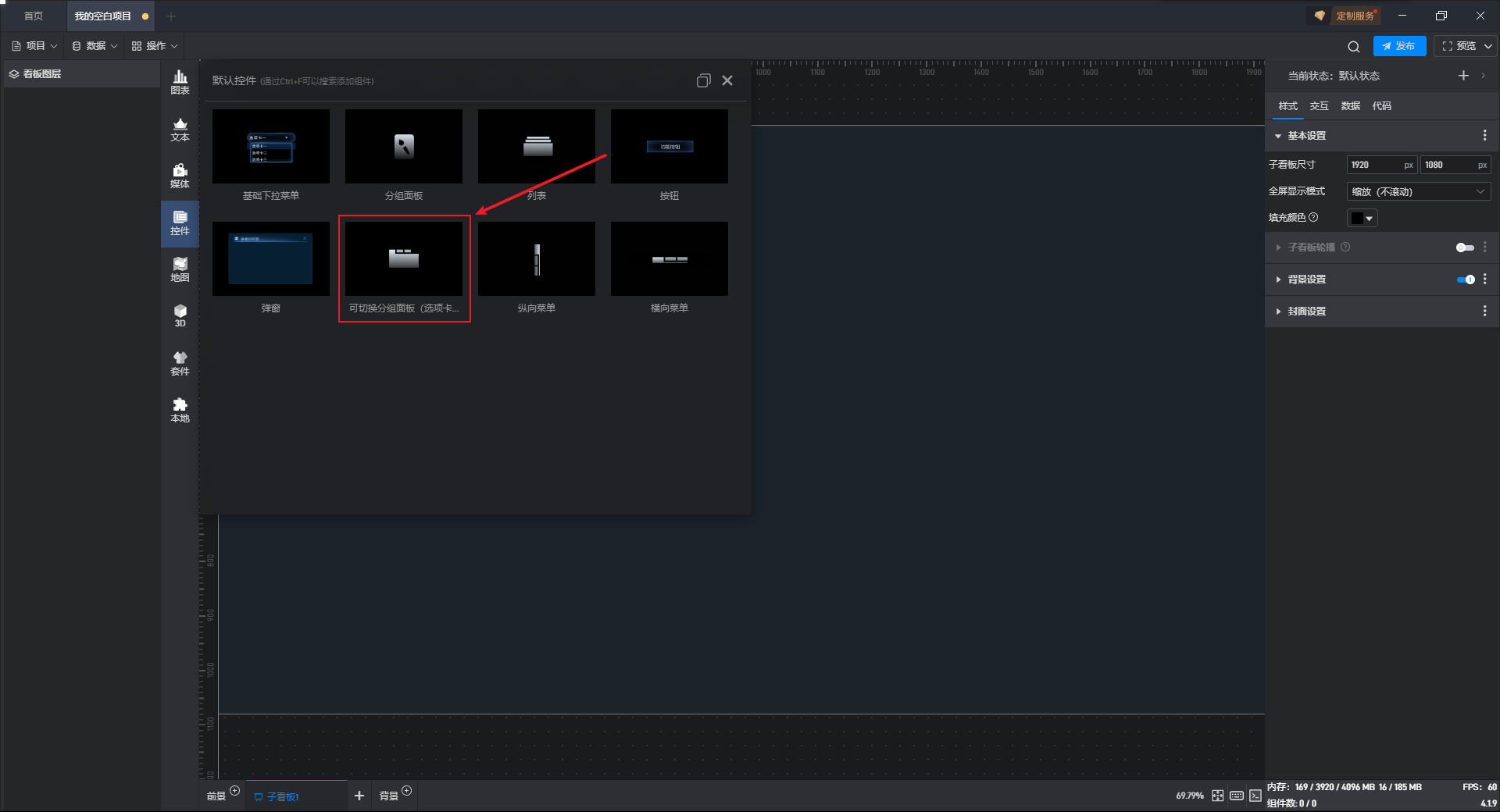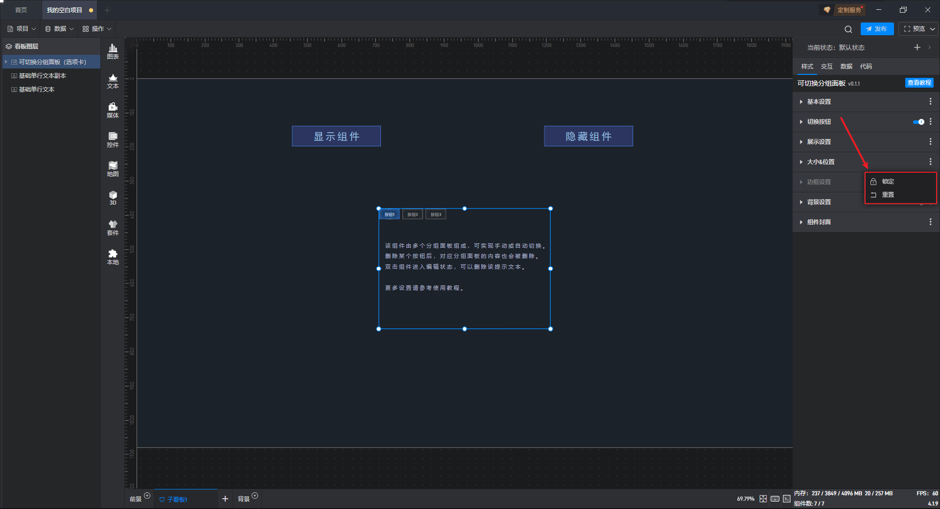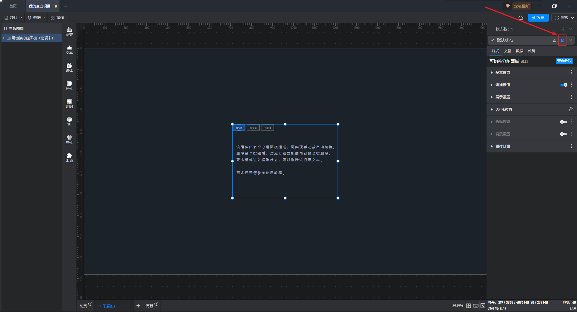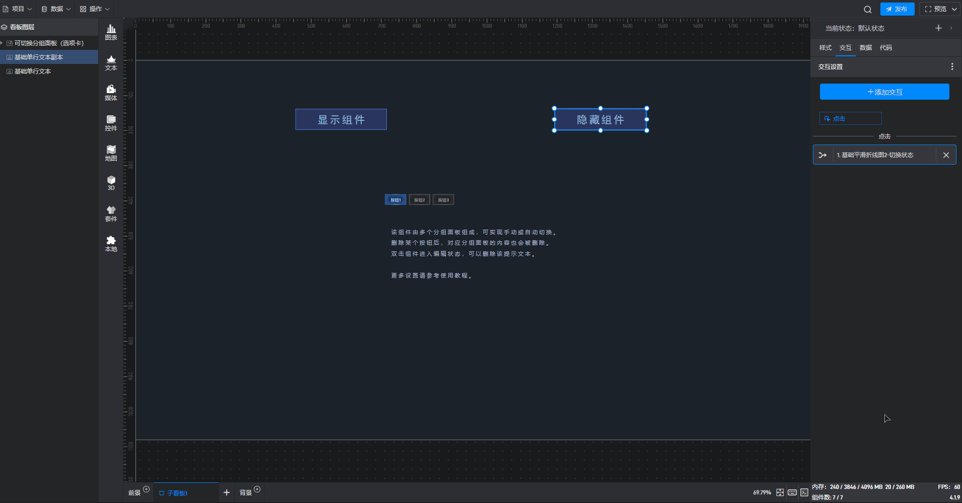 多状态主要用于通过数据条件或是点击交互(通常是点击其他组件来触发本组件的状态切换)来切换组件设置项的场景,这里的设置项包括组件的样式、交互、数据和代码。