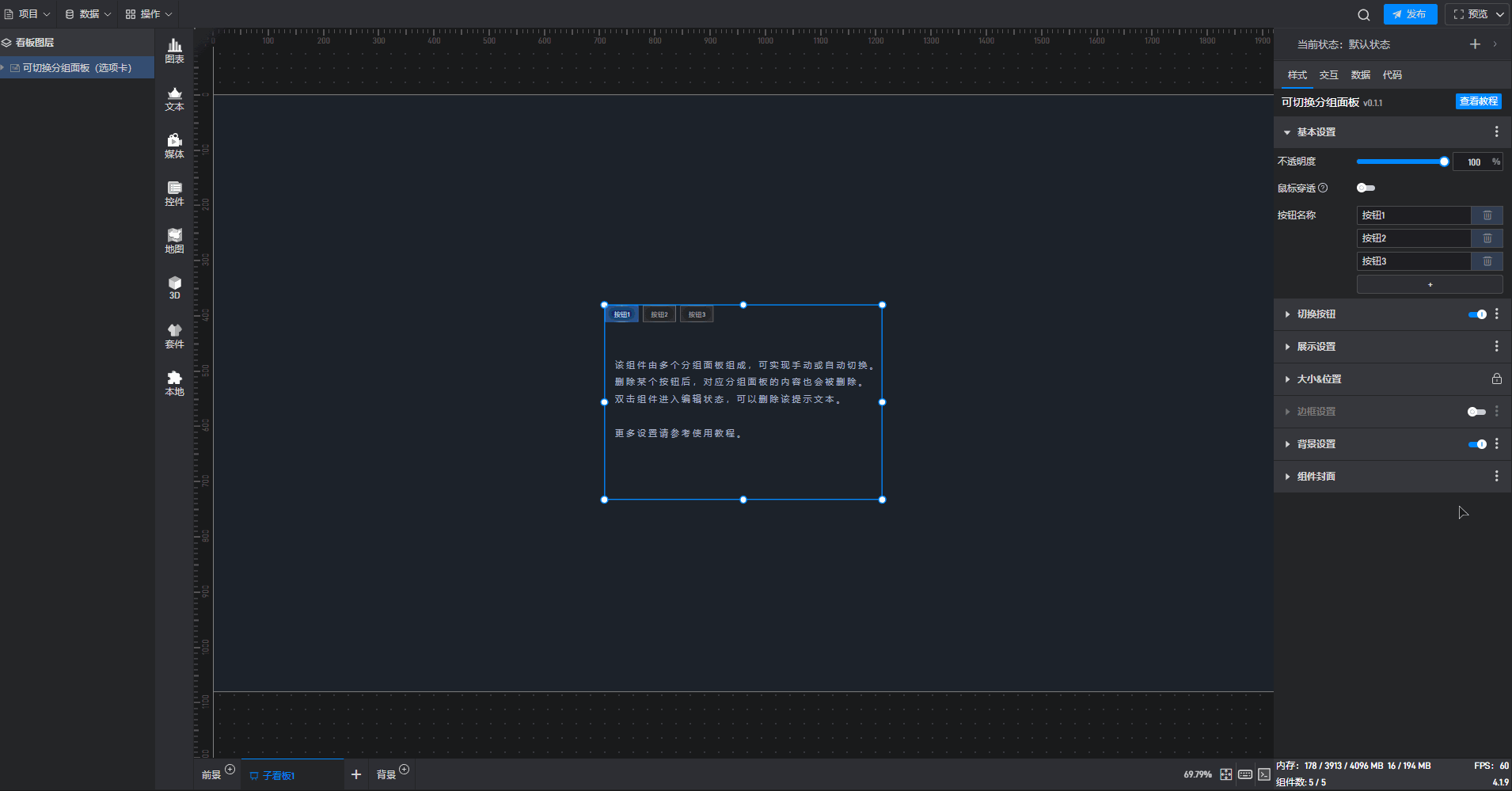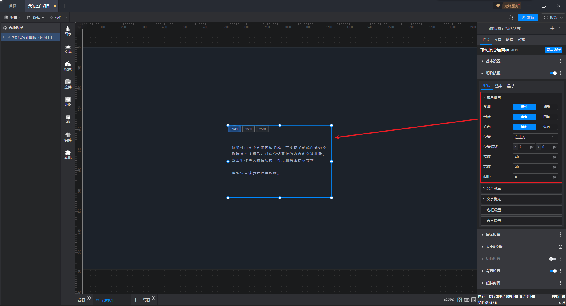 可切换分组面板中切换按钮拥有“默认”、“选中”、“悬浮”三个状态,每个状态分别对应一个“样式”,其中“默认”设置项中相较“选中”、“悬浮”状态多了个布局设置。
