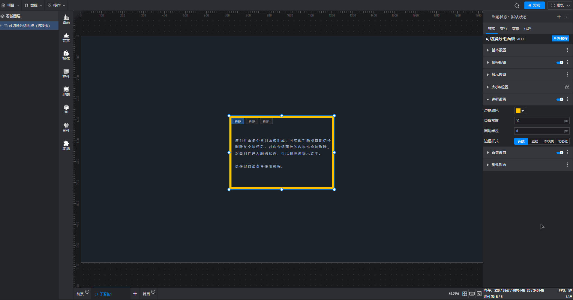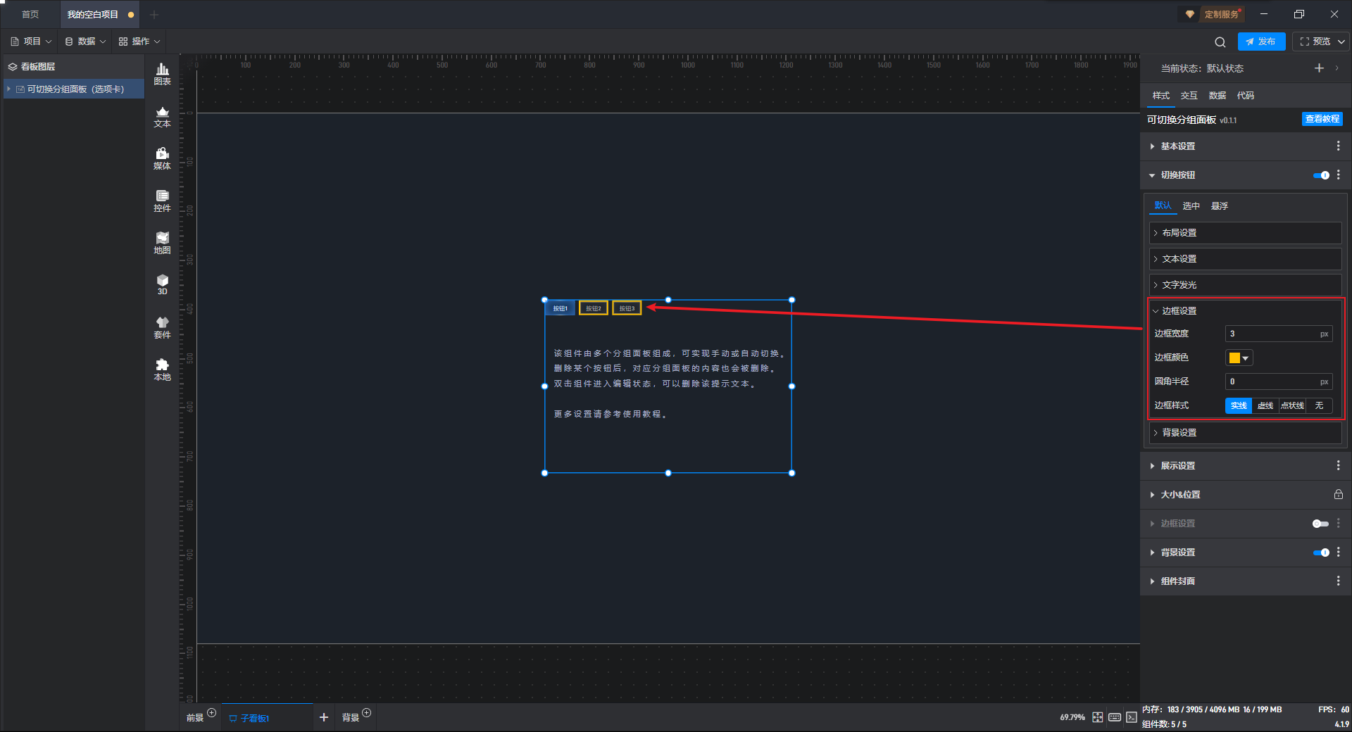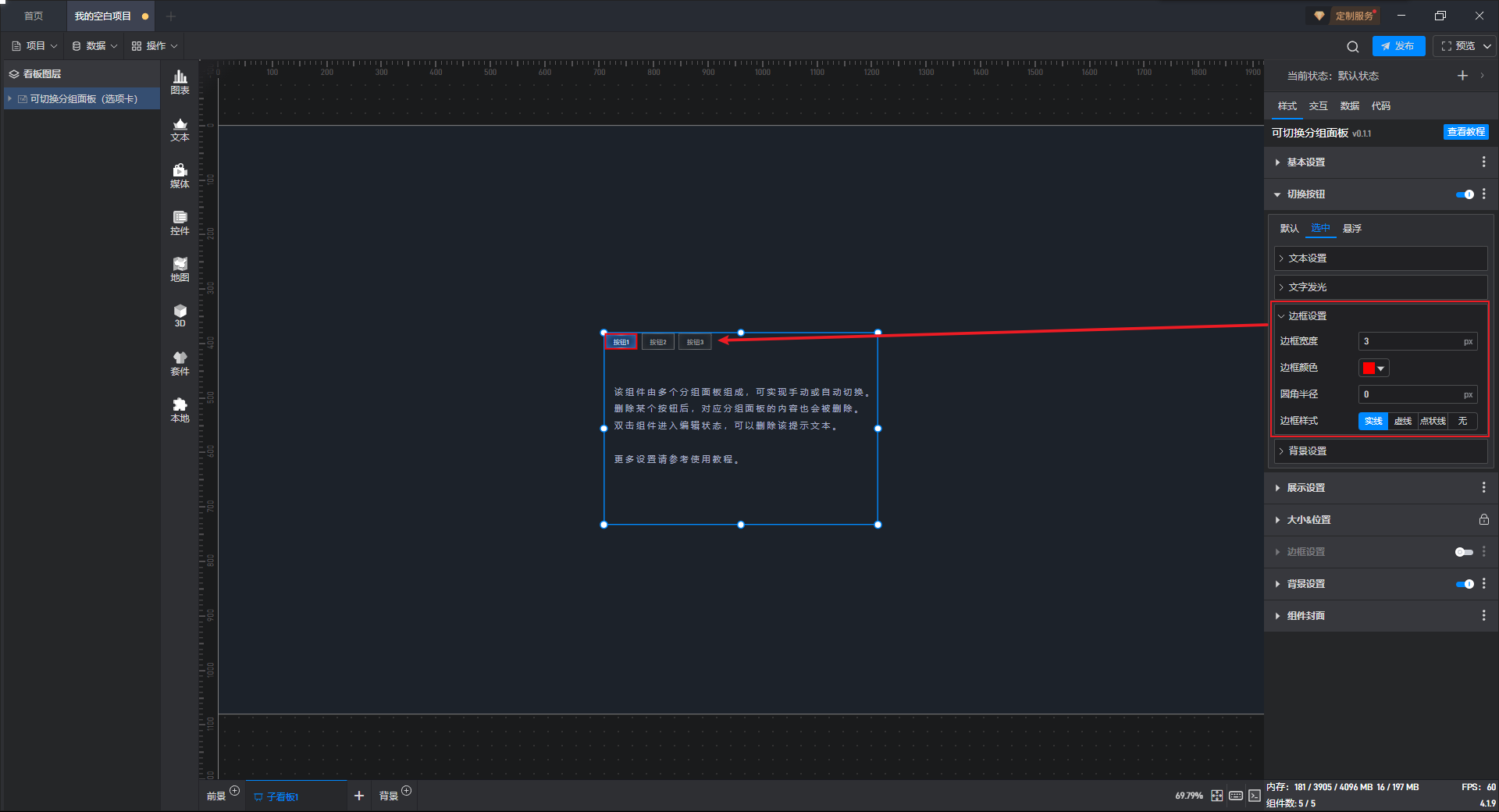 开启“边框设置”按钮后,组件中才会显示边框样式,才可以对组件整体边框样式进行配置。