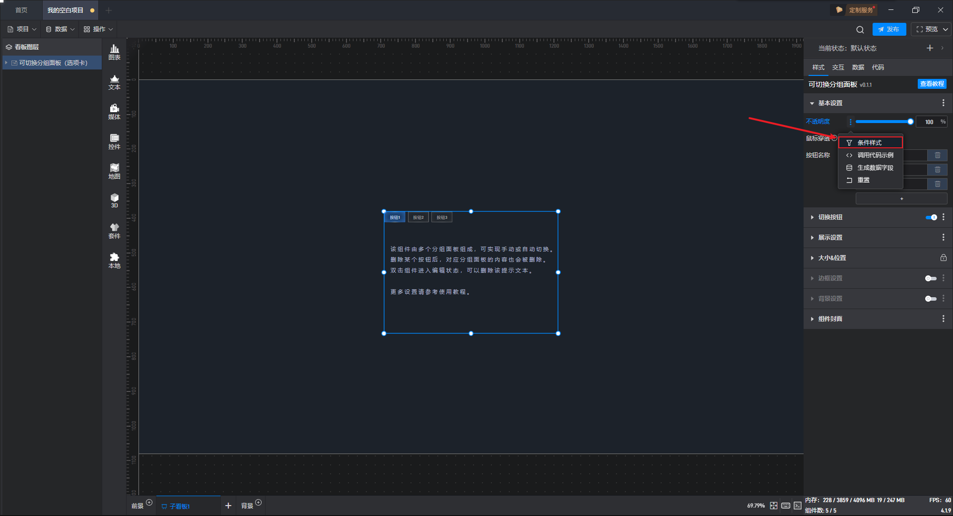 有一些设置项的条件设置方式直接显示在设置项中,这种就可以直接在外面设置,但选项卡组件的条件样式只能通过方式 1 进行设置。
