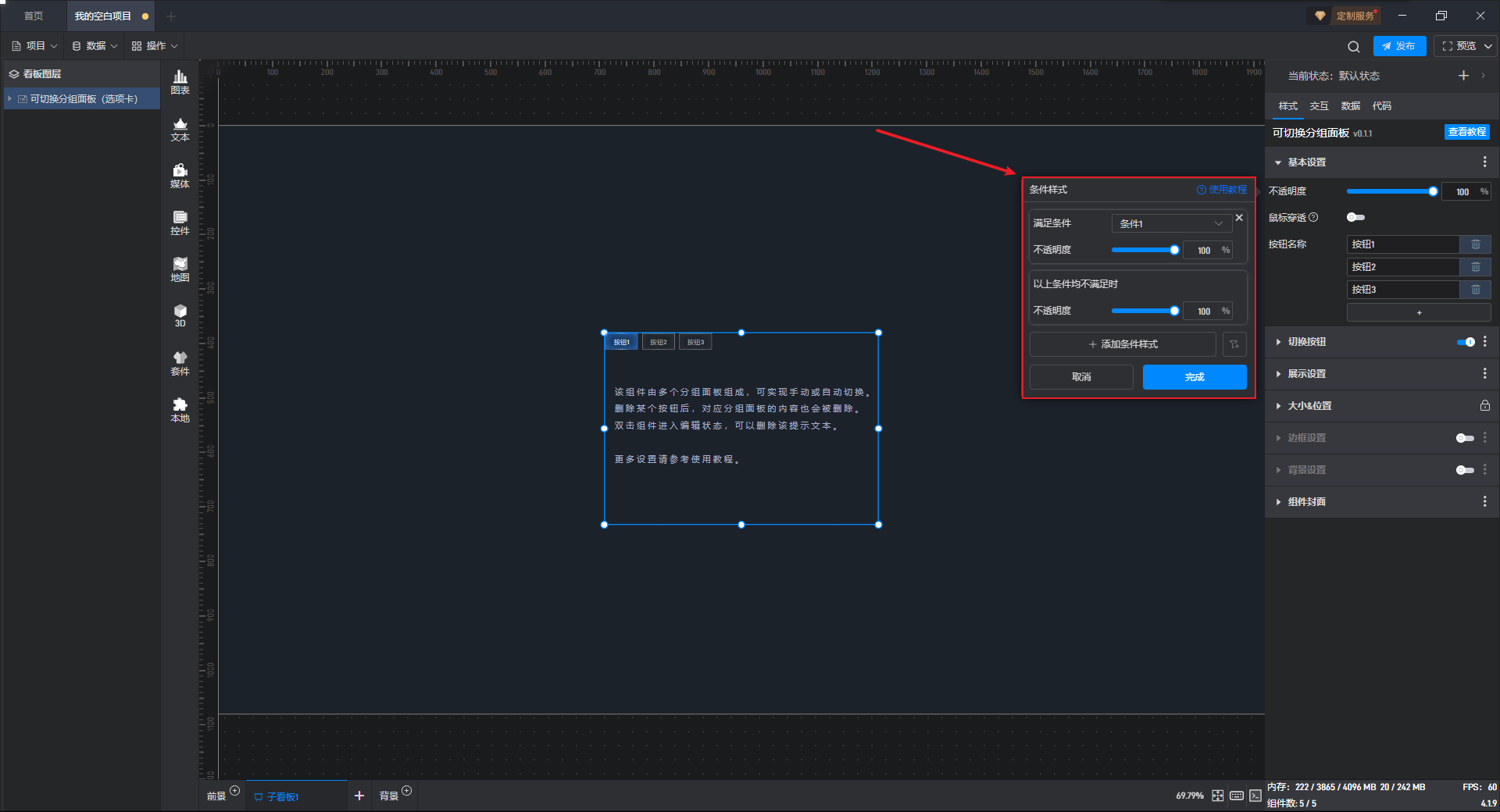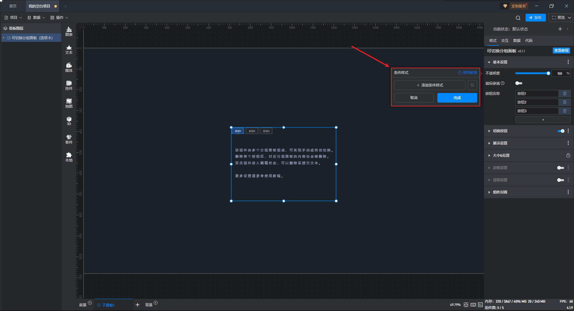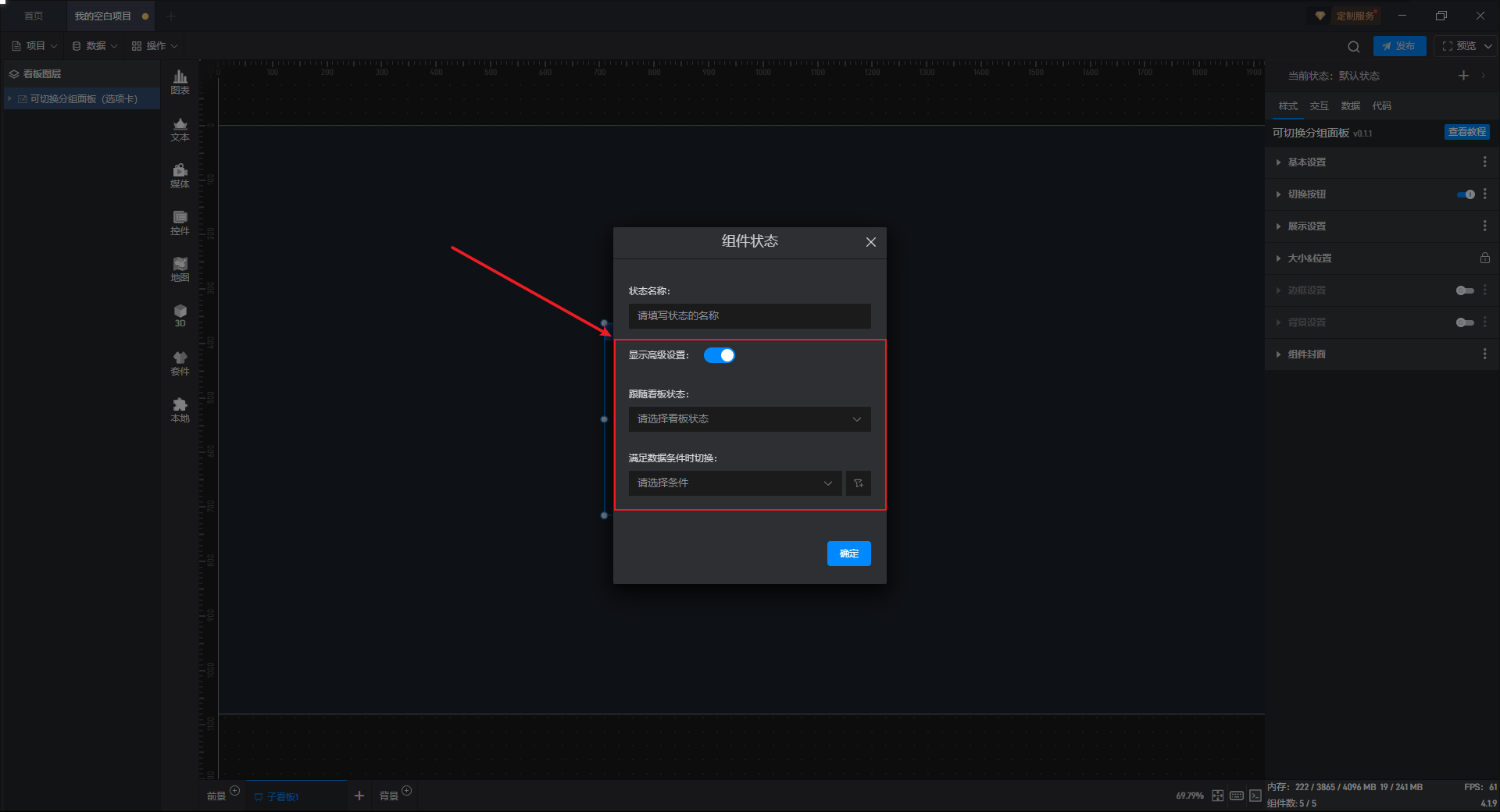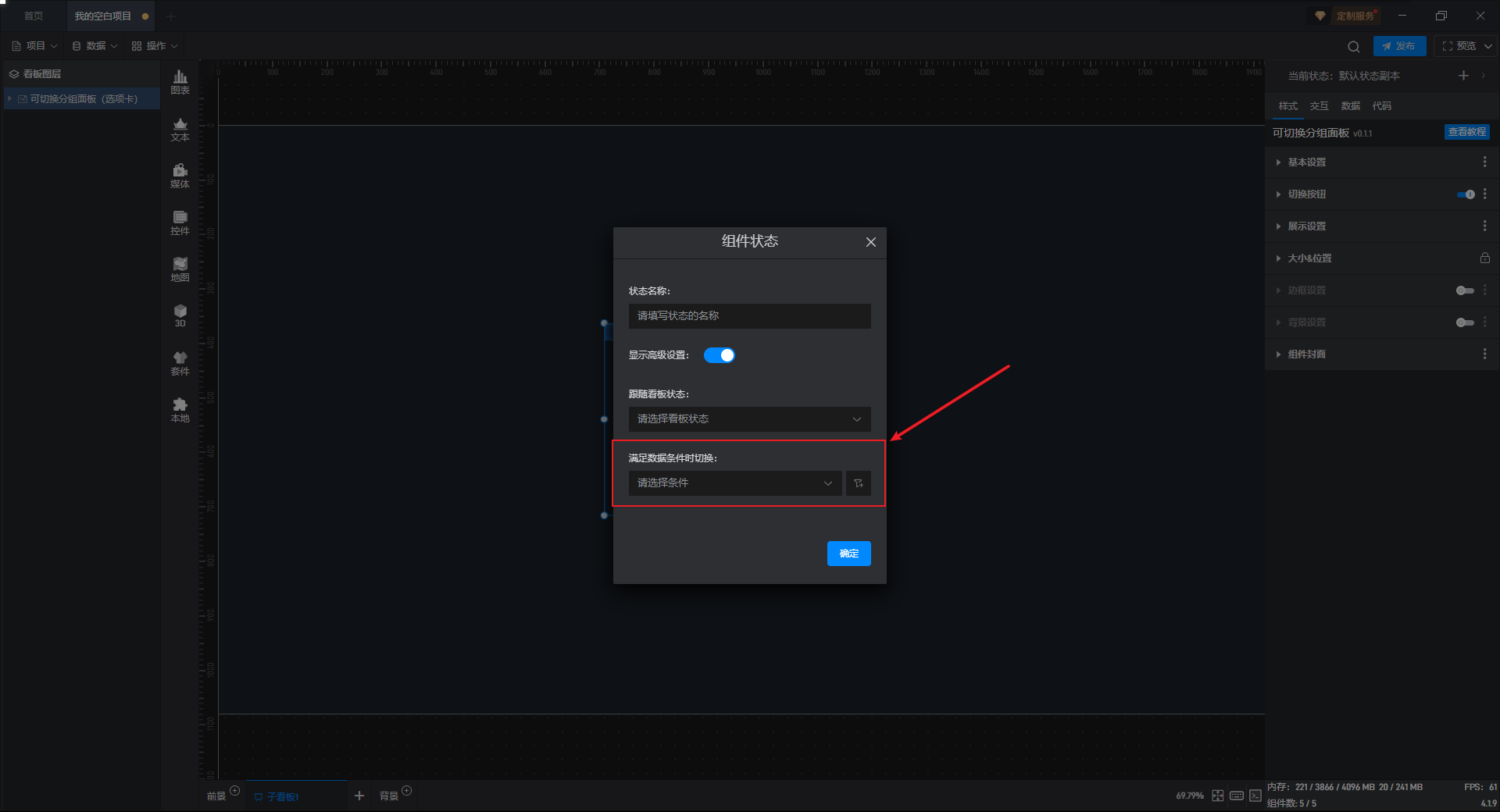在这里我们可以选择已设置的数据条件,从而在数据条件满足时,组件的状态就会发生变化。