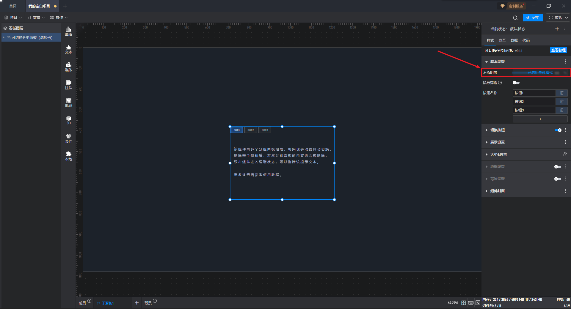 不透明度 | 1)根据个人喜好或整体和谐度合理地使用透明度,会让大屏布局更美观; | 2)这个设置项的一个常见用法是结合条件样式/交互/多状态来实现组件的显示和隐藏。 |