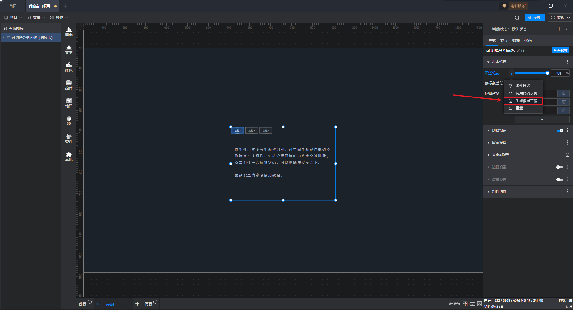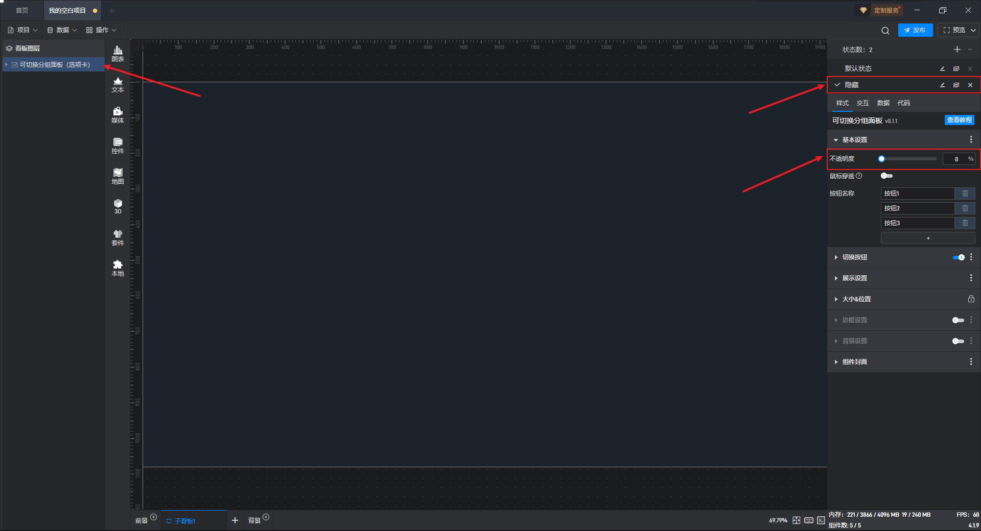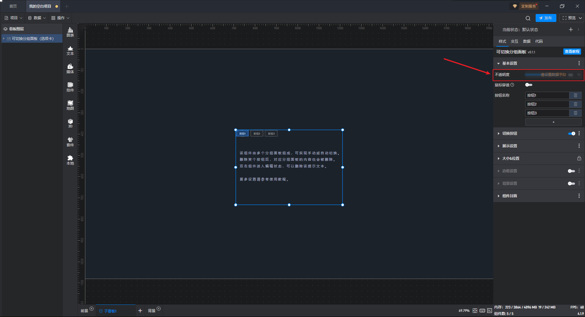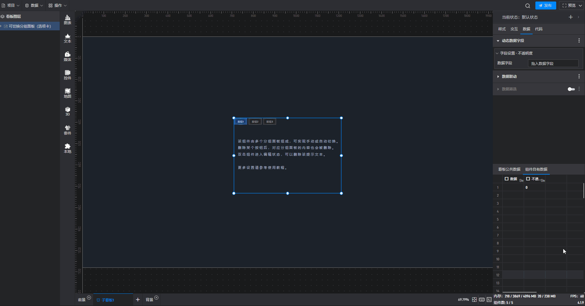 添加一个数值为“0”的数据到数据字段中,可以看到通过动态数据字段将不透明度的数值修改为“0”,从而使组件隐藏。