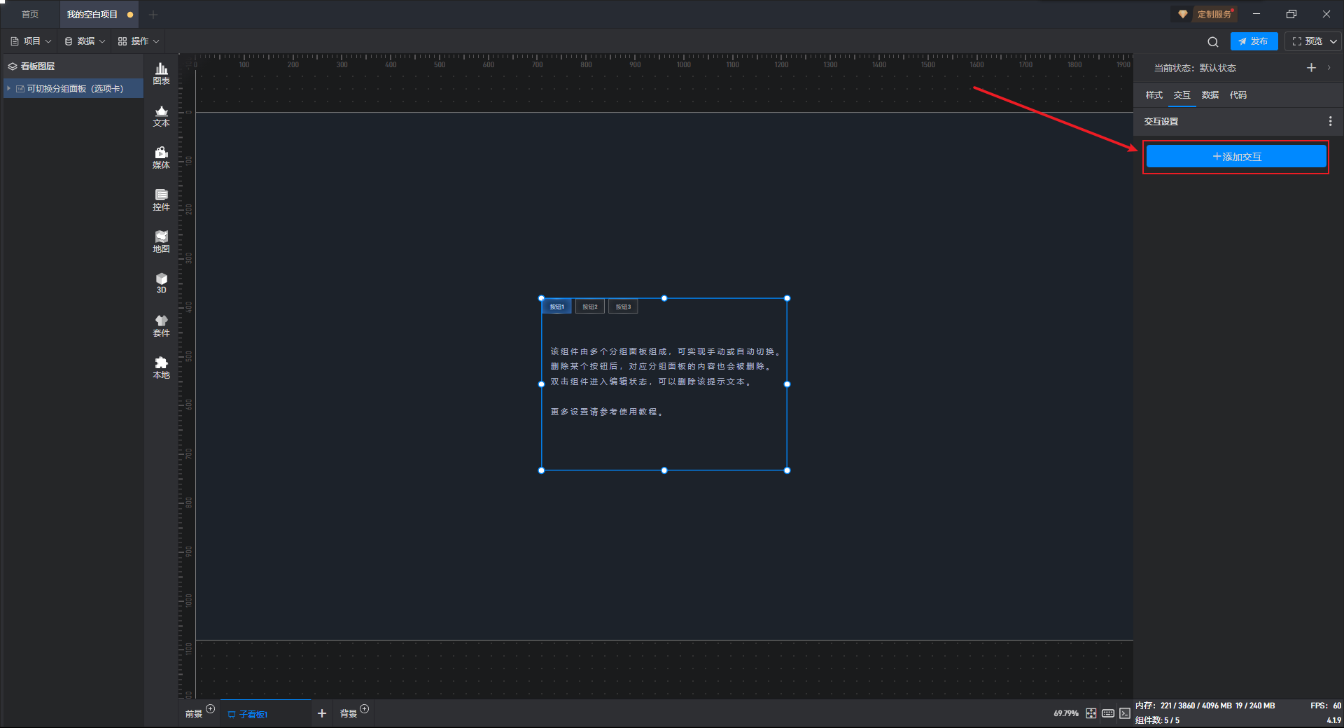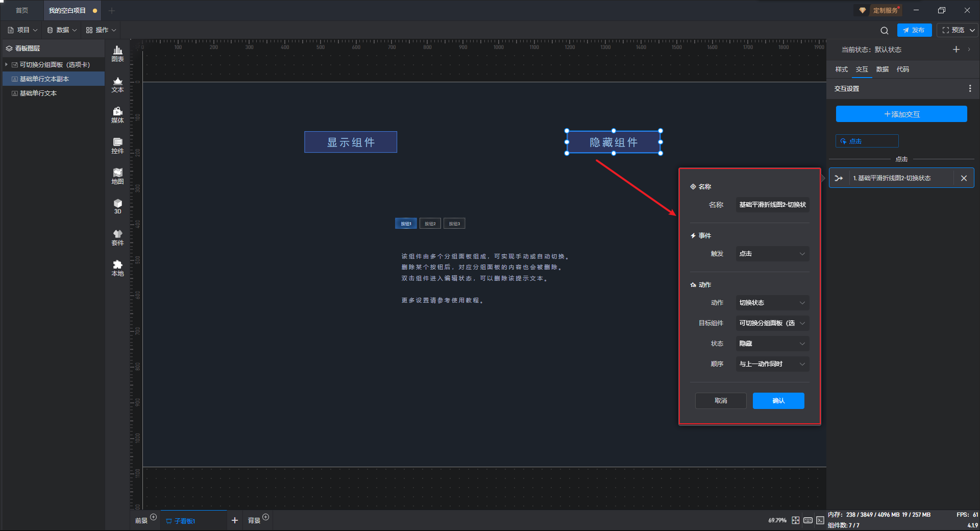 点击选中组件,在右侧“交互”设置窗口中可以对当前组件的交互进行添加和删除。