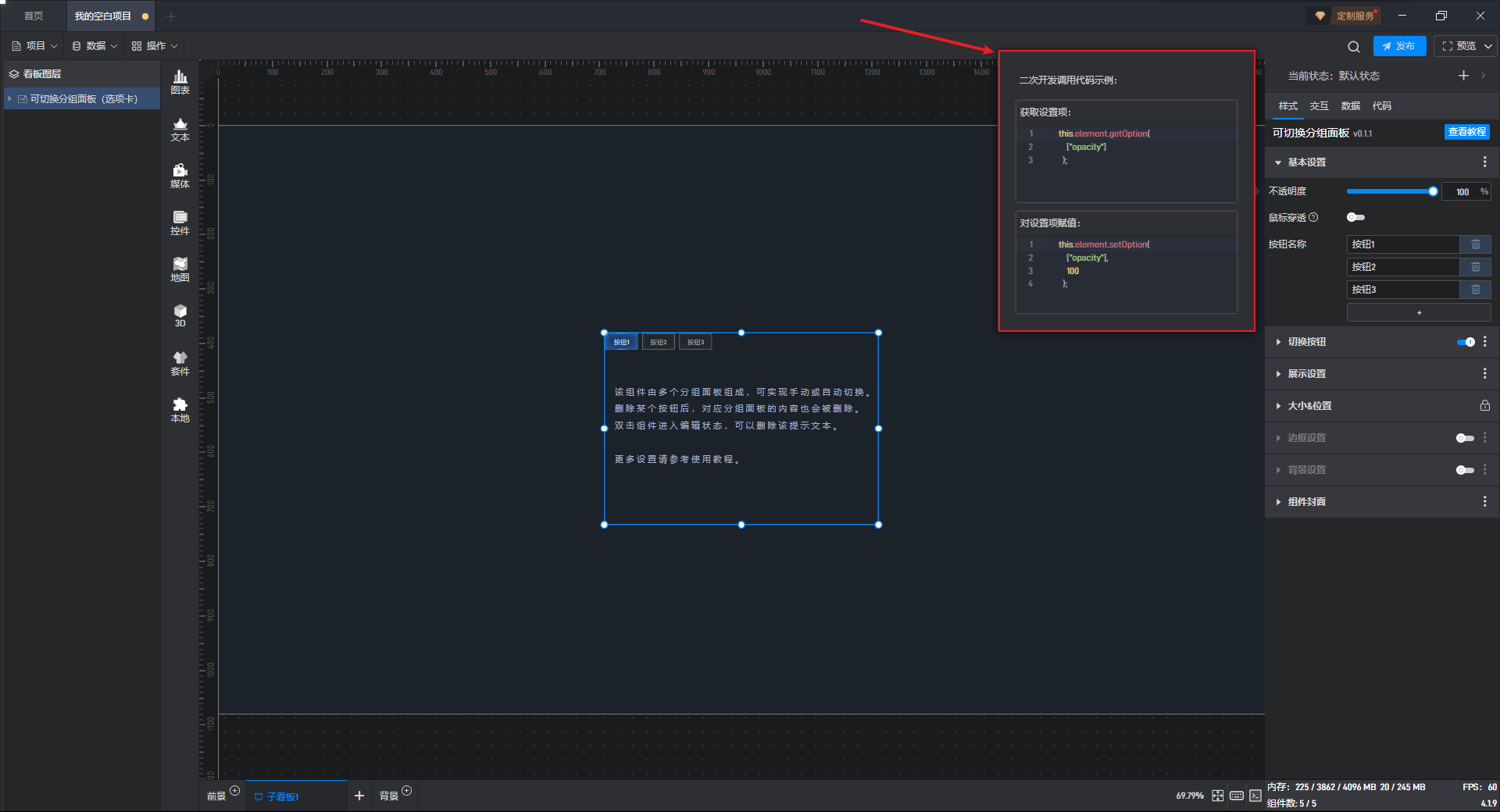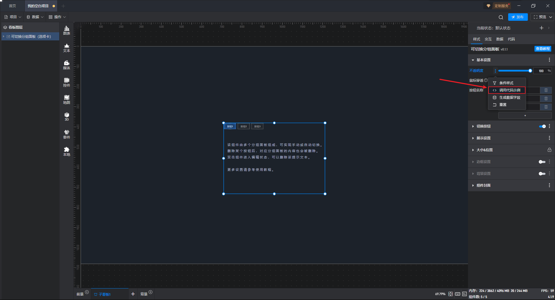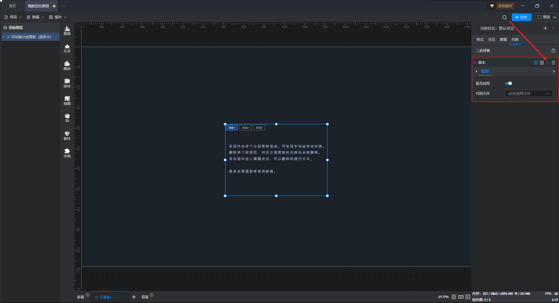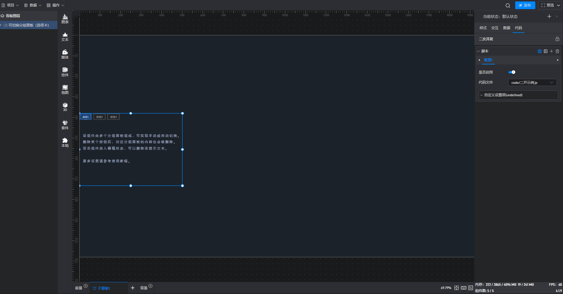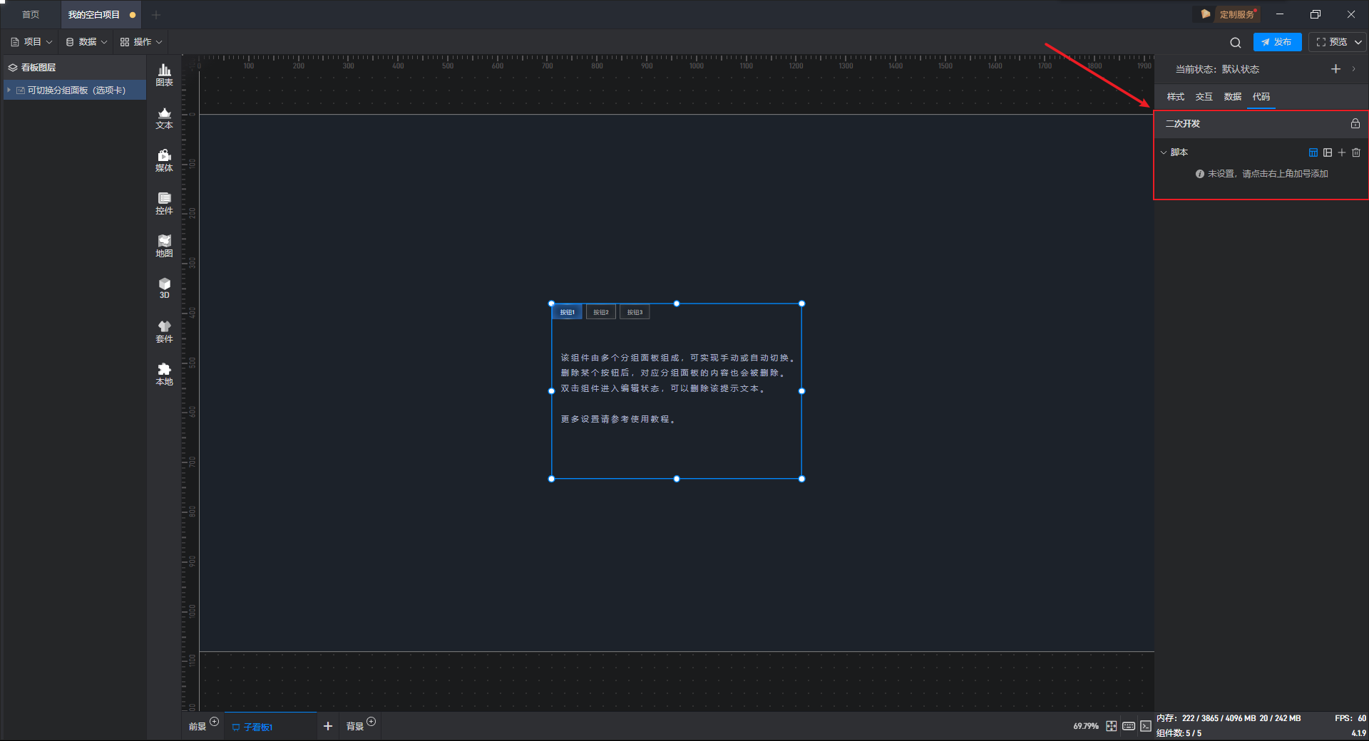 点击选中组件,在右侧“代码”设置窗口中可以对组件进行二次开发设置。