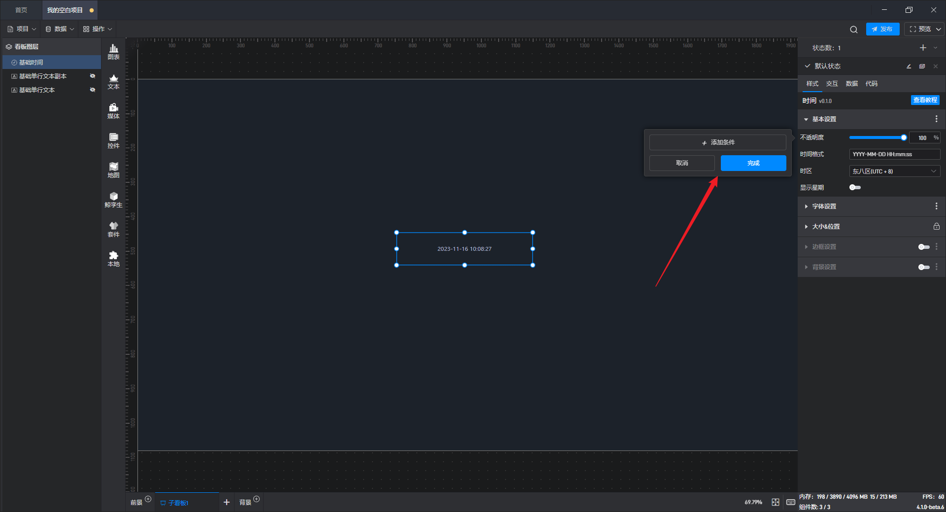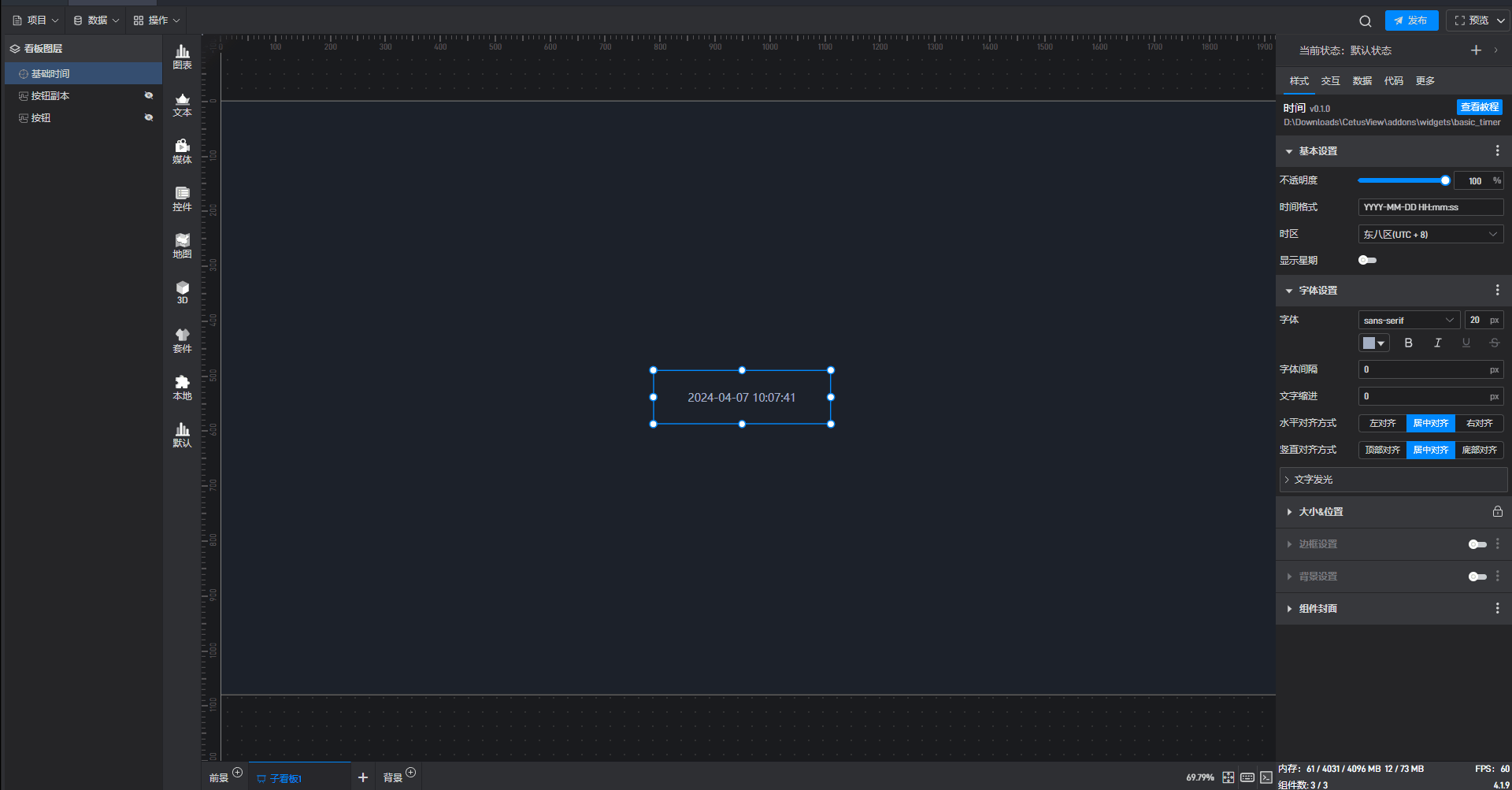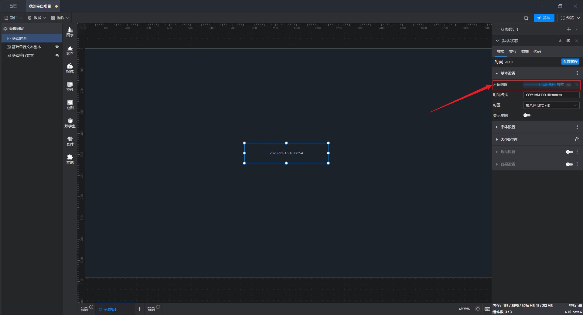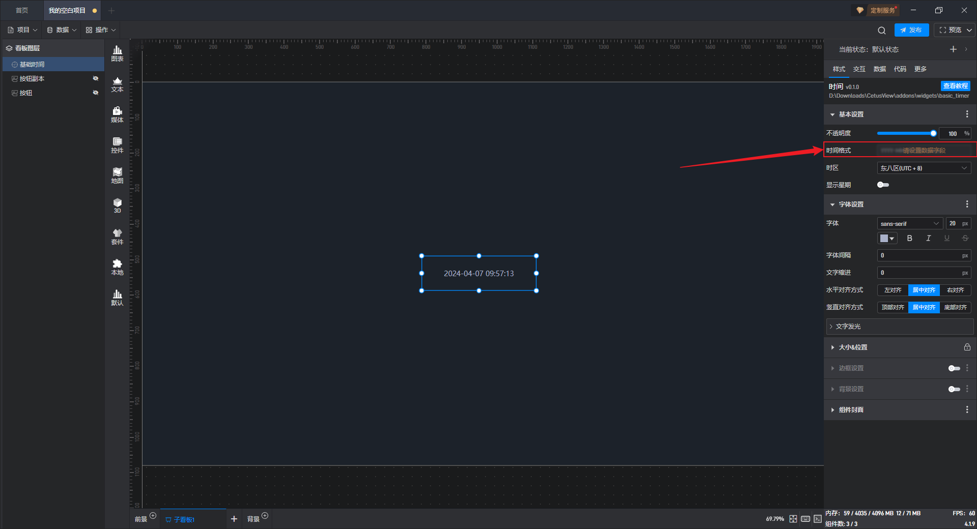 点击选中时间组件,在右侧样式“基本设置”项分组中,可以对“时间格式”和“时区”进行设置。