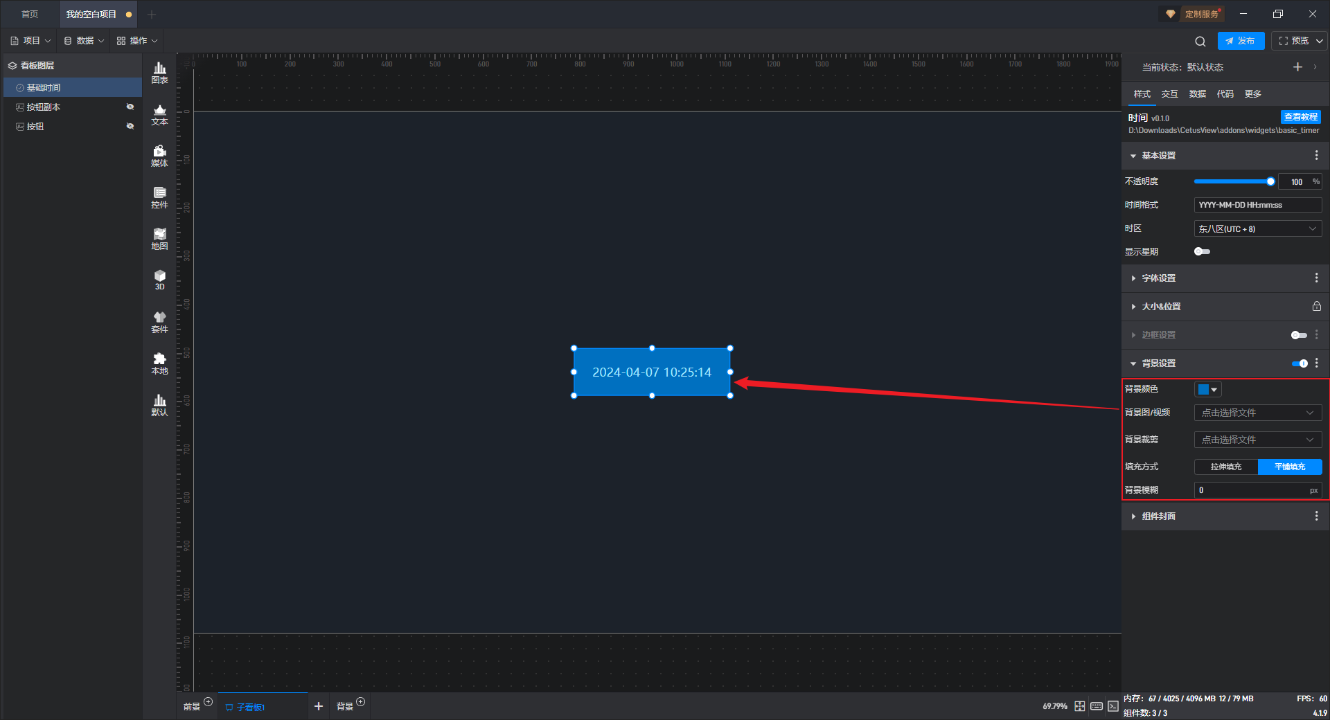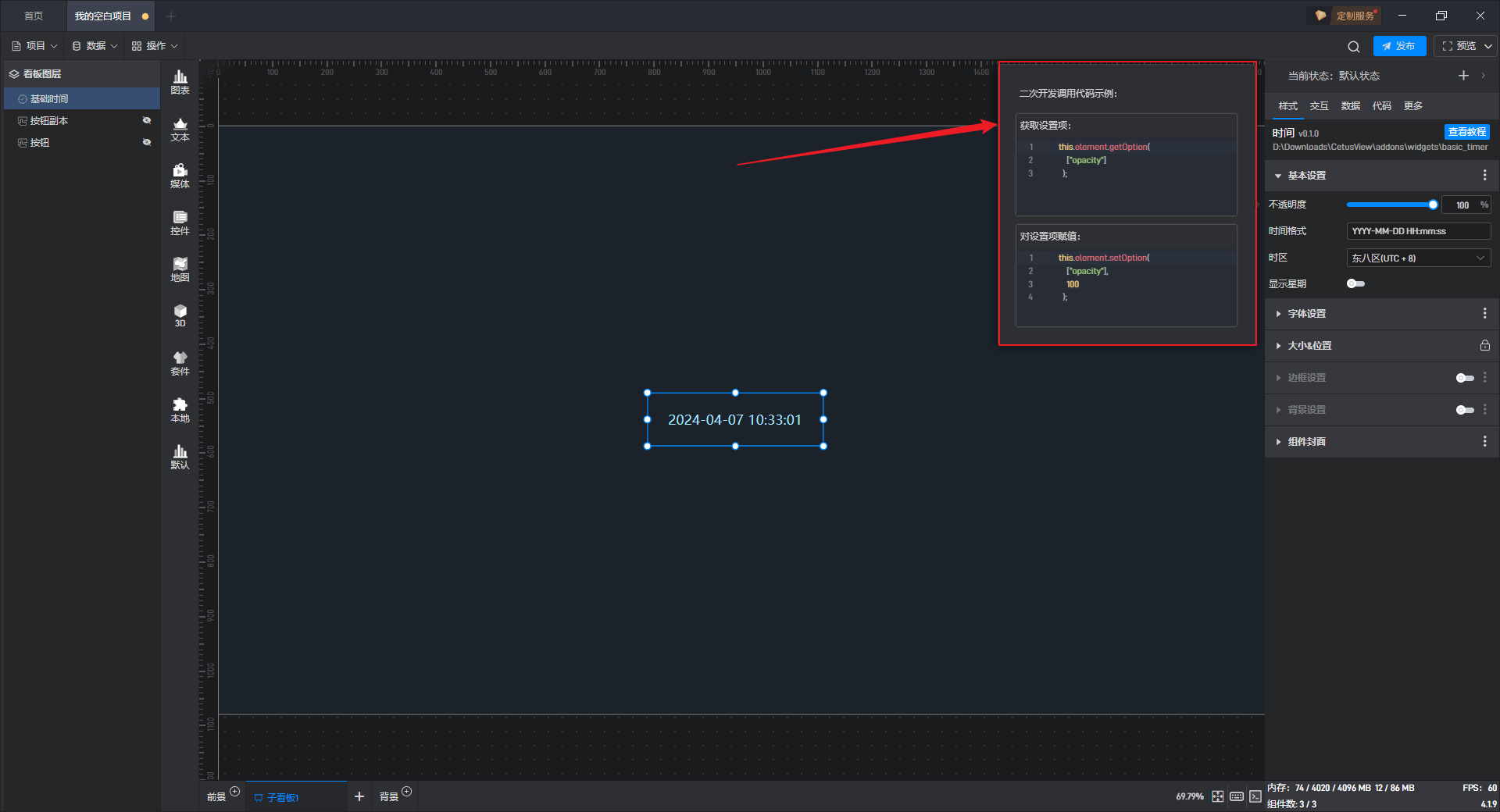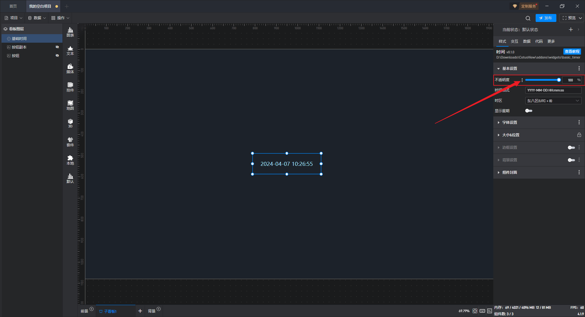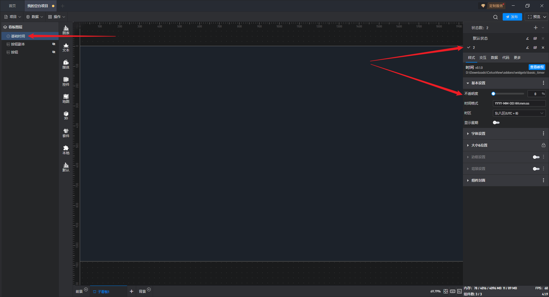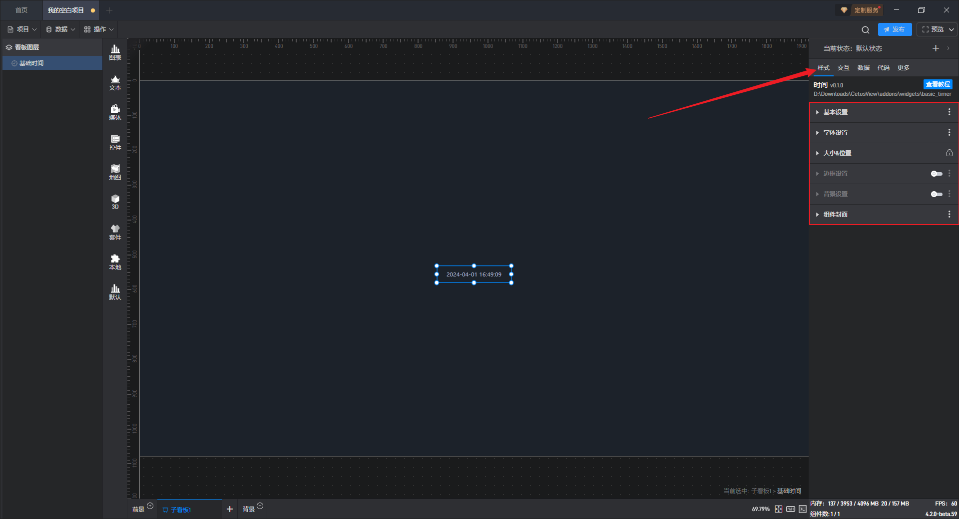 点击选中时间组件,在右侧样式“基本设置”项分组中,可以对“时间格式”和“时区”进行设置。
