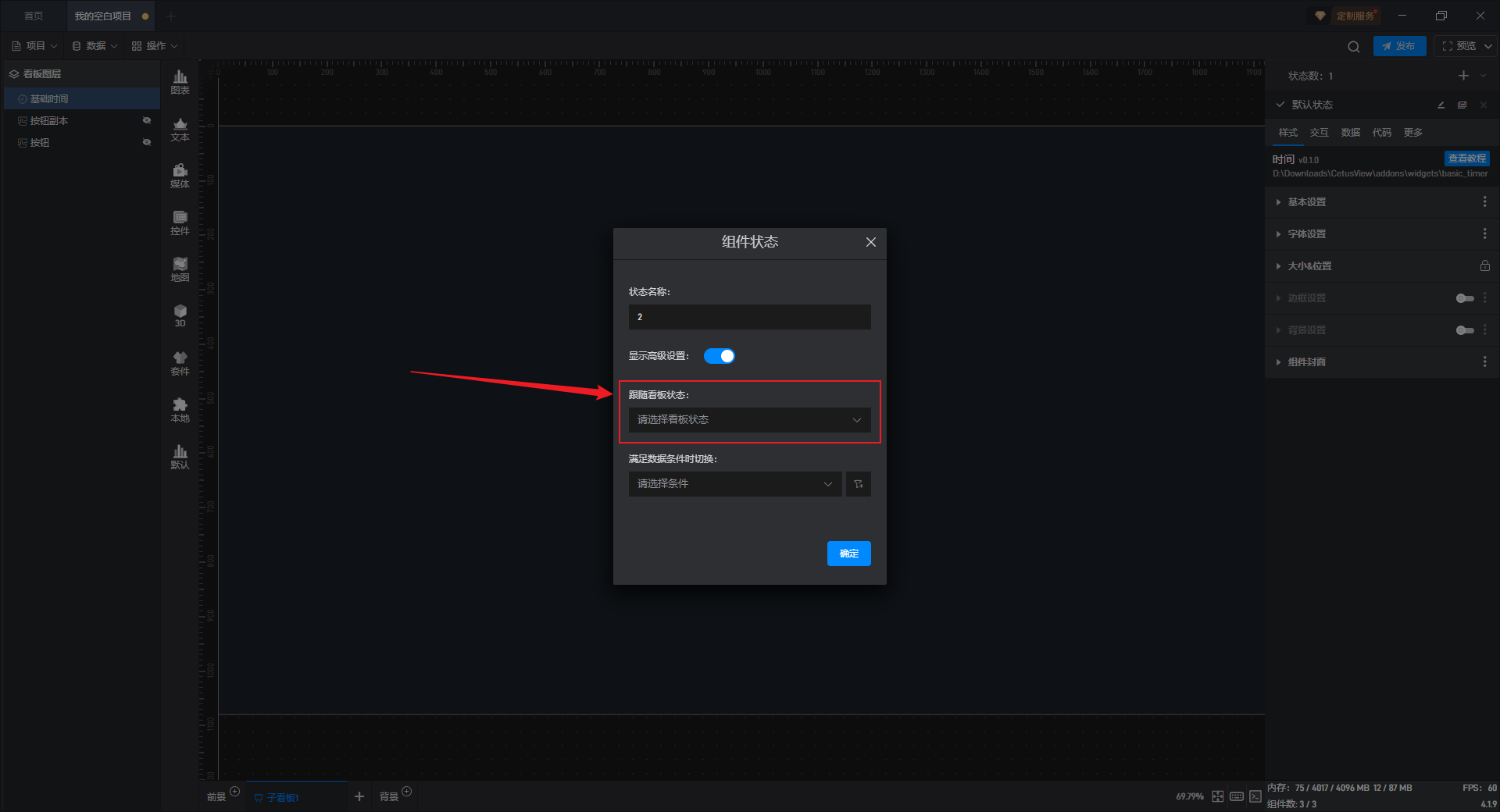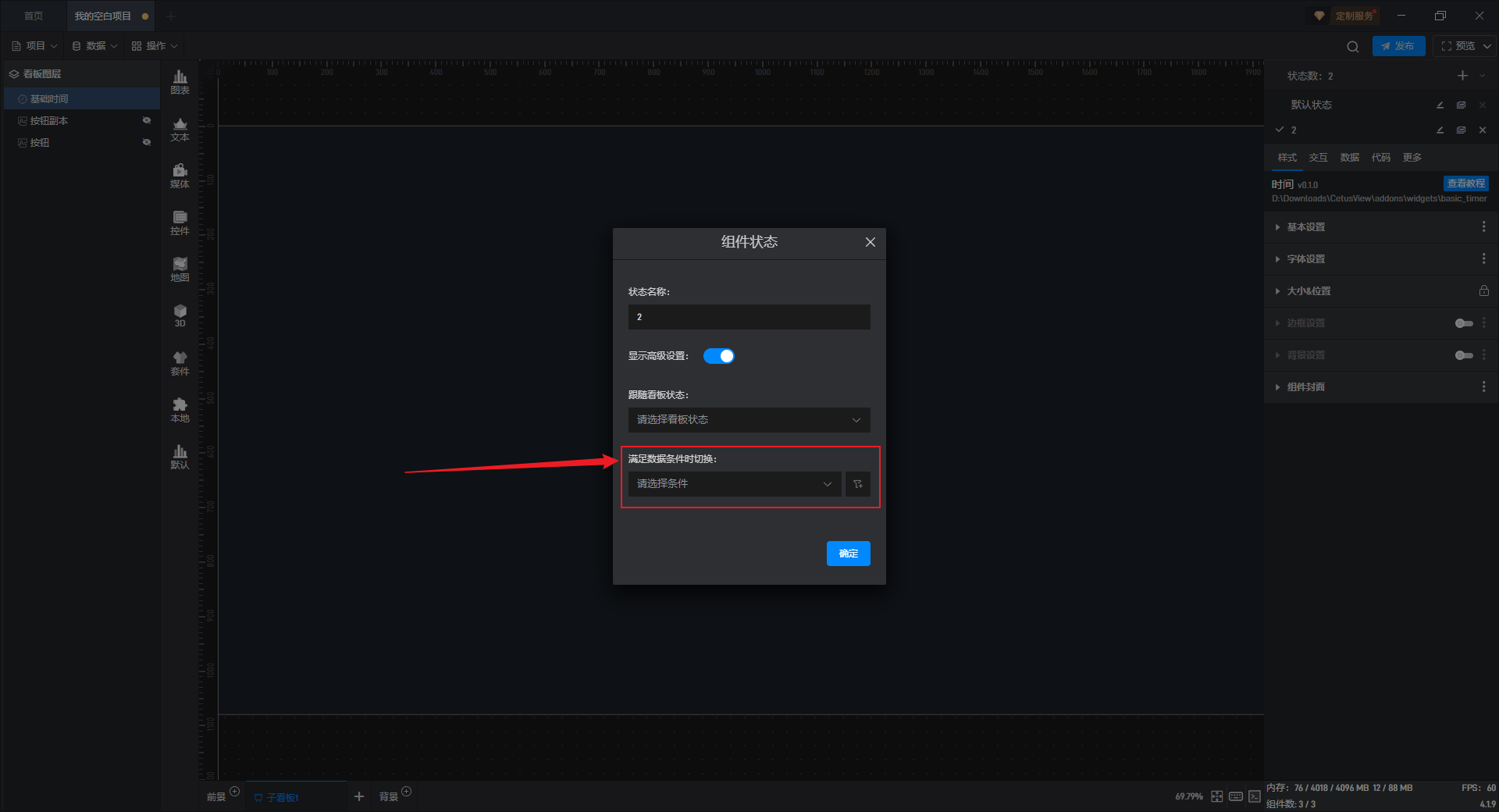 在这里我们可以选择已设置的数据条件,从而在数据条件满足时,组件的状态就会发生变化。