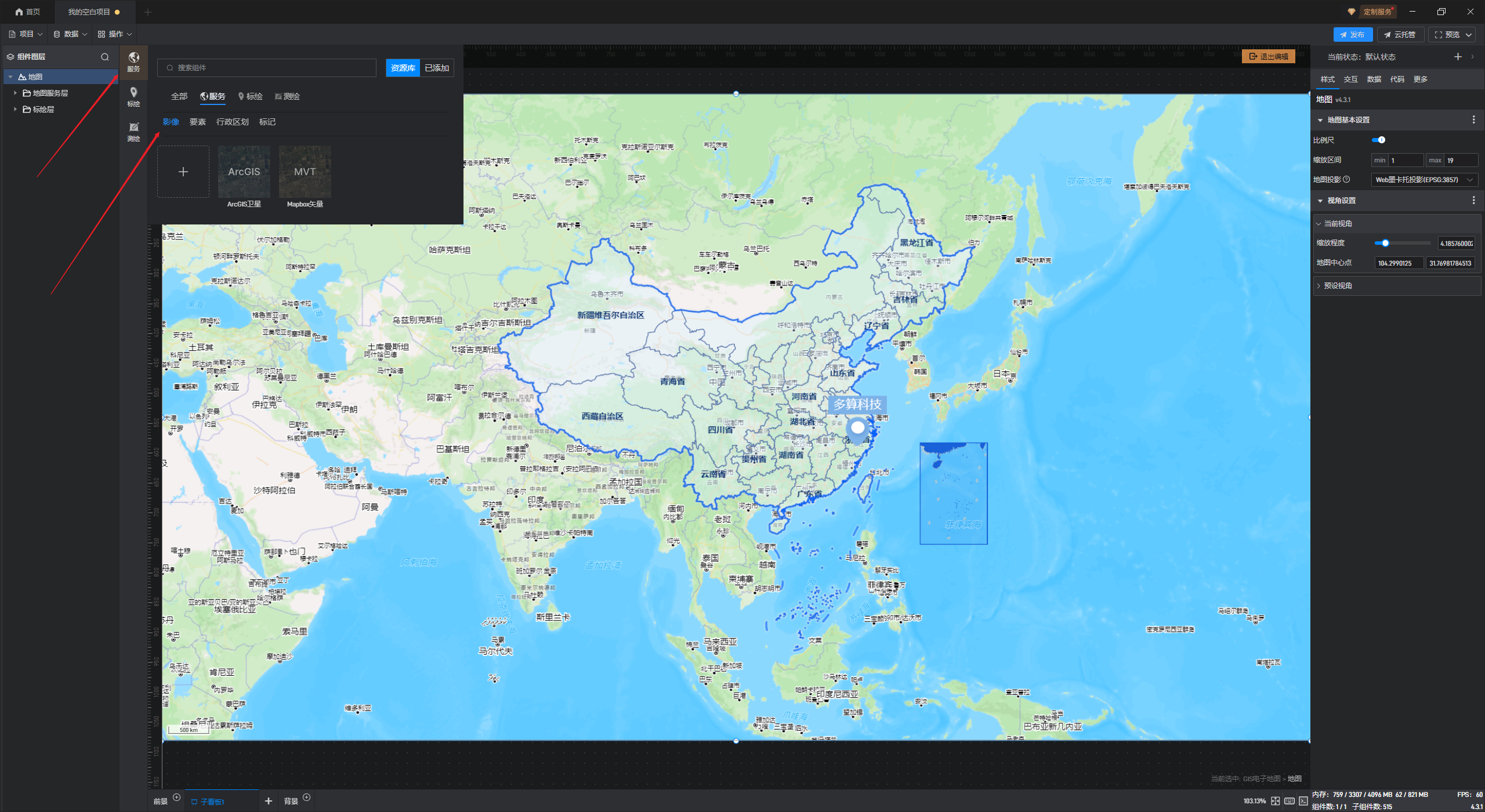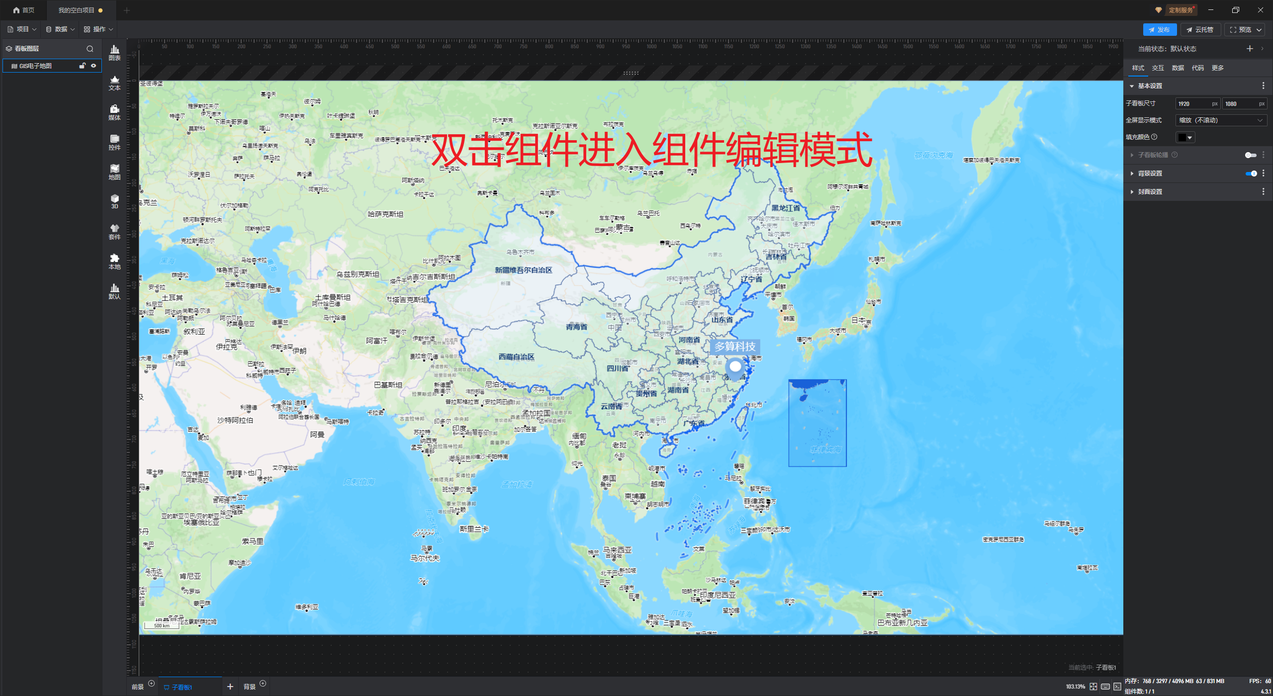 鲸地图中可以自定义添加影像作为底图服务,在画布中双击该组件进入组件编辑模式。