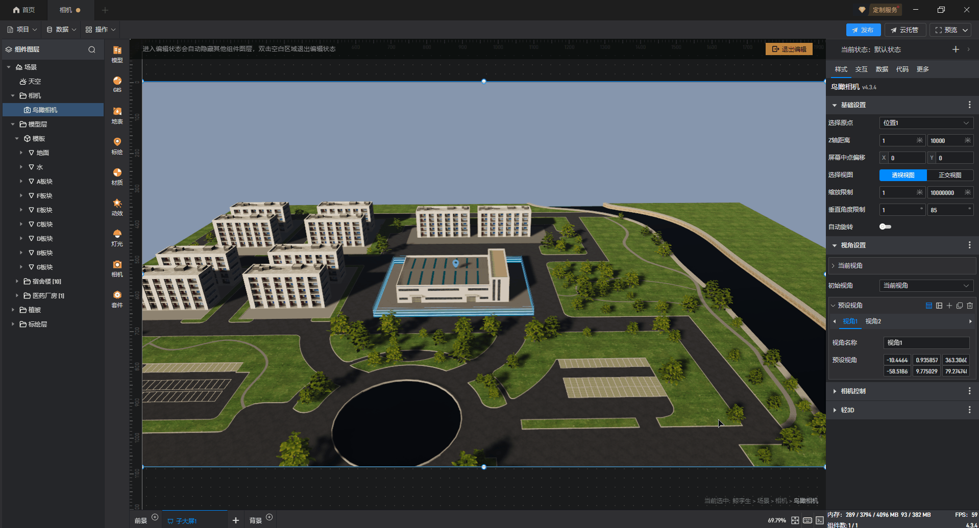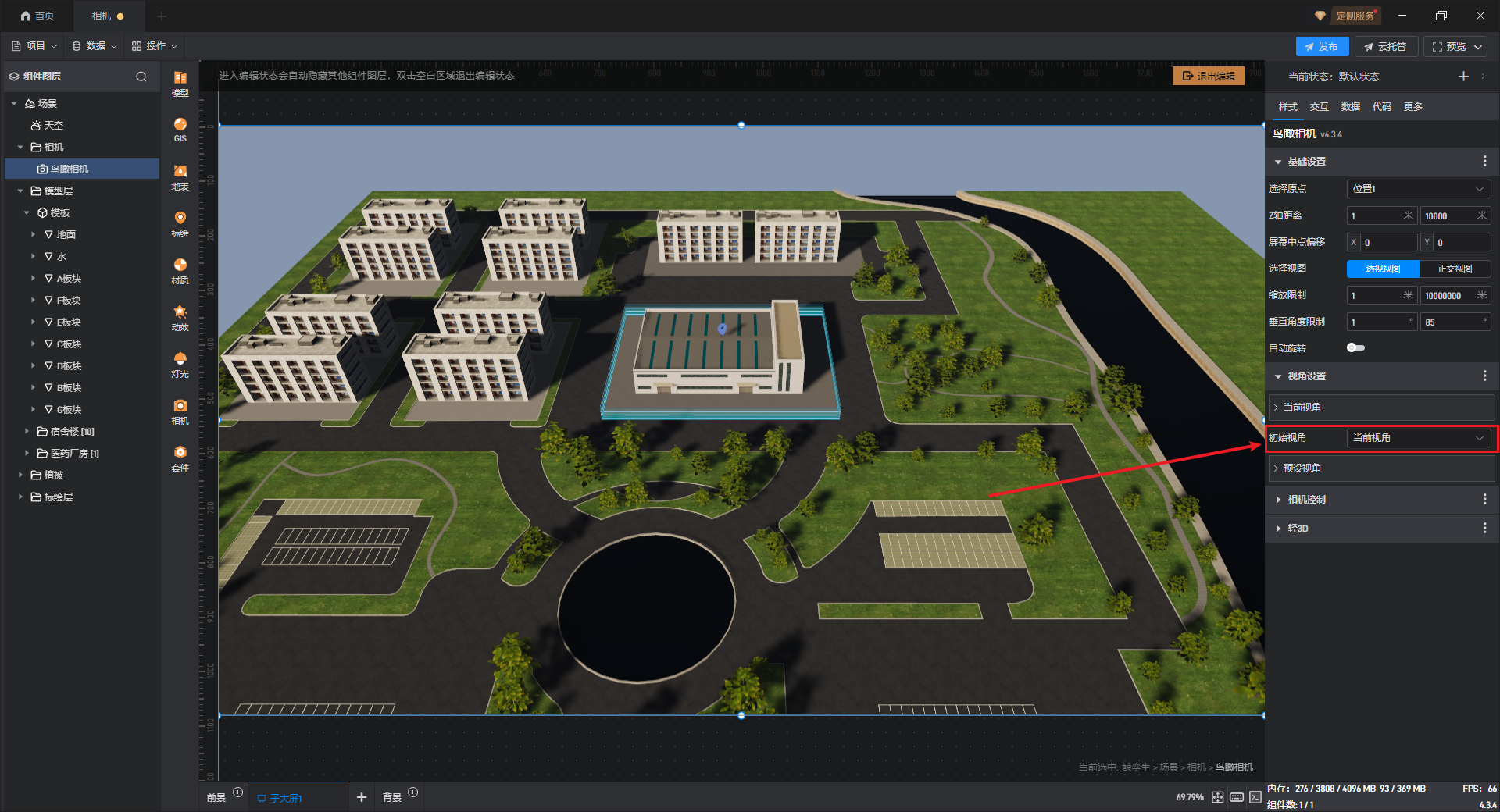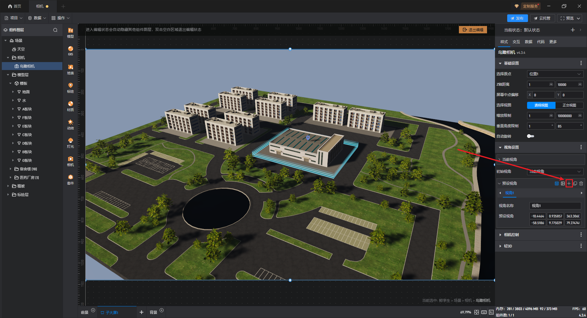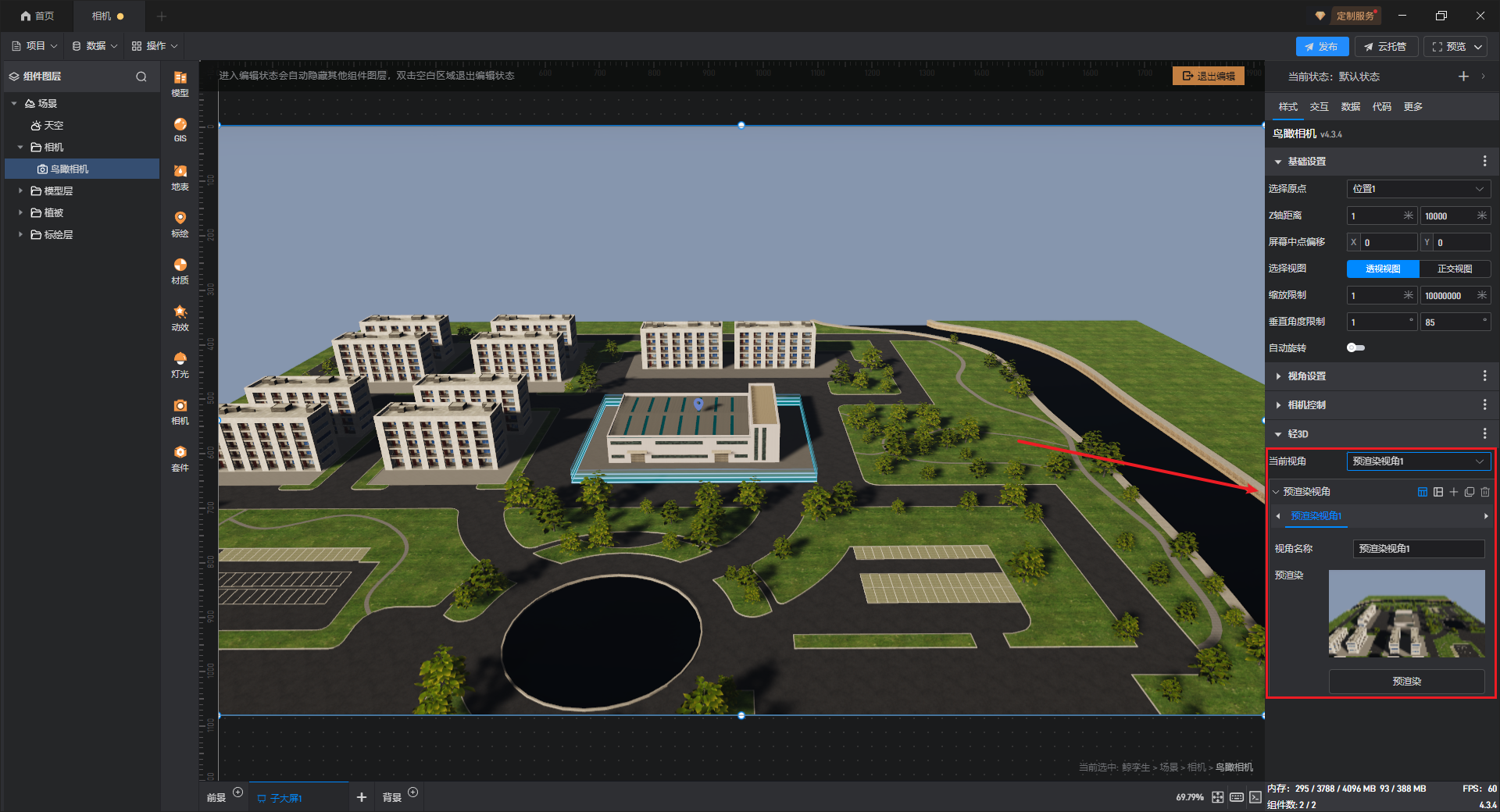 “轻 3D”功能通过将复杂的立体模型预先渲染成高质量的二维平面图片,从而大幅降低了实时渲染对硬件设备的要求,在运行三维项目时,使配置较低的计算机或移动设备也能实现流畅的浏览和交互。在此处可以添加鸟瞰相机的“预渲染视角”,点击查看具体教程 →设置轻 3D。