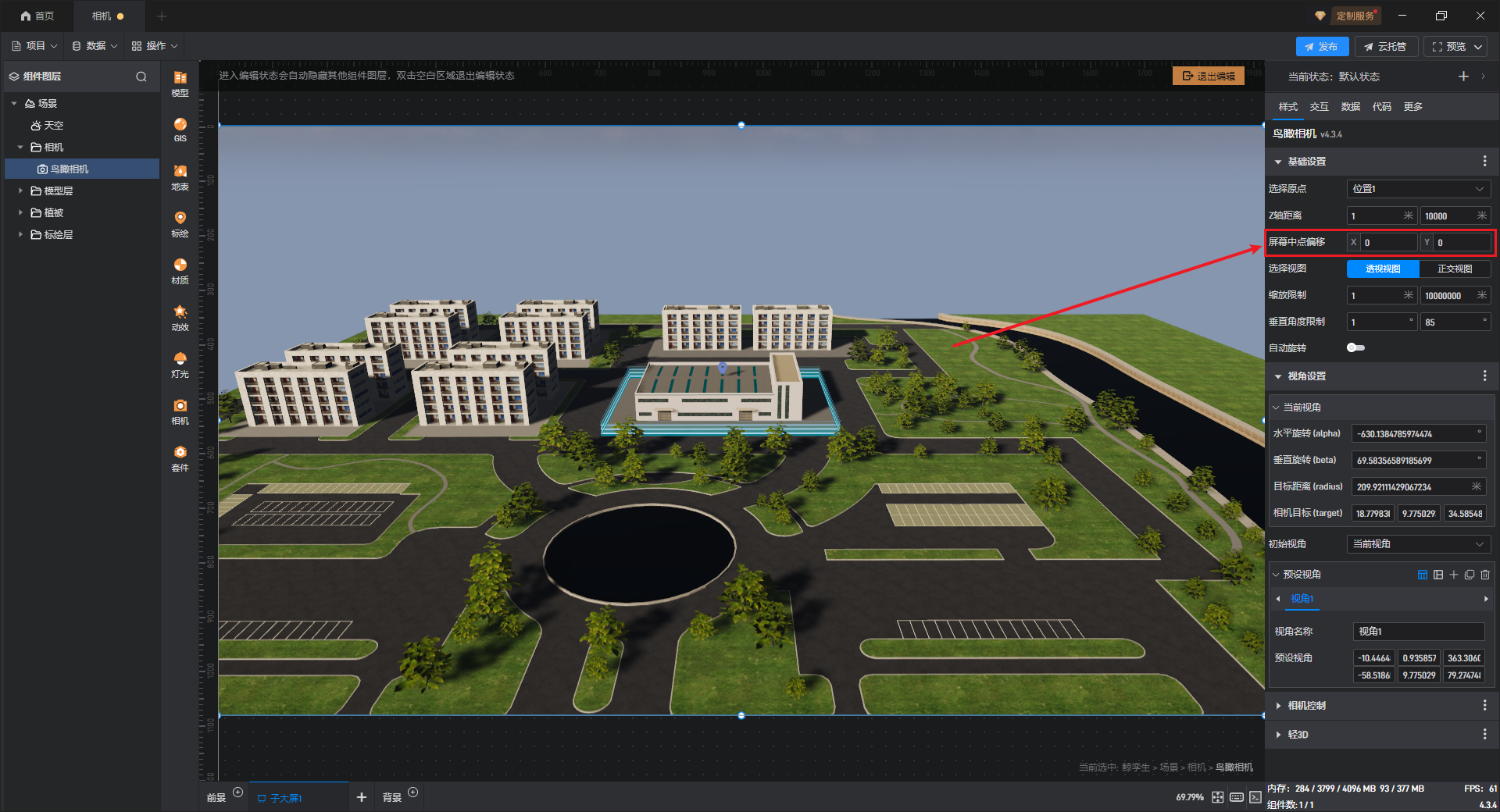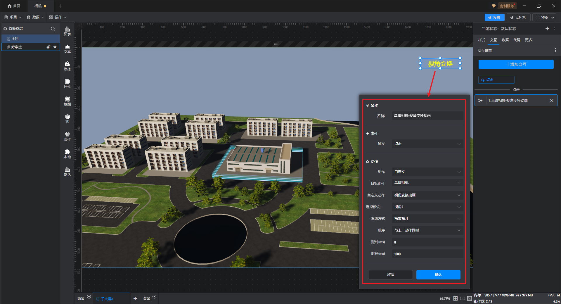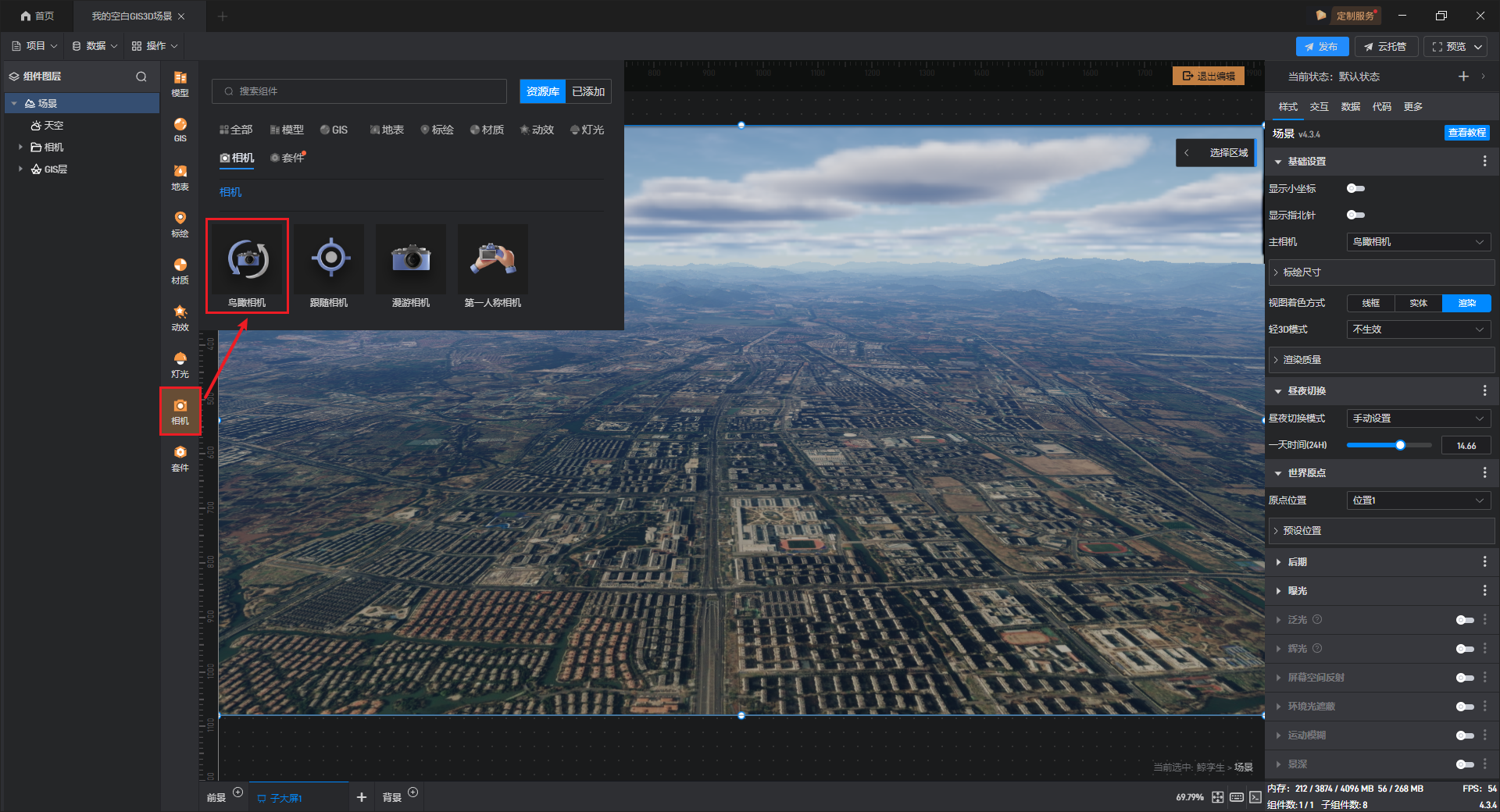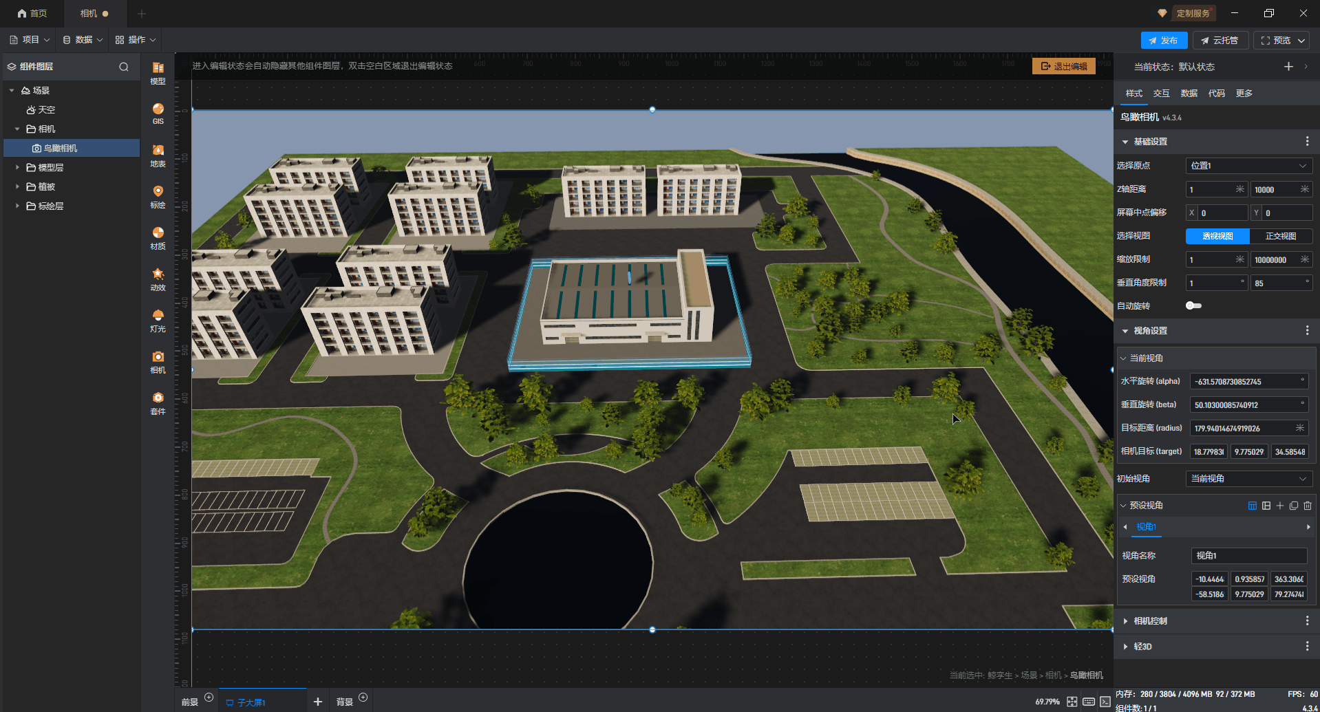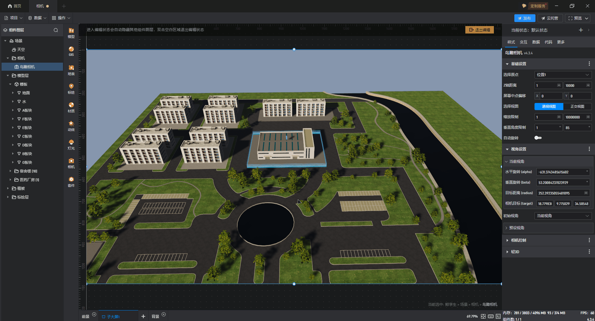 “轻 3D”功能通过将复杂的立体模型预先渲染成高质量的二维平面图片,从而大幅降低了实时渲染对硬件设备的要求,在运行三维项目时,使配置较低的计算机或移动设备也能实现流畅的浏览和交互。在此处可以添加鸟瞰相机的“预渲染视角”,点击查看具体教程 →设置轻 3D。
