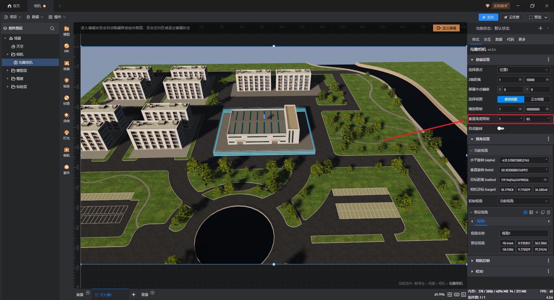 指在景中以 Z 轴“0”点为中心,最大视角和最小视角限制区间,默认设置最小角度 0°,最大角度 85°,可以根据需要进行设置。