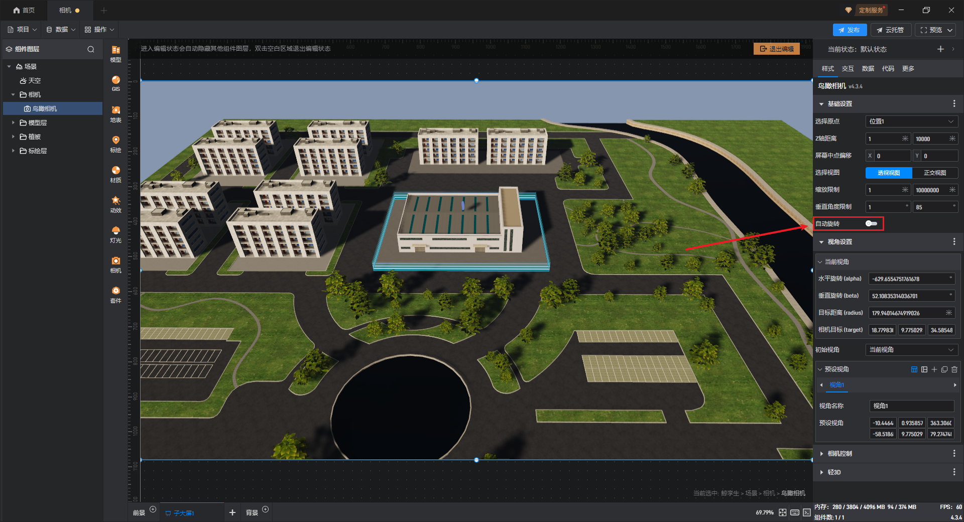 开启后场景会以“原点”为中心顺指针自动旋转,默认关闭。通常在展示产品时可以用到自动旋转。