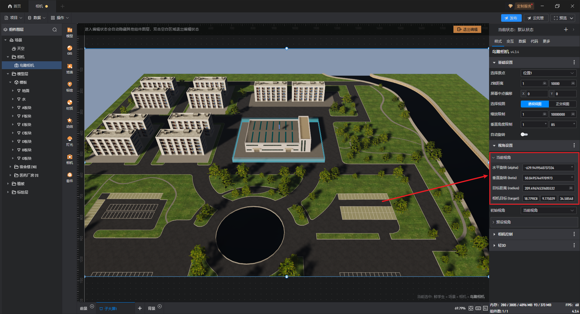 当前预览场景的视角,包括水平旋转、垂直旋转、目标距离和相机目标四个参数。