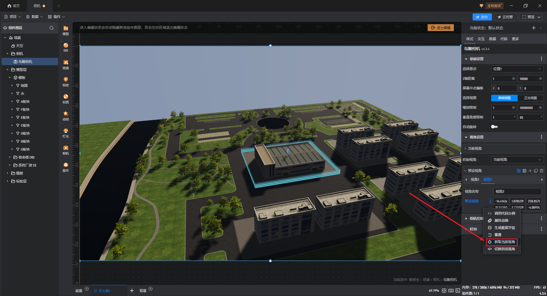 通过鼠标调整缩放到想要的视角后,点击预设视角后的三个点(扩展设置菜单),可以选择获取当前视角,把当前视角存在预设视角中,方便后续做一些视角动画。