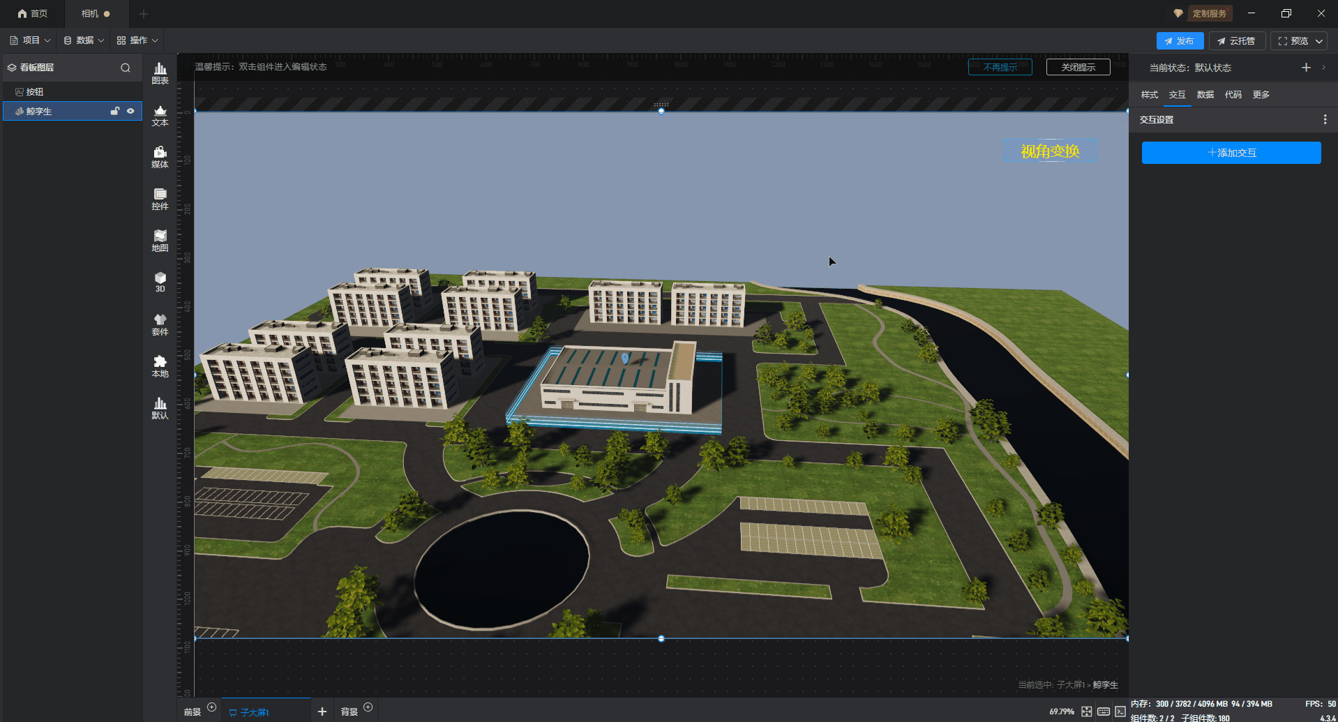 在创建鲸孪生组件时,系统会自动创建一个主相机。“双击”进入鲸孪生组件编辑界面,在左侧组件图层“相机”中,可以看到一个“鸟瞰相机”,这就是主相机。鸟瞰相机可以从高处俯瞰整个场景,提供更广阔的视野,通常用于展示整个系统的概览图。