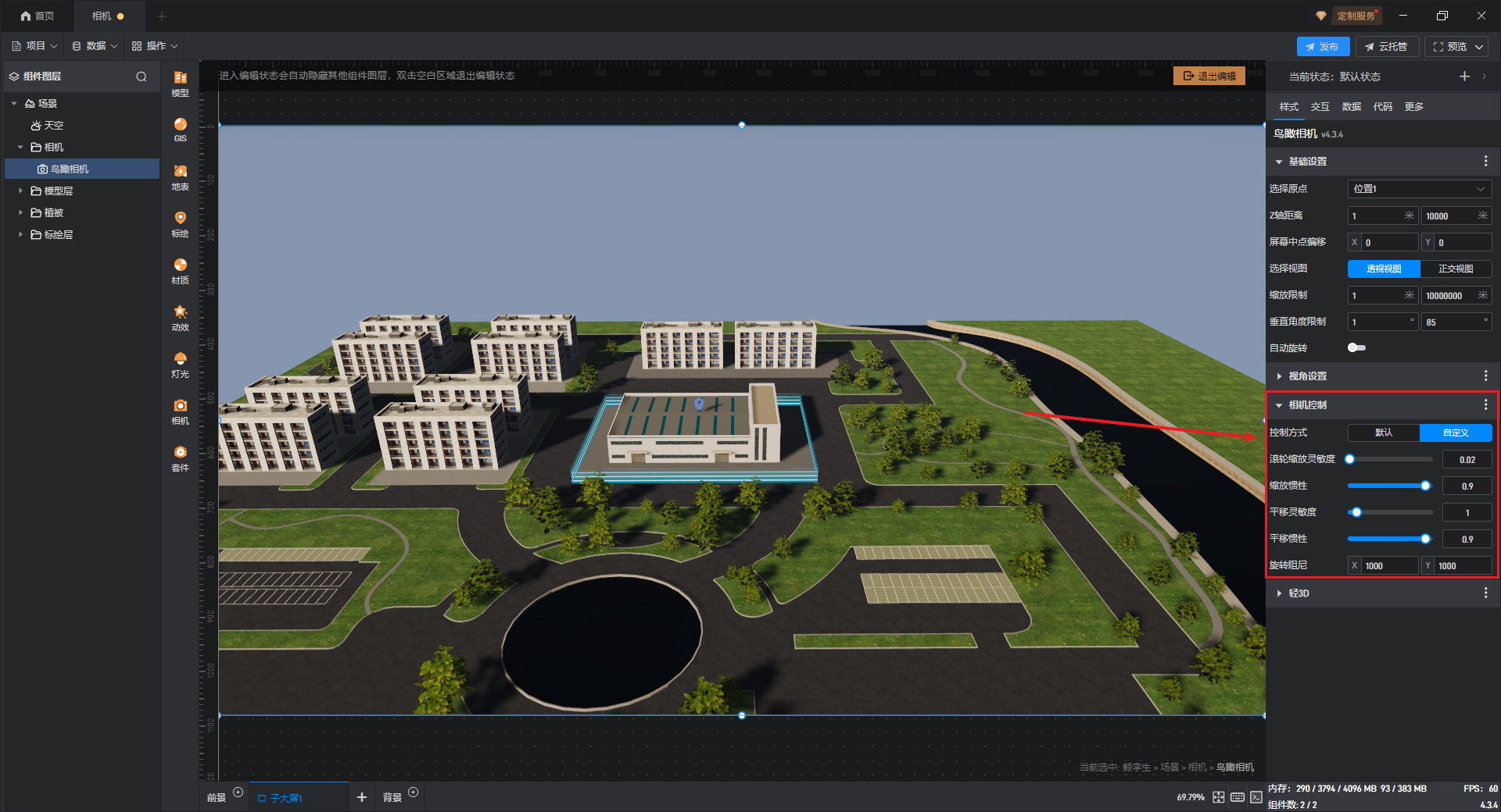 鸟瞰相机有两种相机控制方式,分别是“默认”和“自定义”,选择“自定义”方式可以对滚轮缩放灵敏度、缩放惯性、平移灵敏度、平移惯性和旋转阻尼进行设置。