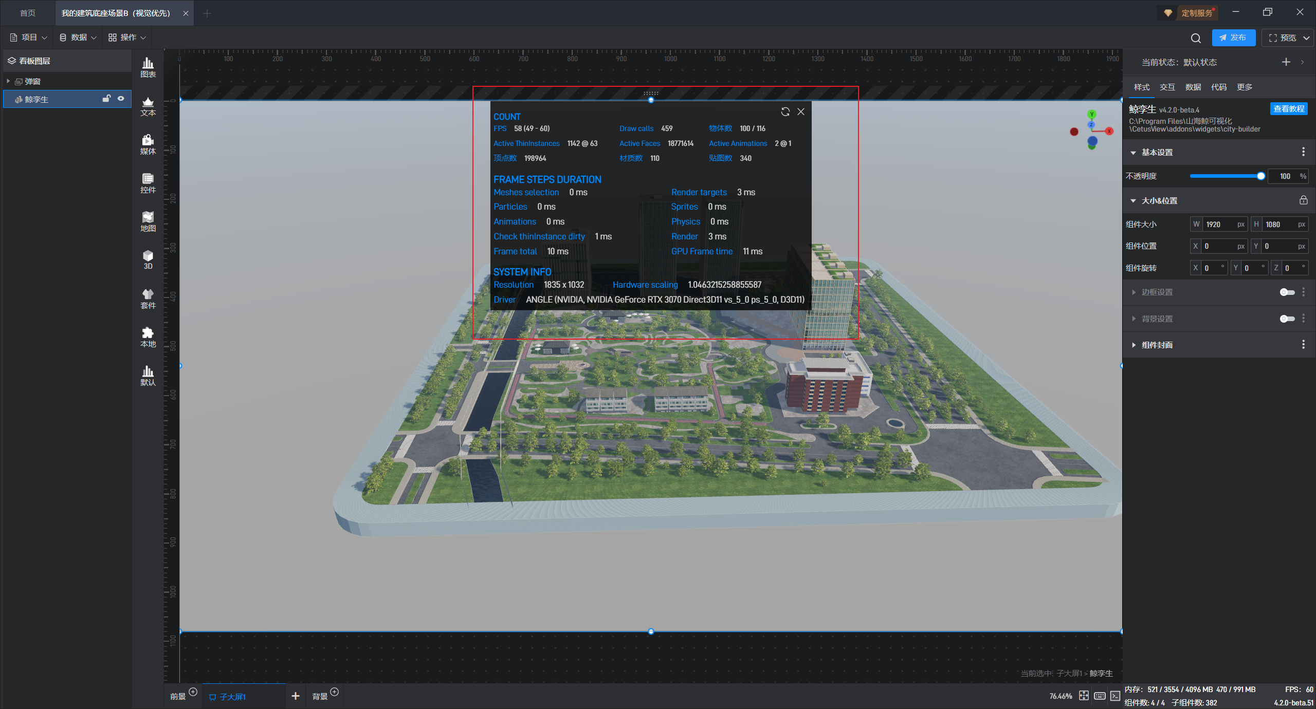 除了倾斜摄影以外,大部分的运行时卡顿都是由 3d 元素导致的。而 3d 导致的运行时卡顿情况繁多,也是最难排查的,对于 3D 场景来说,首先我们需要调出我们的 3D 调试窗,只要当前选择的是 3d 场景,同时按说 ctrl+.即可调出调试窗: