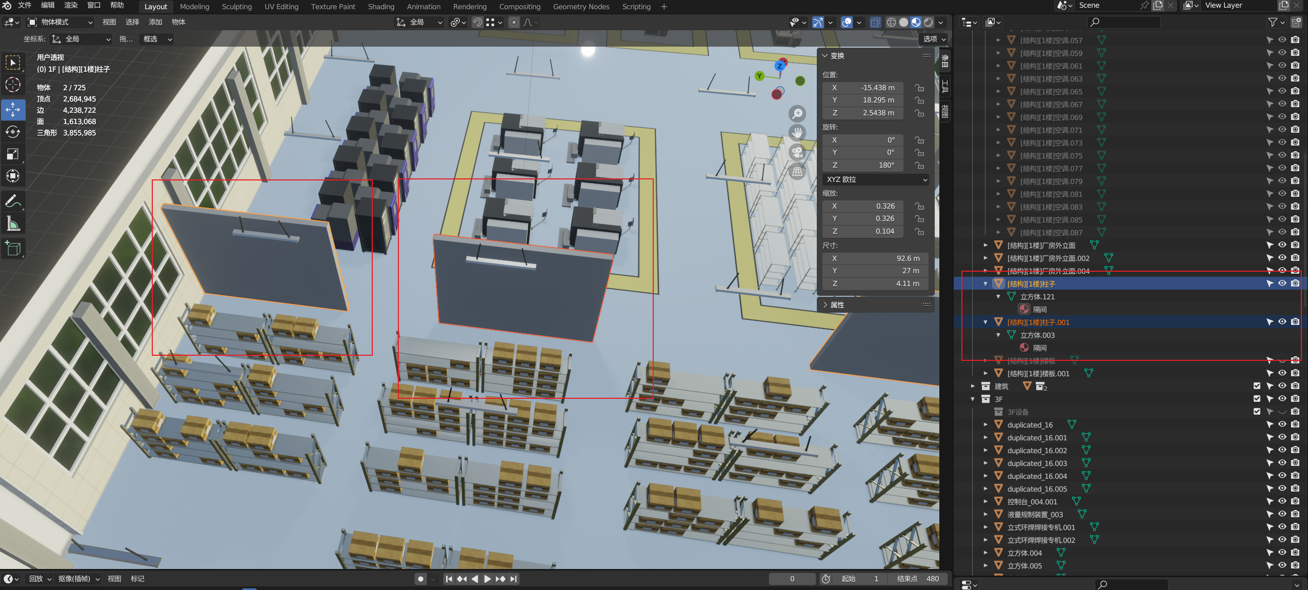 对于使用相同材质的物体,我们可以选中他们后按住 ctrl+J 将他们合并成一个物体,如下图所示的两堵墙,使用相同的材质,就可以帮他们合并成一个物体: