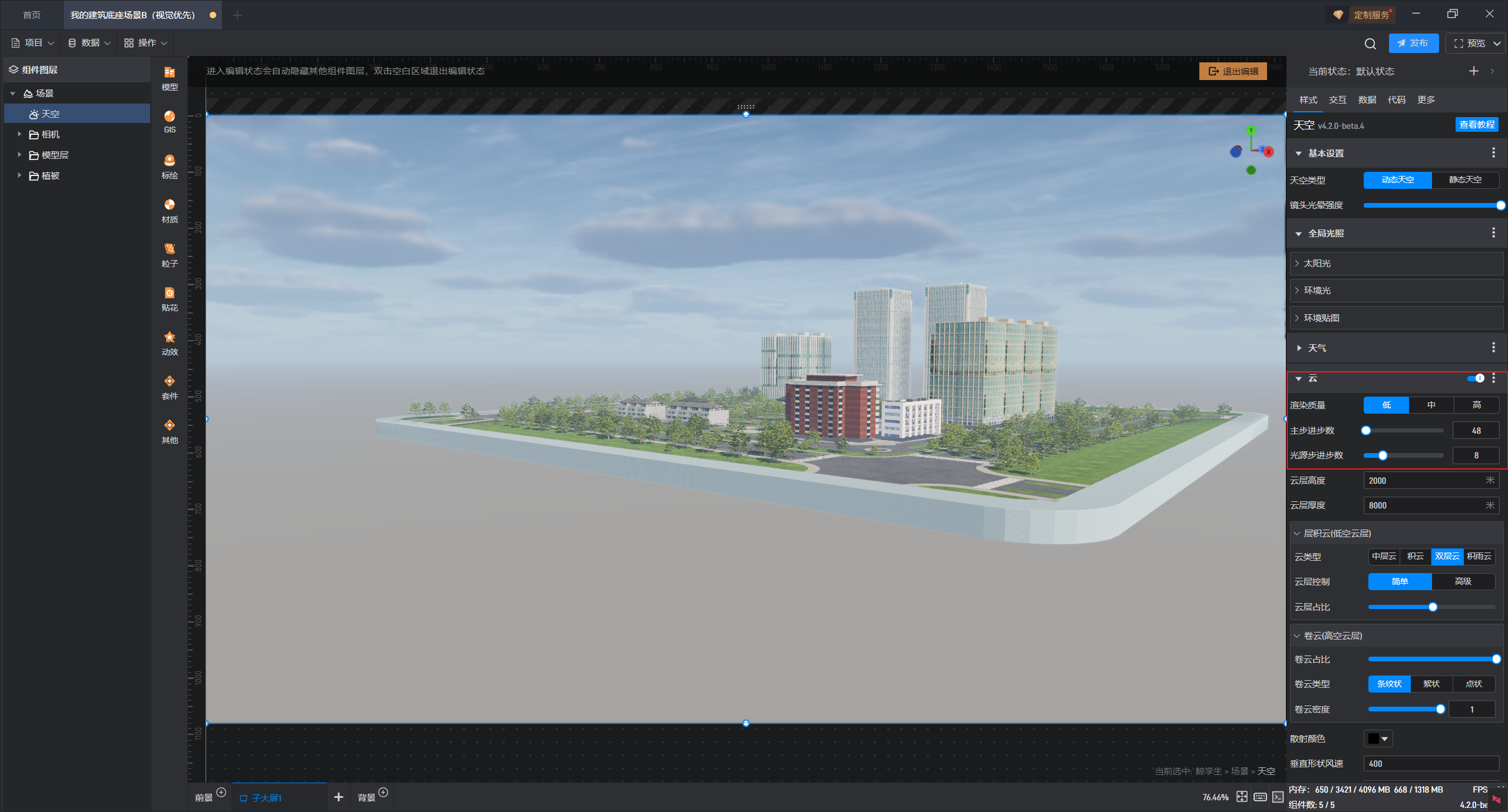 天空中体积云对性能消耗较大,当 FPS 较低时,优先调低体积云的渲染质量和步进次数,或者直接关闭体积云: