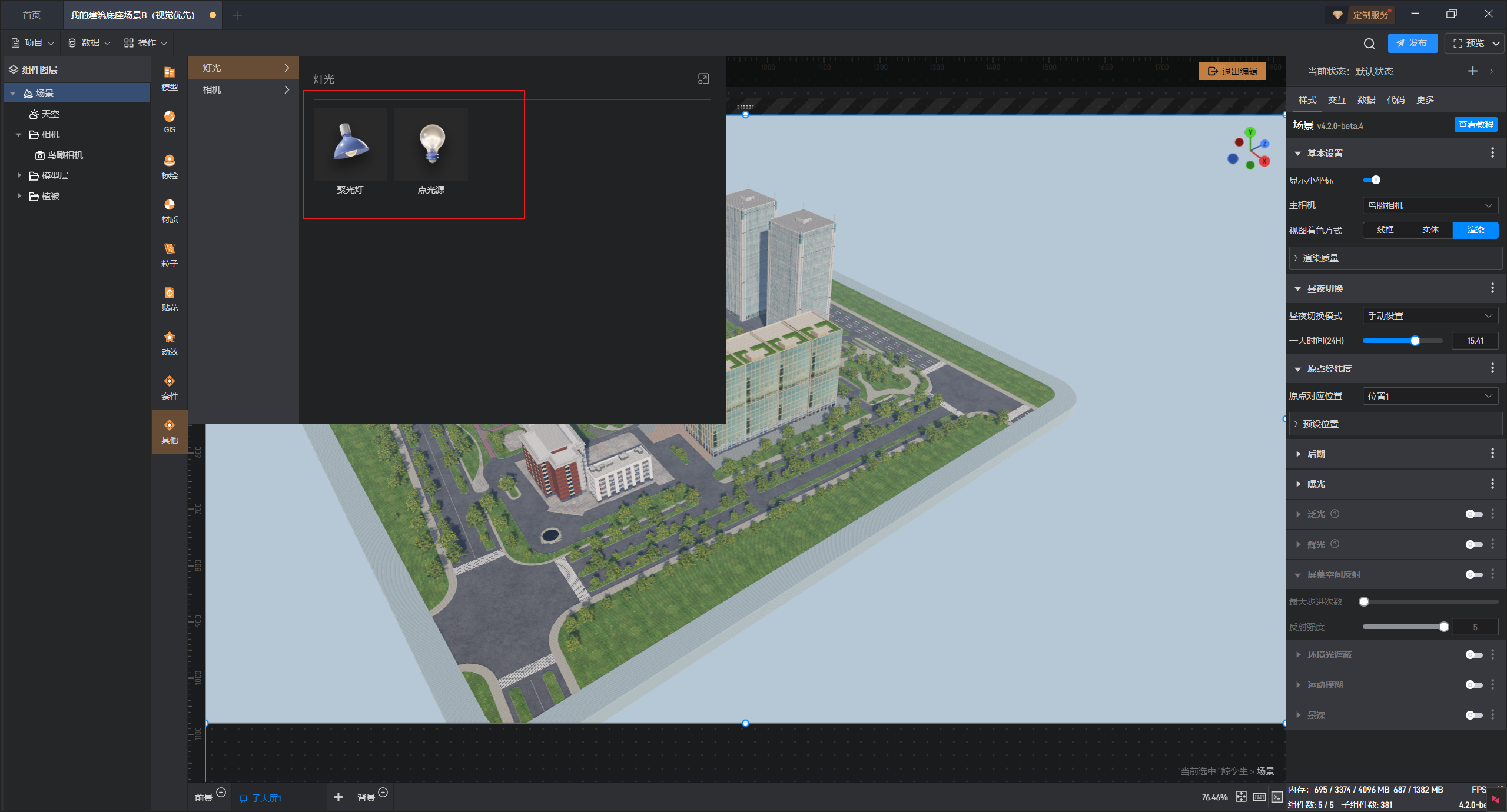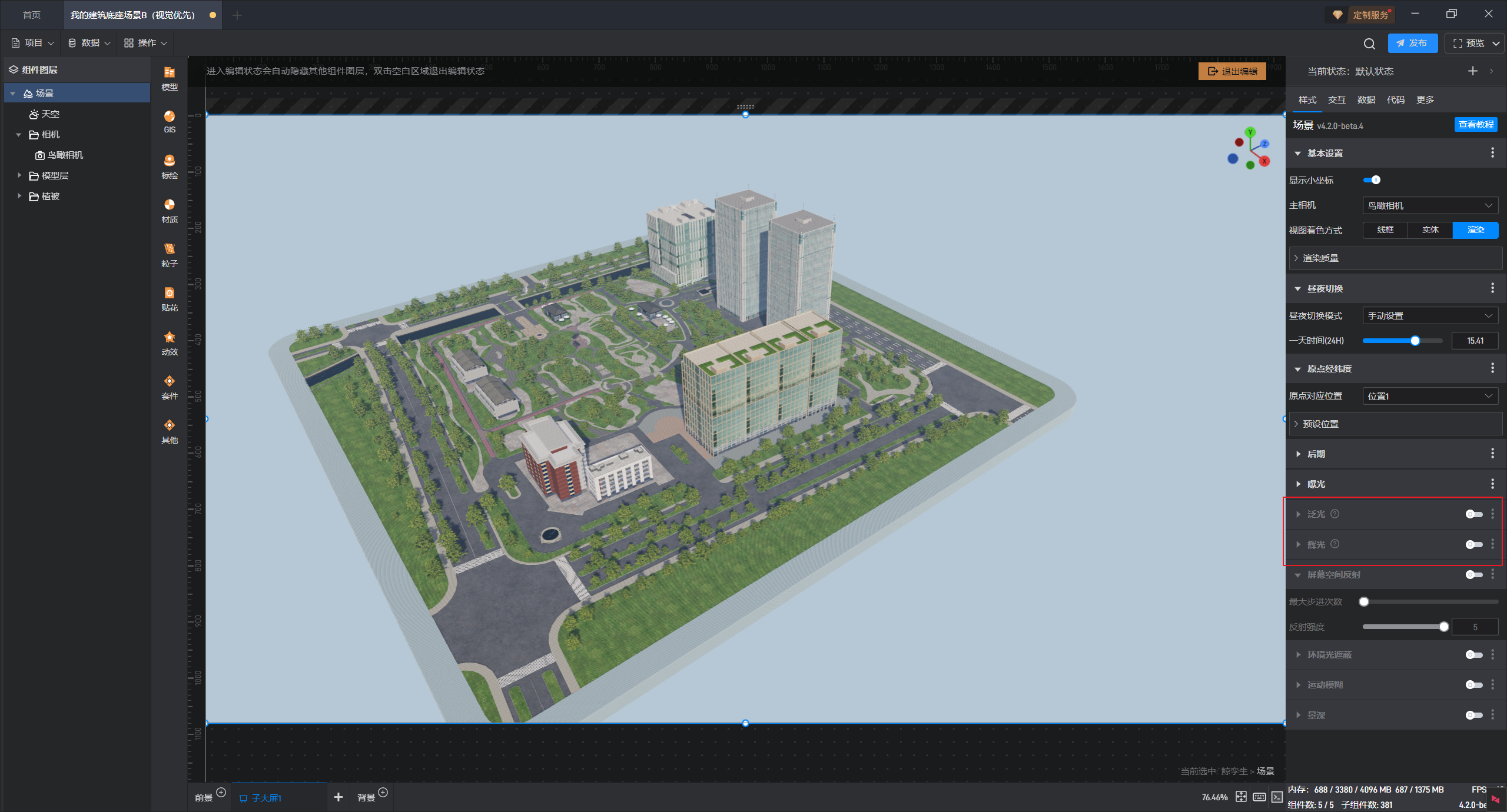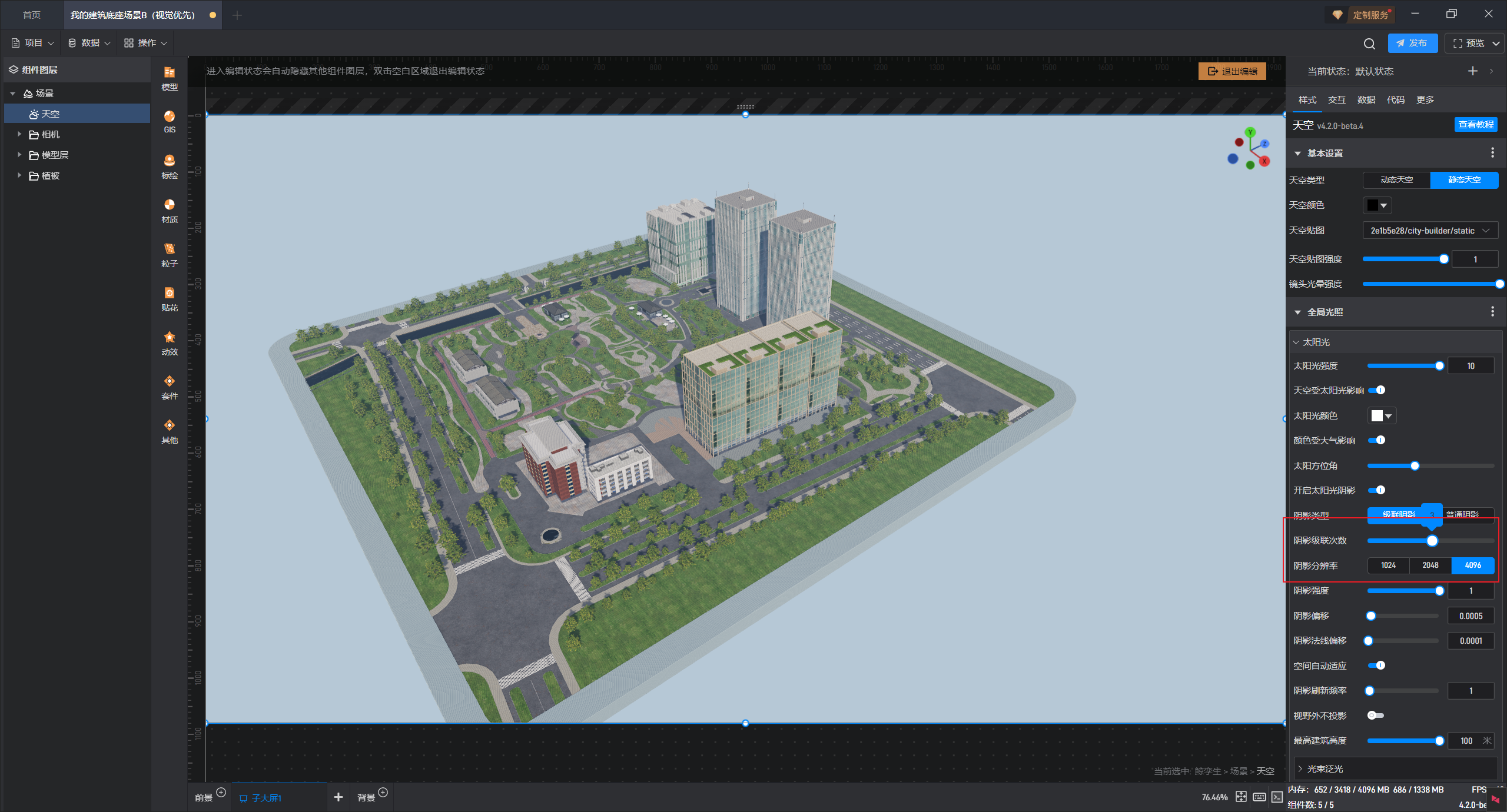 如果 FPS 依然很低,则建议修改成普通阴影,在整个空间很大的情况下,普通阴影可能会很模糊,此时我们可以关闭控件自适应,并设置一个范围,这样只有这个范围内的物体会投射阴影,这样可以大大增强普通阴影的质量: