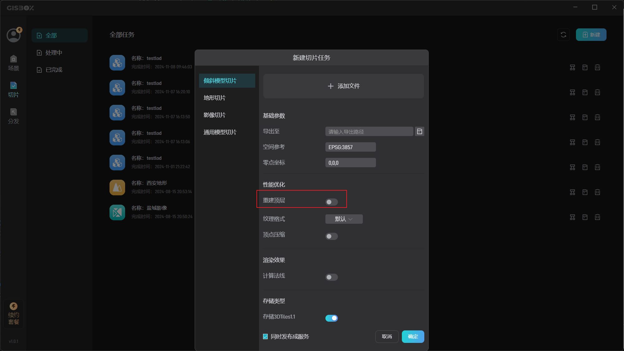 如果大家使用 GISBox 将 OSGB 转换为 3dtiles,那么转换时勾选重建顶层即可,具体如下图所示: