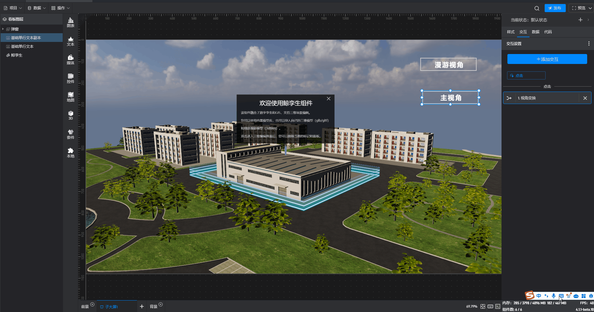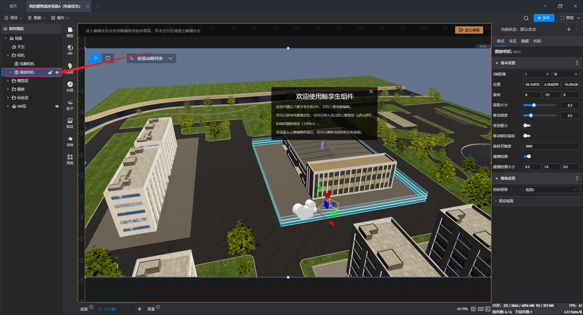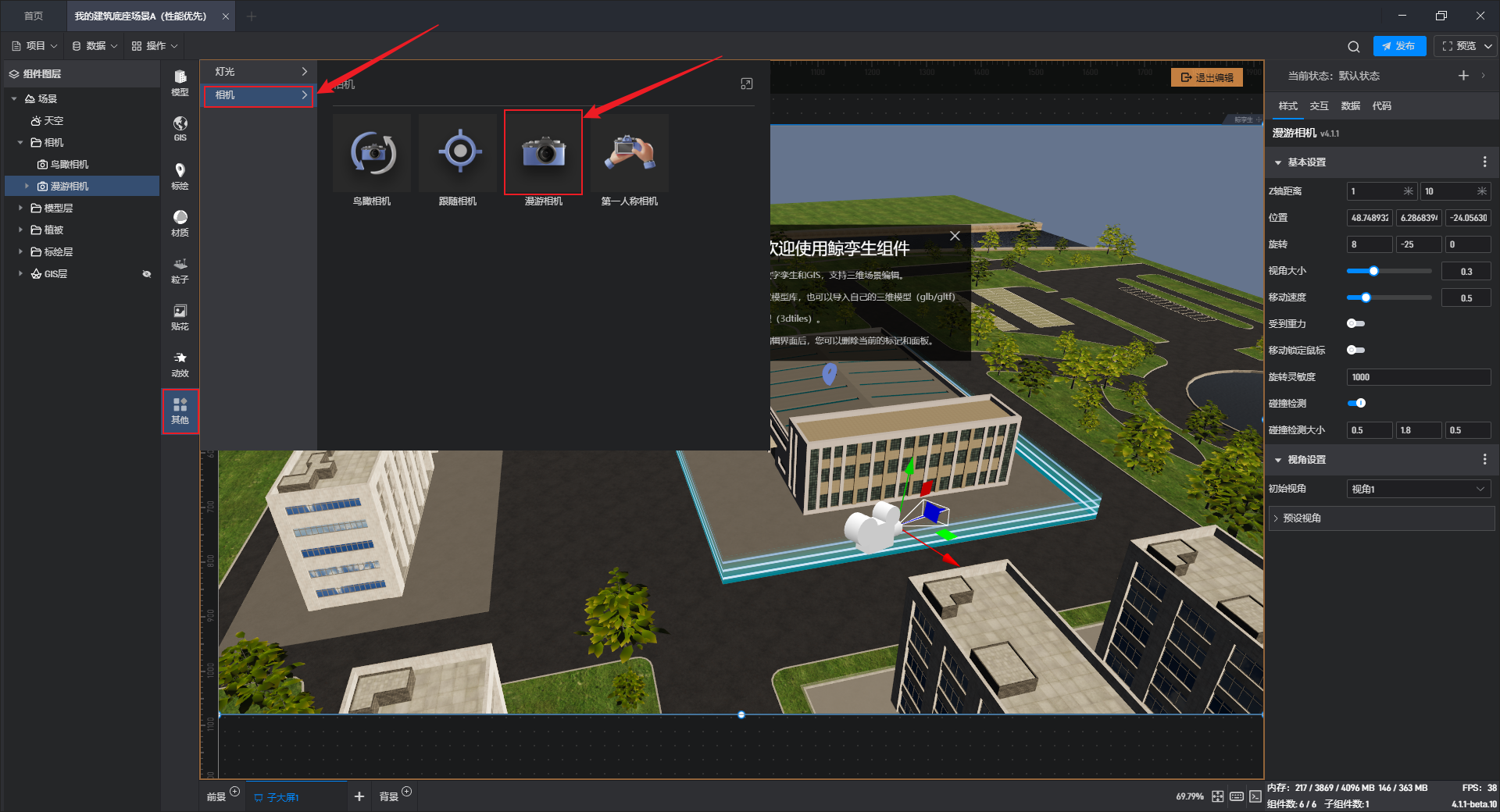 添加鲸孪生组件后“双击”进入编辑界面,在左侧菜单栏其他中点击“相机”即可看到。